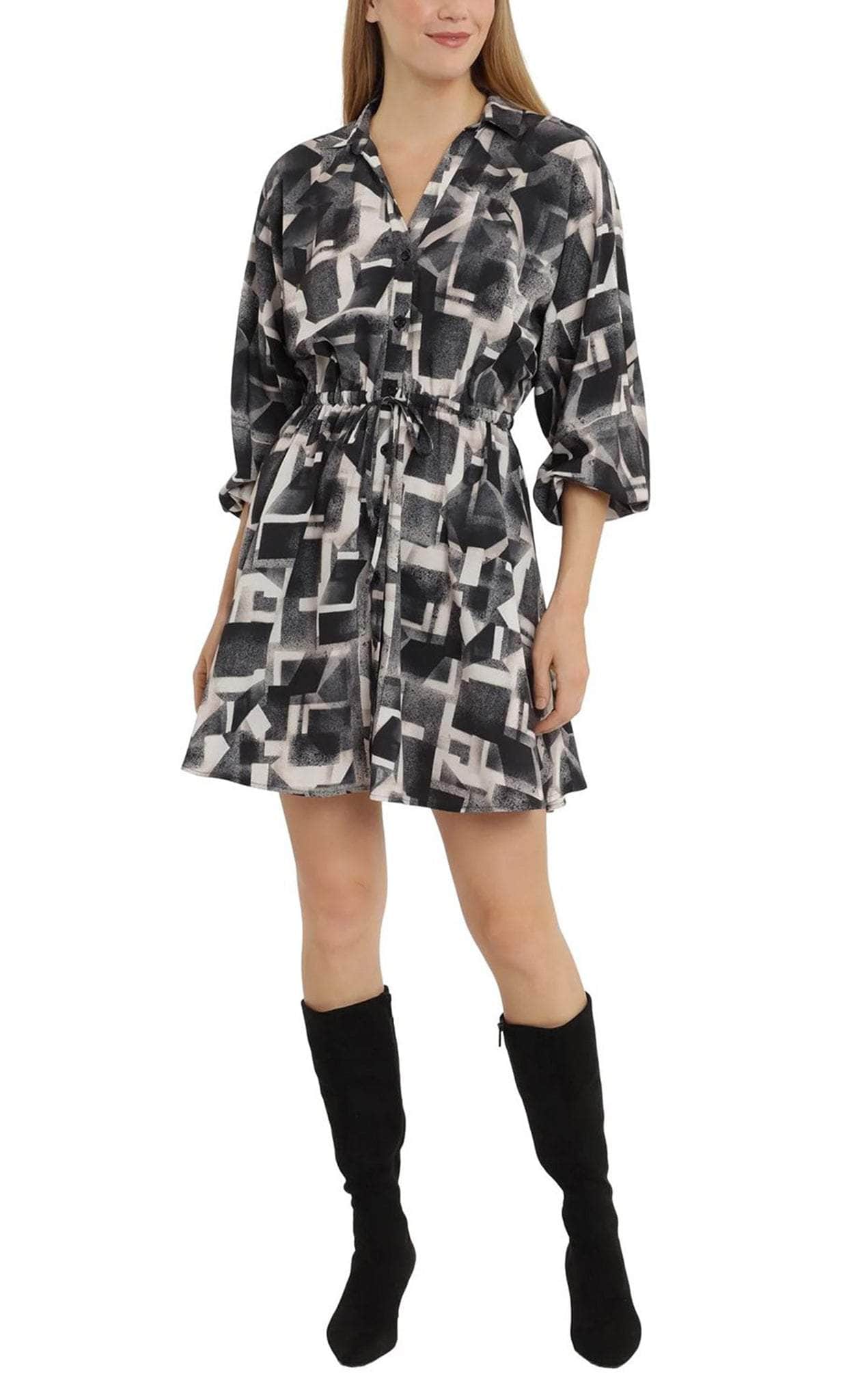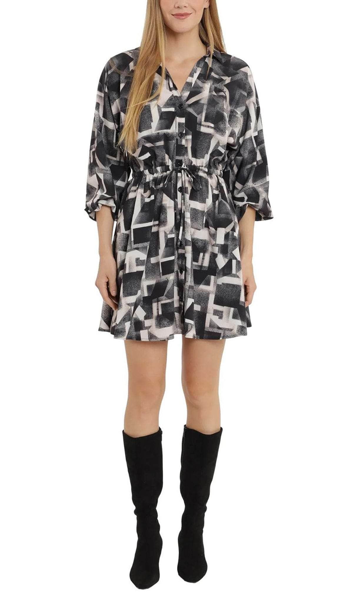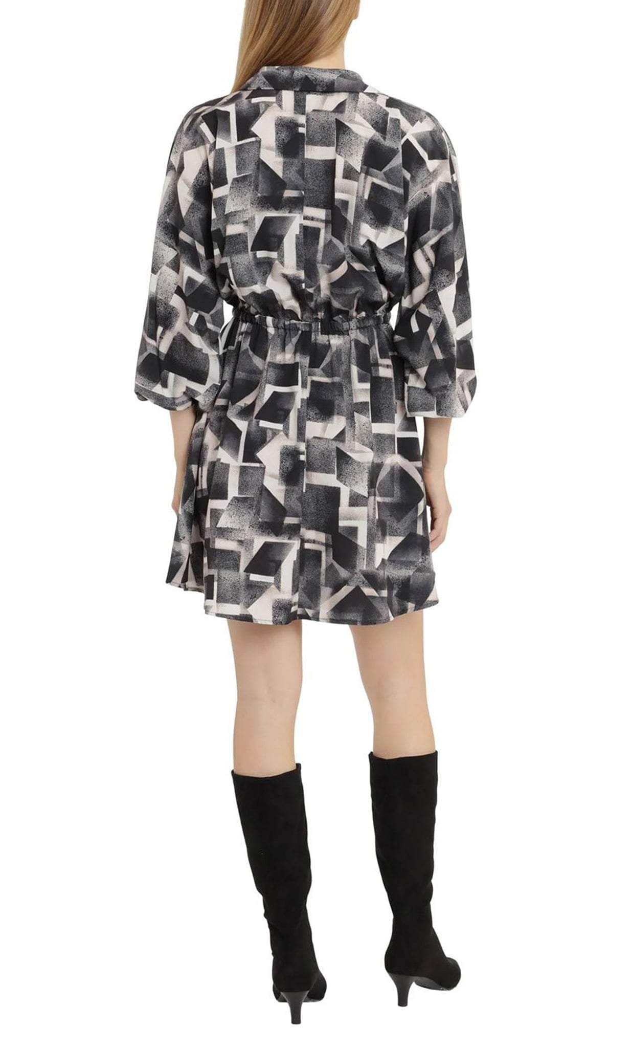 Be ready to fascinate everyone in this checkered design by London Times T6017M. This stunning short sheath dress features unique dolman sleeves and a flattering V-neckline that adds a touch of elegance to the overall design. It also features a playful yet sophisticated printed pattern and a tie waist that adds a stylish touch, while the enclosed back gives the dress a more formal and refined look. Mesmerize everyone in this charming London Times T6017M creation. Model is wearing Ivory Grey color.