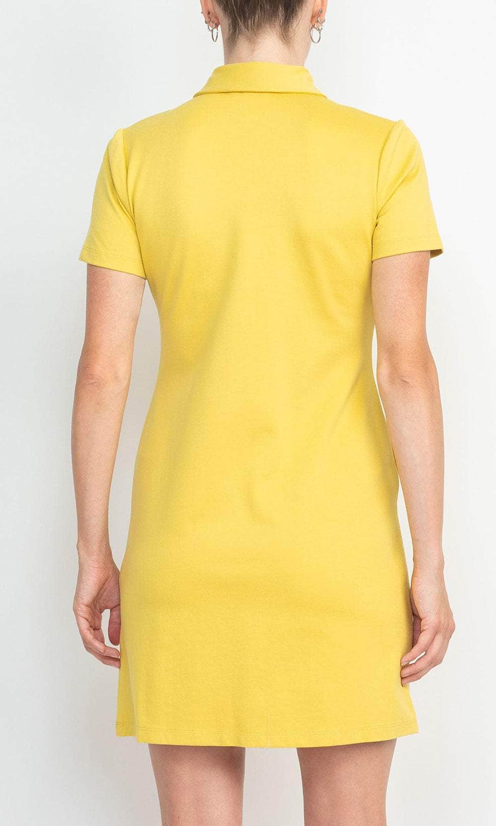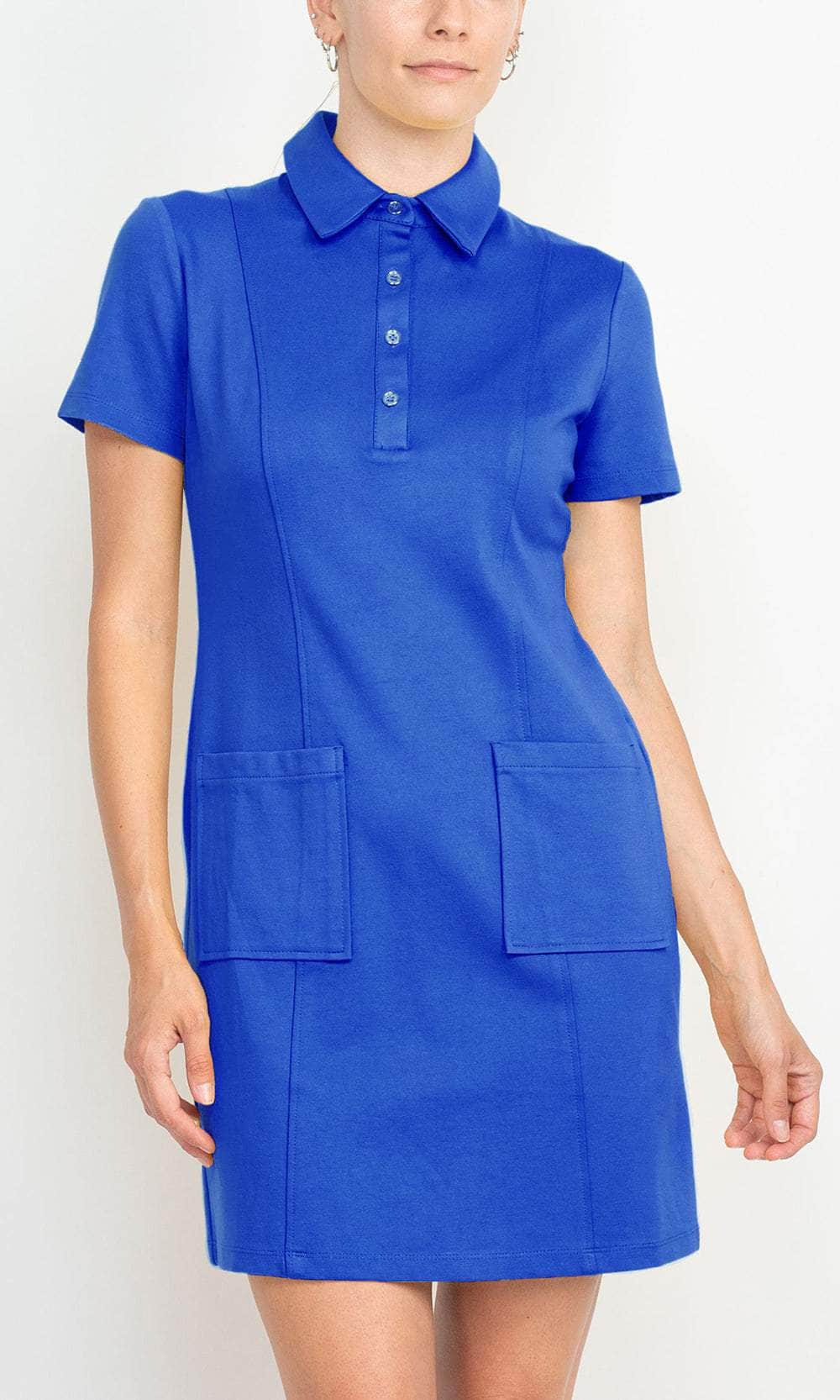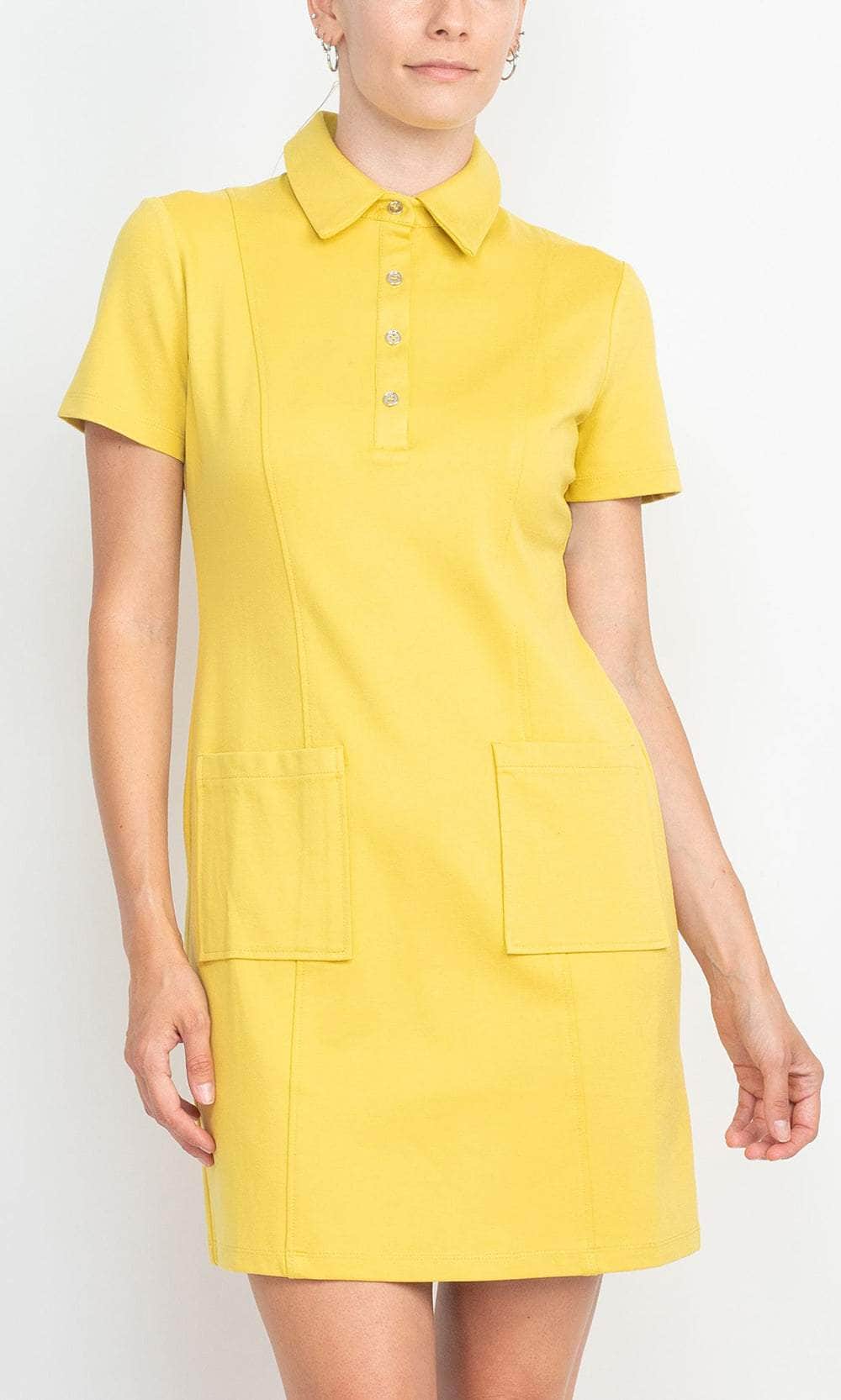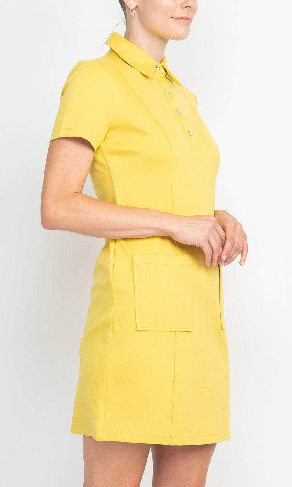 Showcase a fashion sense that flourishes a chic style in this London Times T6053M creation. Immaculately tailored to flaunt the feminine form, this beauty parades with a jewel and collared neckline. Trailing with a button down bodice and a full back, the short sleeve dress shows a sheath skirt with front patch pockets and a mini hemline. Be the delight of the crowd while looking stunning in this London Times masterpiece. Models are wearing the Azure and Dijon colors.