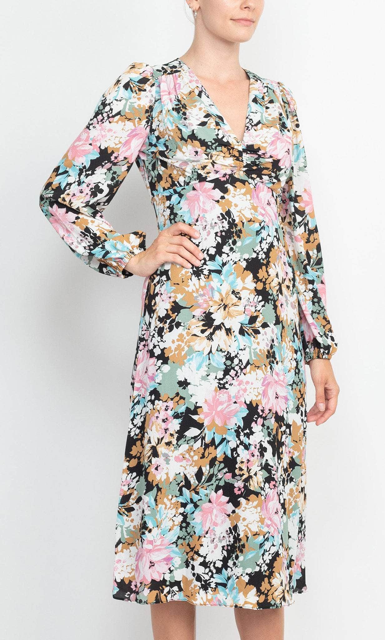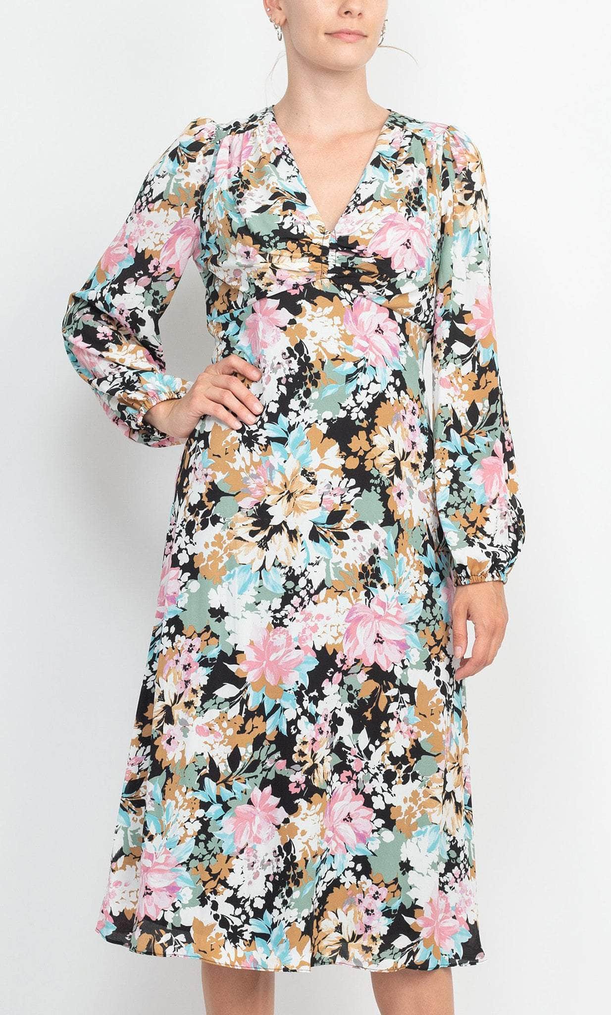 Set a style that would engage everyone in this enchanting evening in this Immediate Apparel T6080M. This midi dress has floral prints all over that draw attention to you where it belongs. Has long bishop sleeves that are matched to the high waisted bodice's V neckline. The back has a zipper enclosure and an A-line silhouette that is tea length in size. You are sure to turn heads in this Immediate Apparel T6080M dress. Model is wearing Black Sage color.
