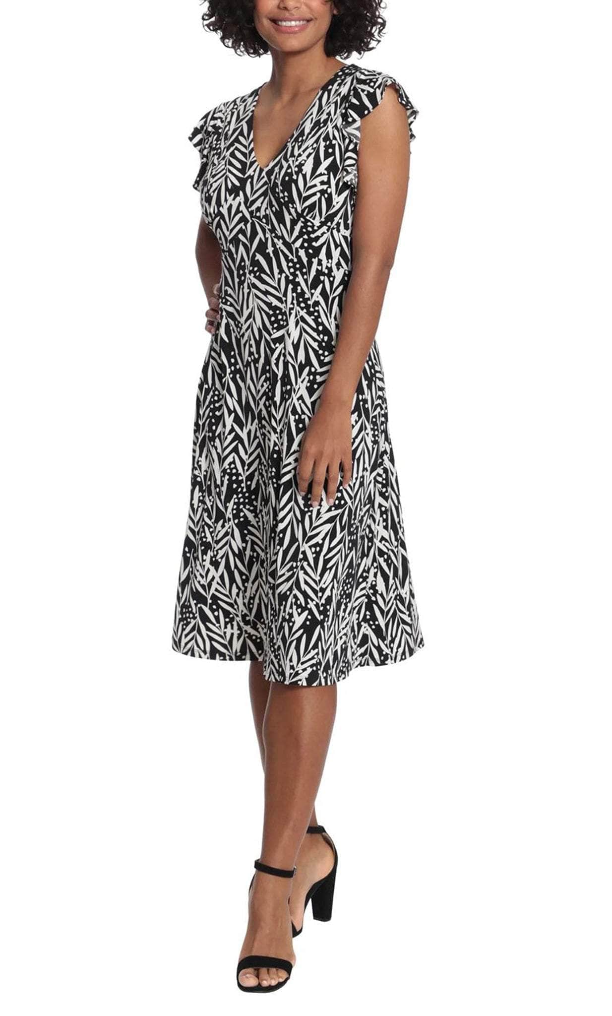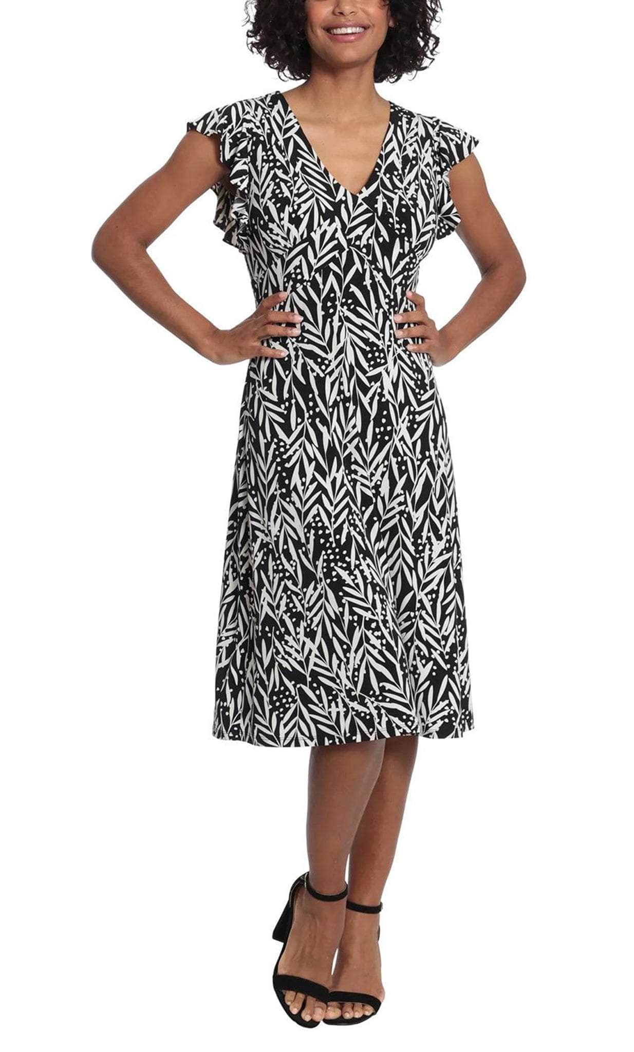 Have a blast in this fashionable London Times T6085M. This charming dress features short ruffled sleeves and a flattering fit-and-flare silhouette, perfect for any occasion. The dress is made of comfortable jersey material and has a closed back for a sleek look. The natural waistline cinches in with a figure-flattering effect, while the long A-line skirt flows gracefully to the floor. A classic V-neckline adds a touch of elegance to the overall design. Waltz into the party looking fabulous in this London Times T6085M! Models are wearing Black/White and Green/White colors.