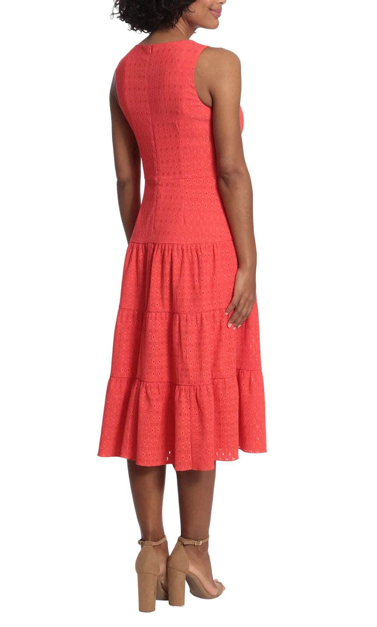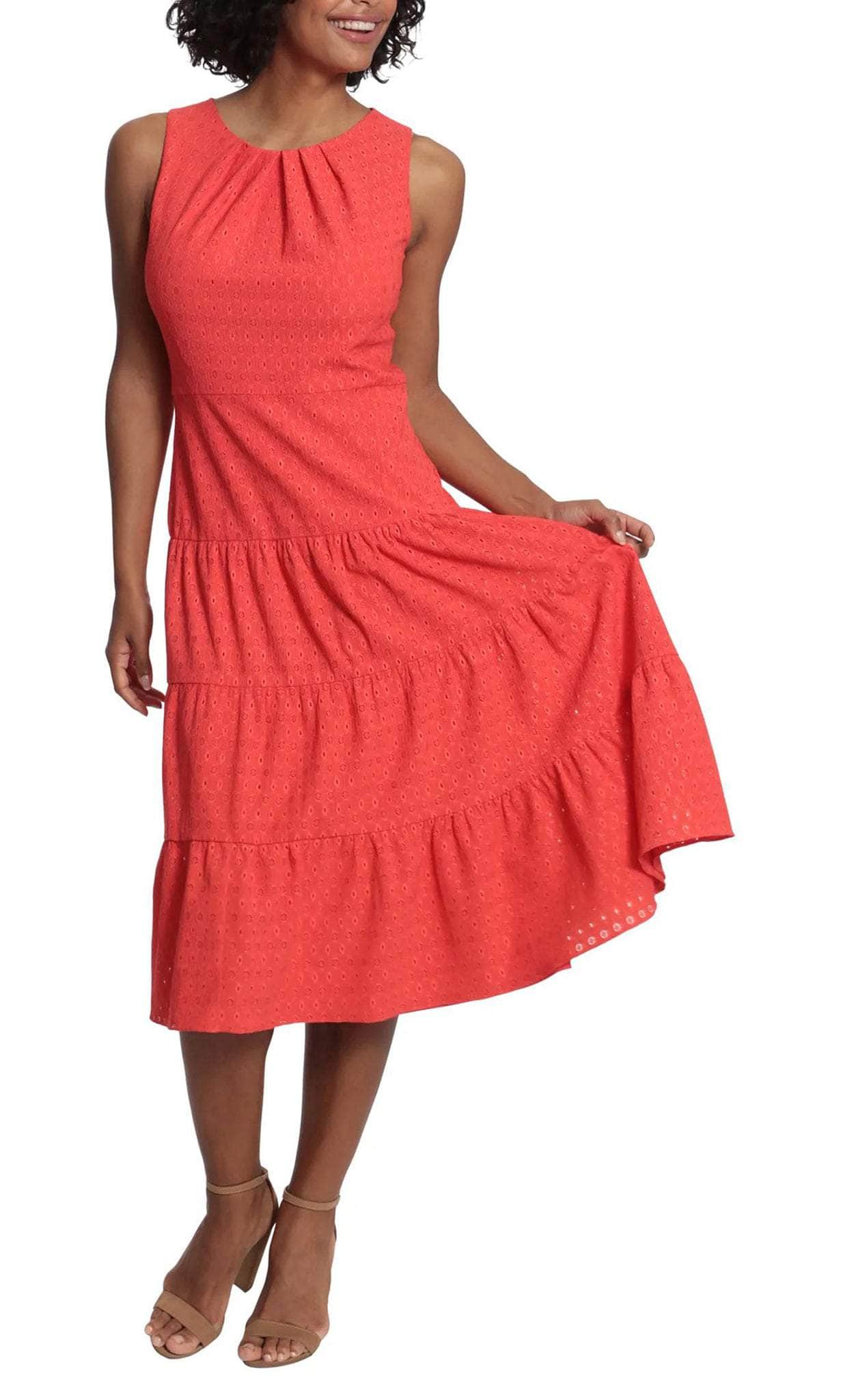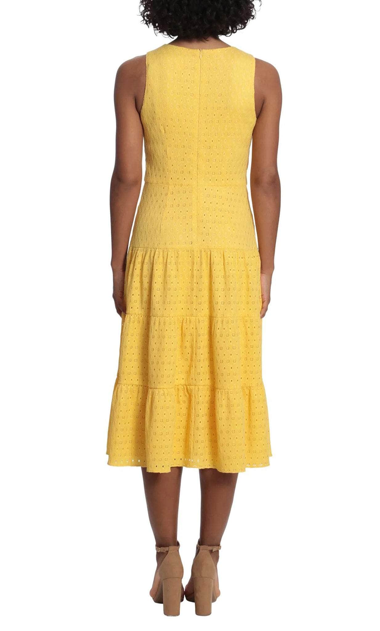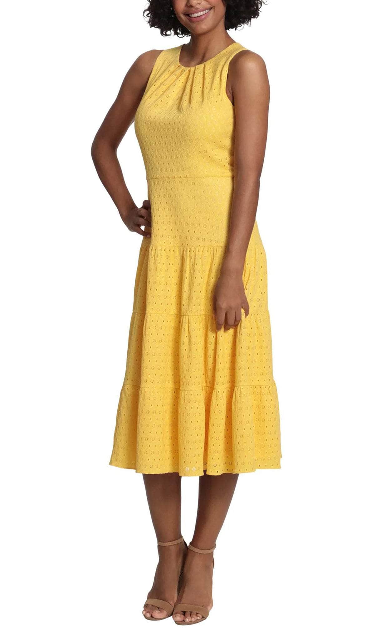 Embrace a style that is immaculately divine style that is also oh so comfortable in this London Times T6138M creation. Crafted with tailoring lines on a crinkle dot eyelet silhouette, this dress features a jewel neckline with pleated details and a sleeveless form. Styled with a full back and a zipper closure, this dress is accented with a nipped waist as the skirt flows into a tiered A-line design with a tea length hemline. Flaunt your feminine flair in full bloom in this London Times masterpiece. Models are wearing the Red and Yellow colors.