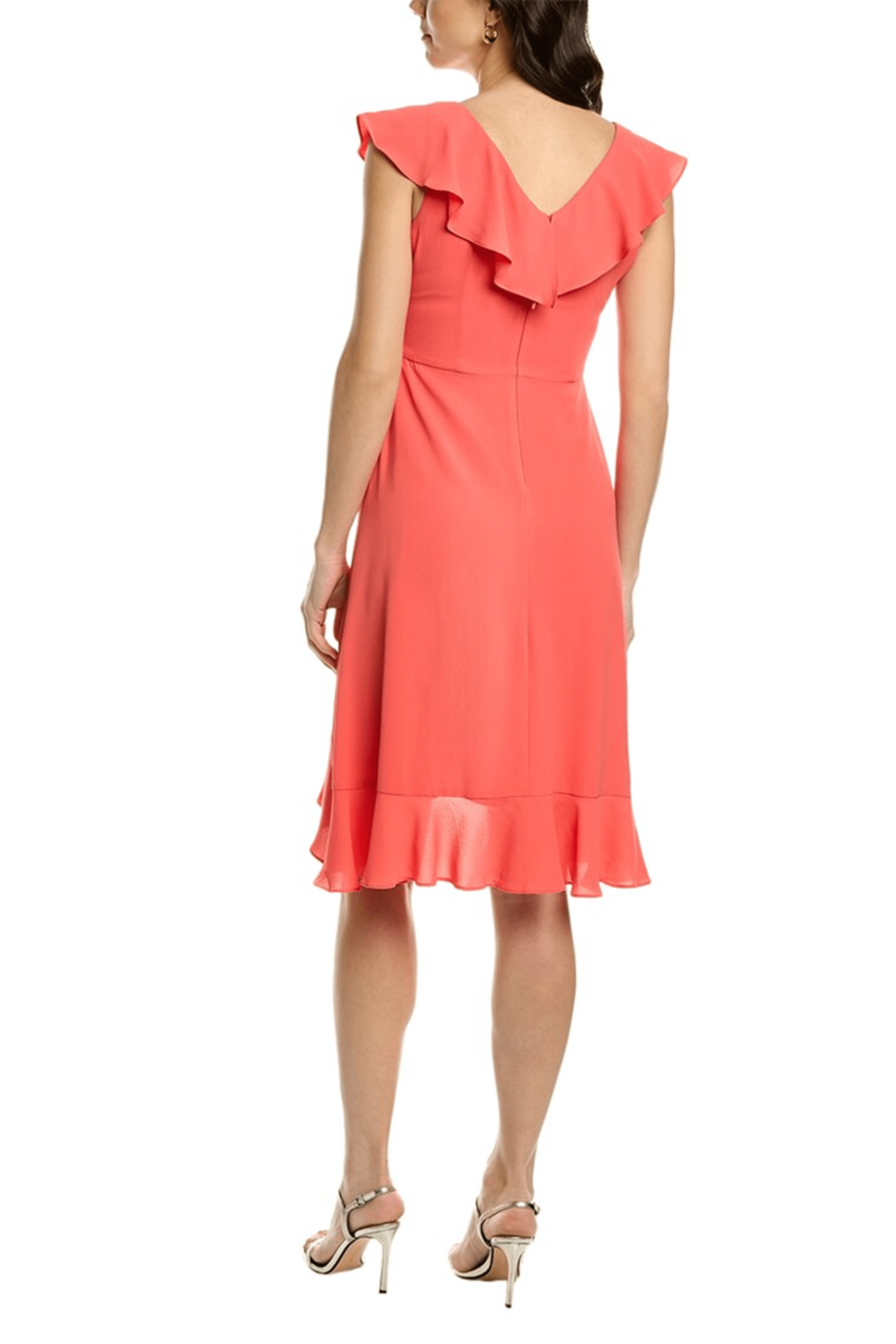 Embrace the vibrance of spring and summer with London Times T6183M, a delightful and chic frilly dress suitable for diverse occasions. Whether it's baby and bridal showers, gender reveals, or luncheons, this dress shines. Featuring a faux-wrap sleeveless design and an elegant V-cut back, it exudes sophistication. Enjoy the playful elegance of ruffly flutter detail along the V-neckline, knee-length skirt, and hem. Radiate beauty and grace at your next special event with London Times T6183M. Model is wearing Coral color.
