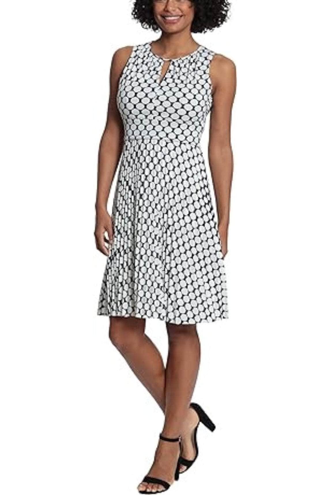 | Details: | Sleeveless, Keyhole Detail Polka Dot, Back Zipper Closure, Pleated Skirt |