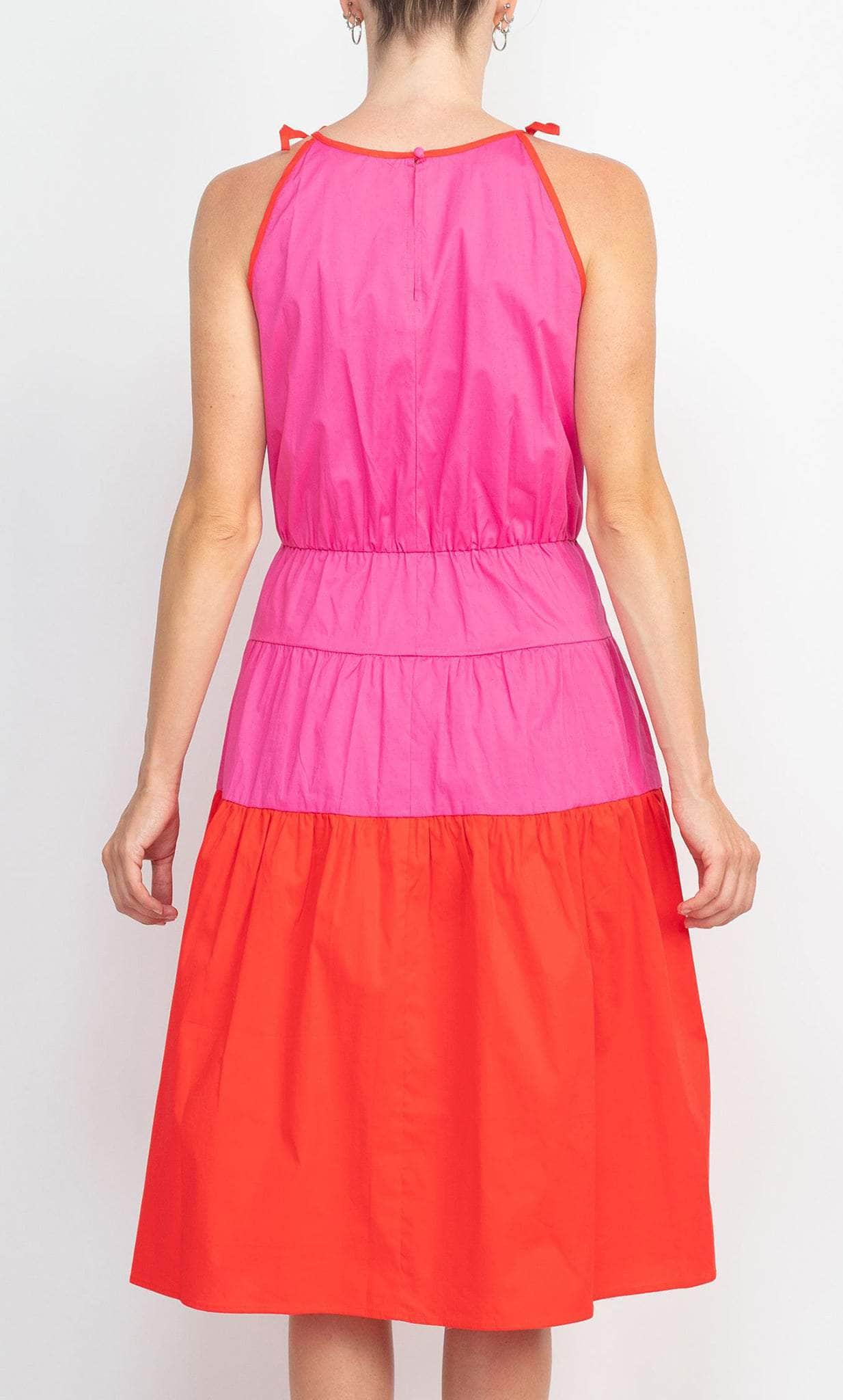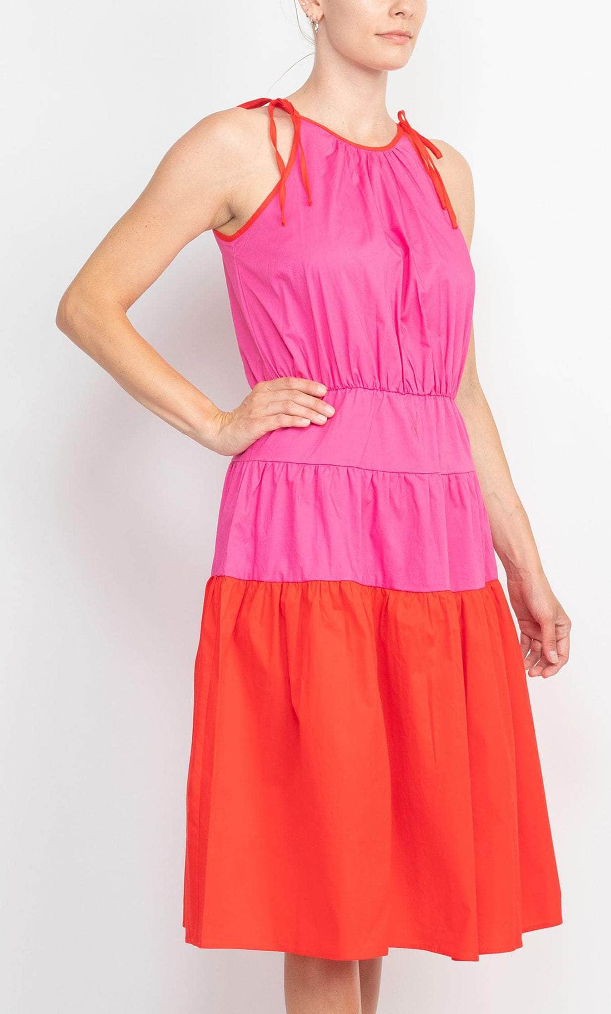 | Details: | Sleeveless, Tie, Ruched, Tiered, Two toned, Back button, Midi dress, Vibrant |