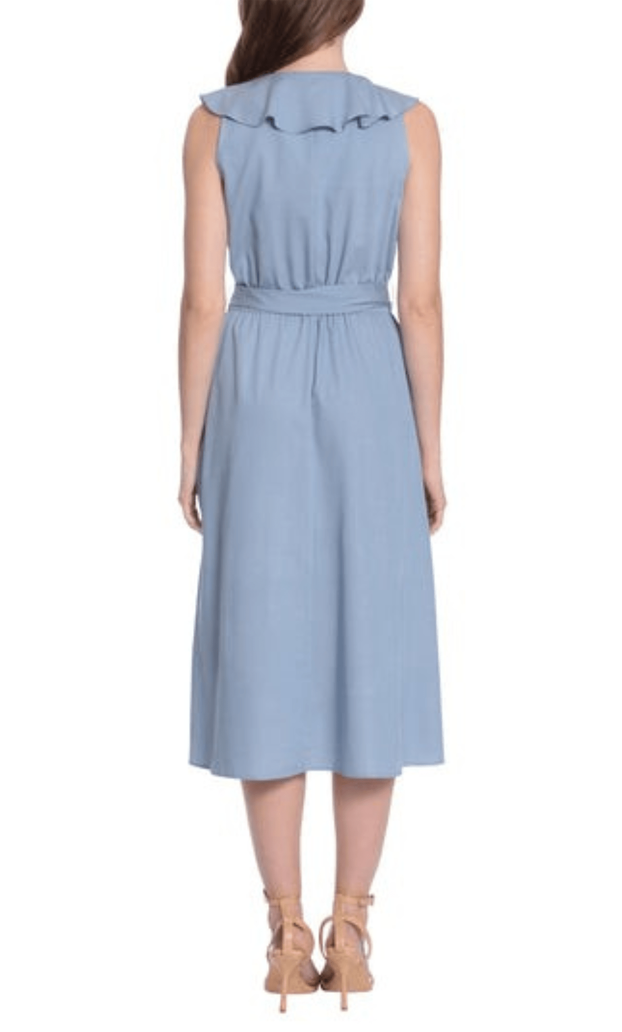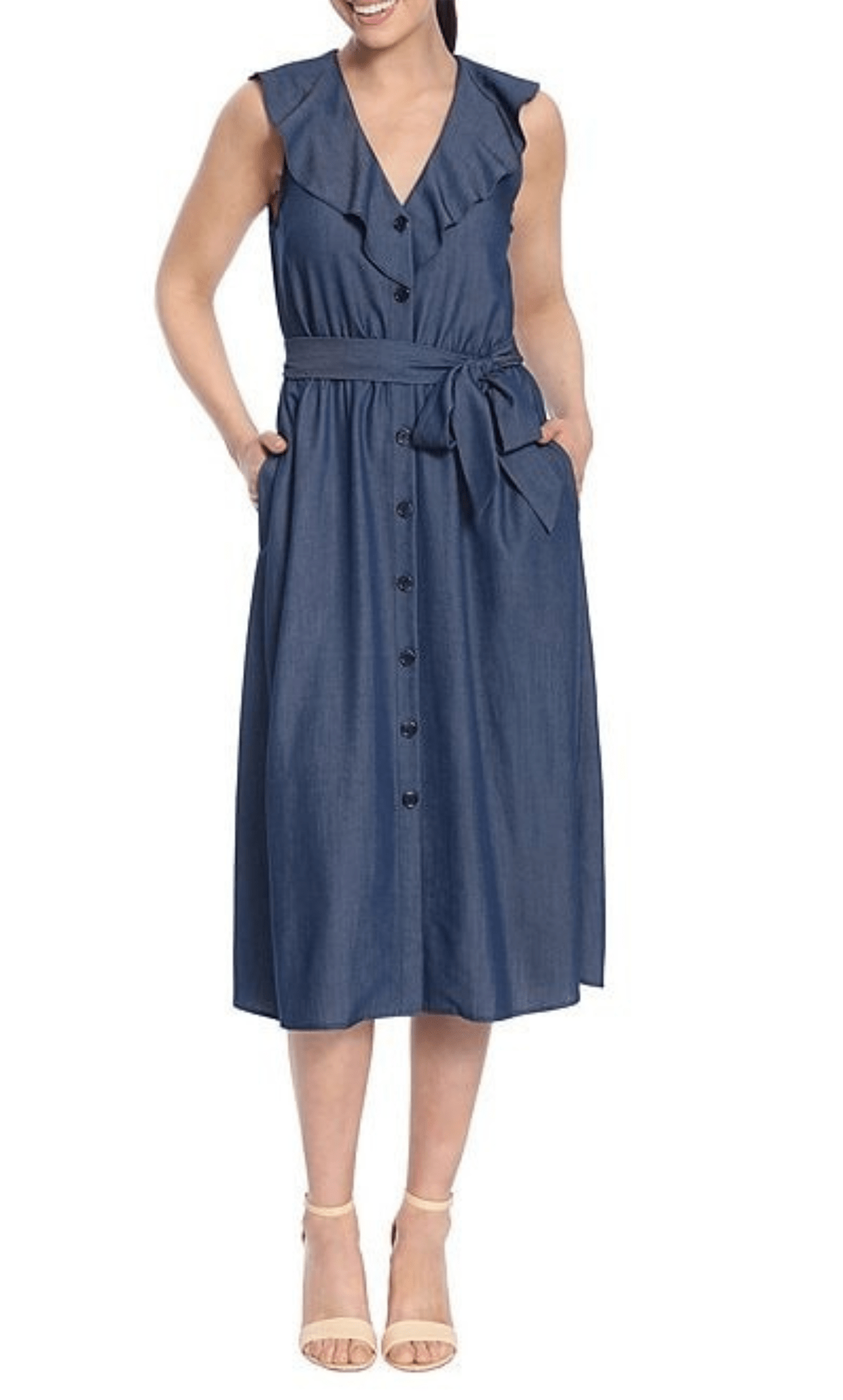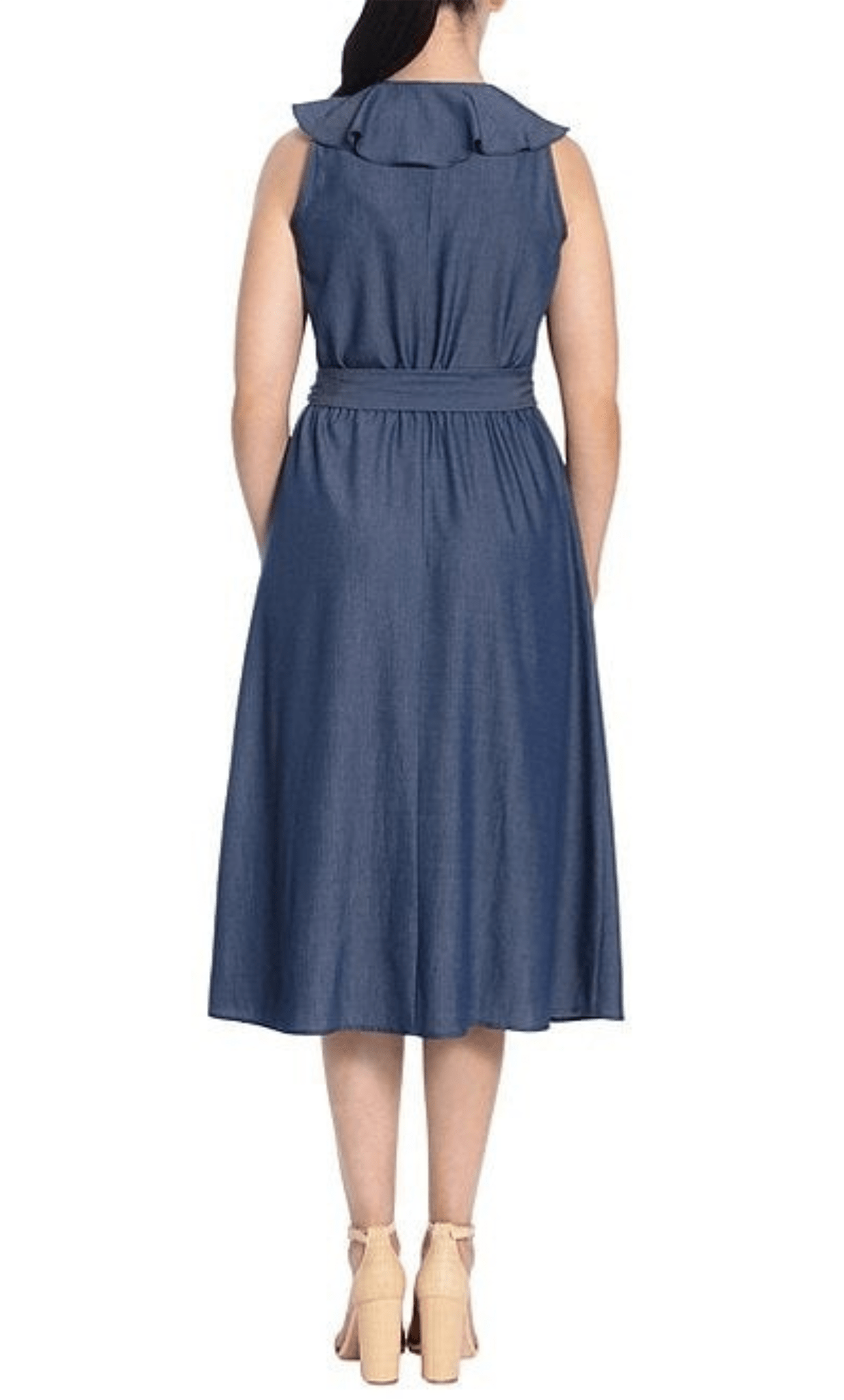 Show off your trendsetting style when you wear this London Times T6218M midi dress. This lovely dress is casual but still elegant using faux denim fabric. It features a sleeveless bodice and a deep V neckline adorned with ruffle detail for a feminine look. The A-line silhouette is dressed up with a ribbon tie waist and a button up front from the bodice to the skirt. Go with fun, gorgeous, and youthful creation by London Times T6218M Models are wearing Chambray and Dark Denim colors.