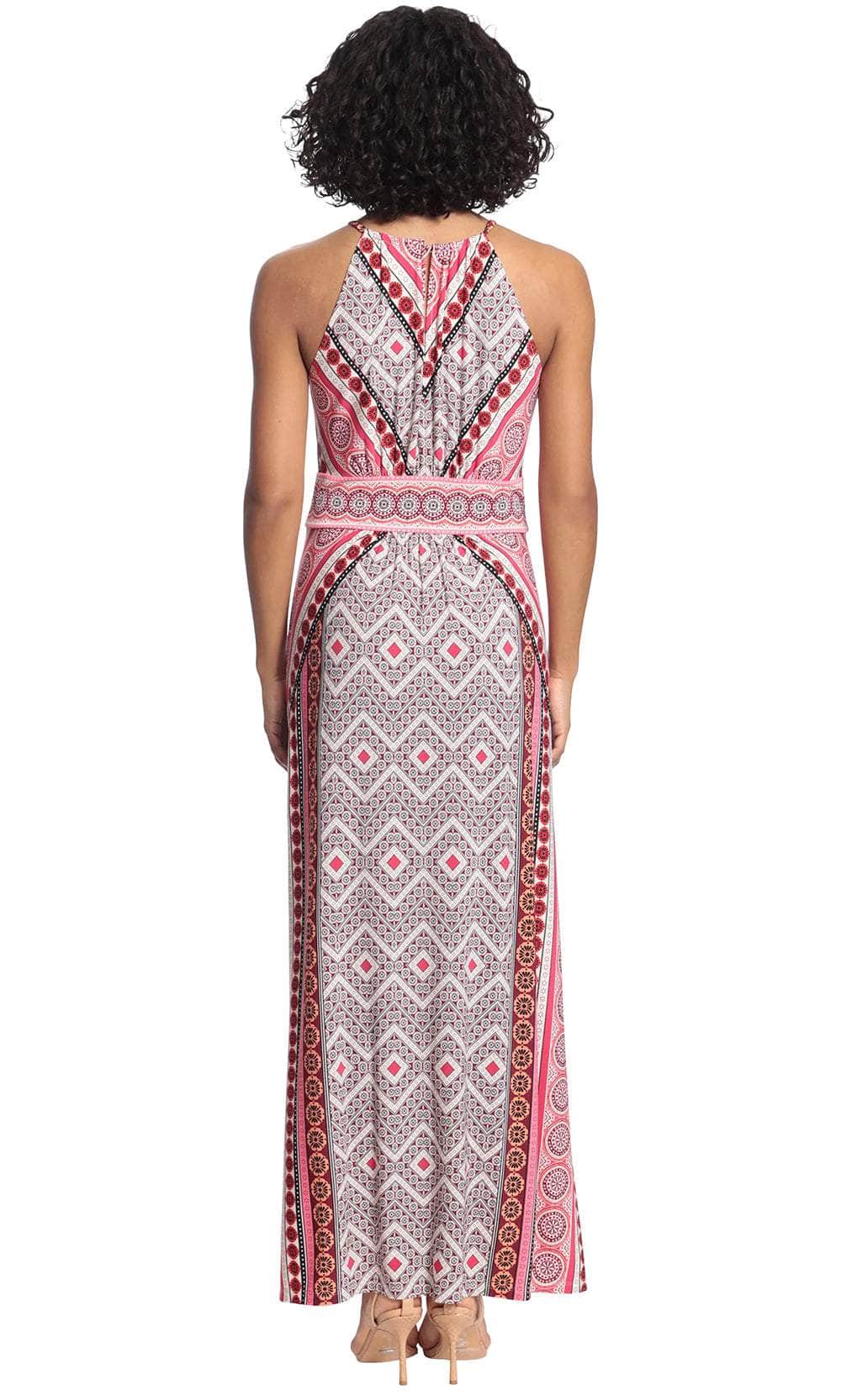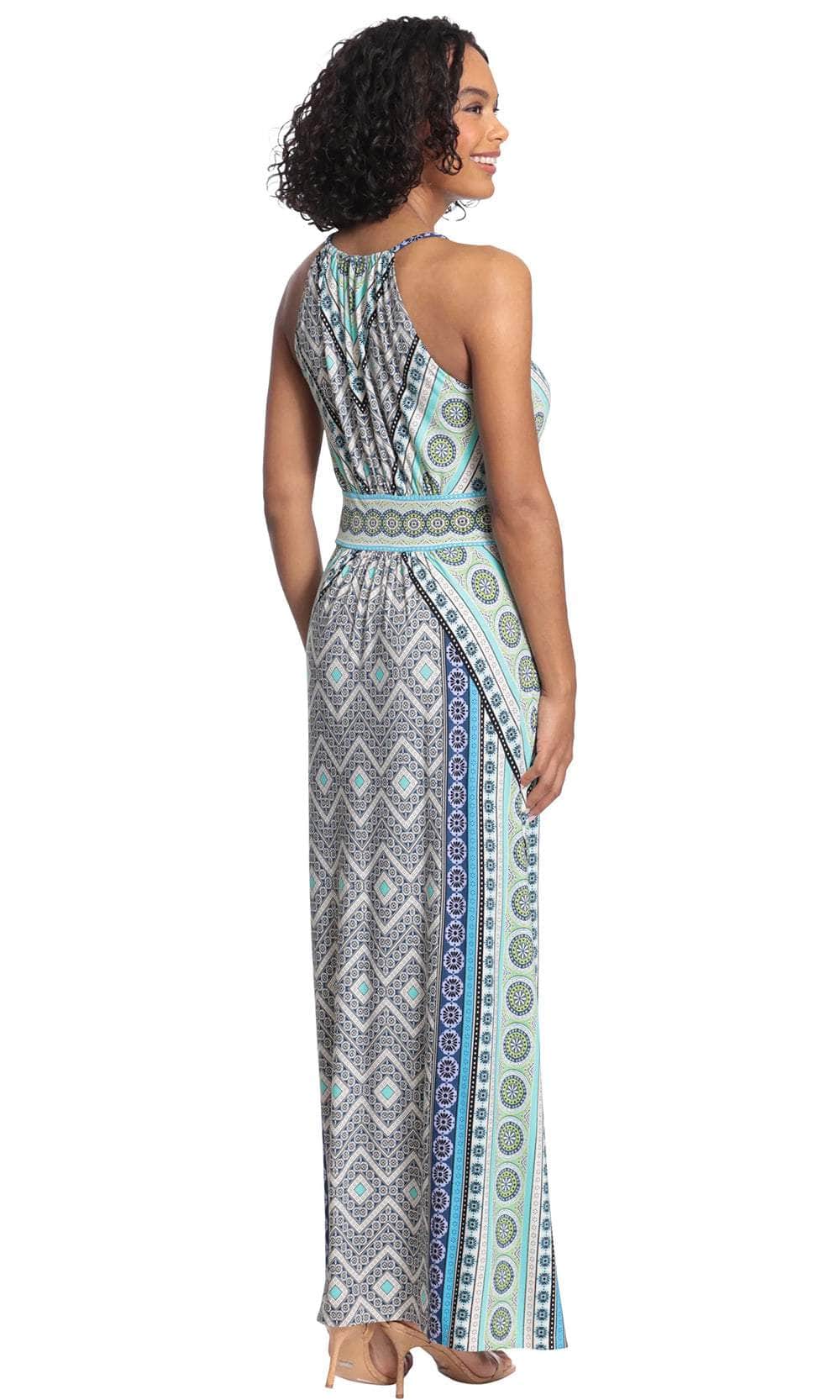 Be the star of the party when you show up in this stunningly designed London Times T6275M creation. Designed with tailoring lines on a vibrant multi-print matte jersey silhouette, this dress charms with a halter neckline and a thin strap navigating to the cut-in back. Designed with a banded waist and a keyhole cutout on the bodice, the A-line skirt softly flows into an ankle length hemline. Aspire to exude dominance in this gorgeous London Times masterpiece. Models are wearing the Blue and Red colors.