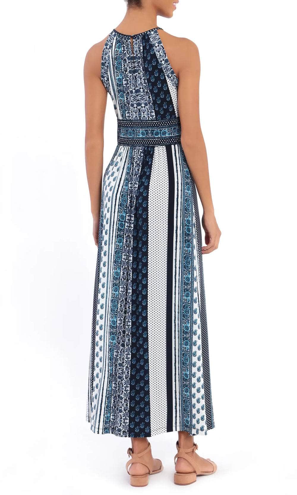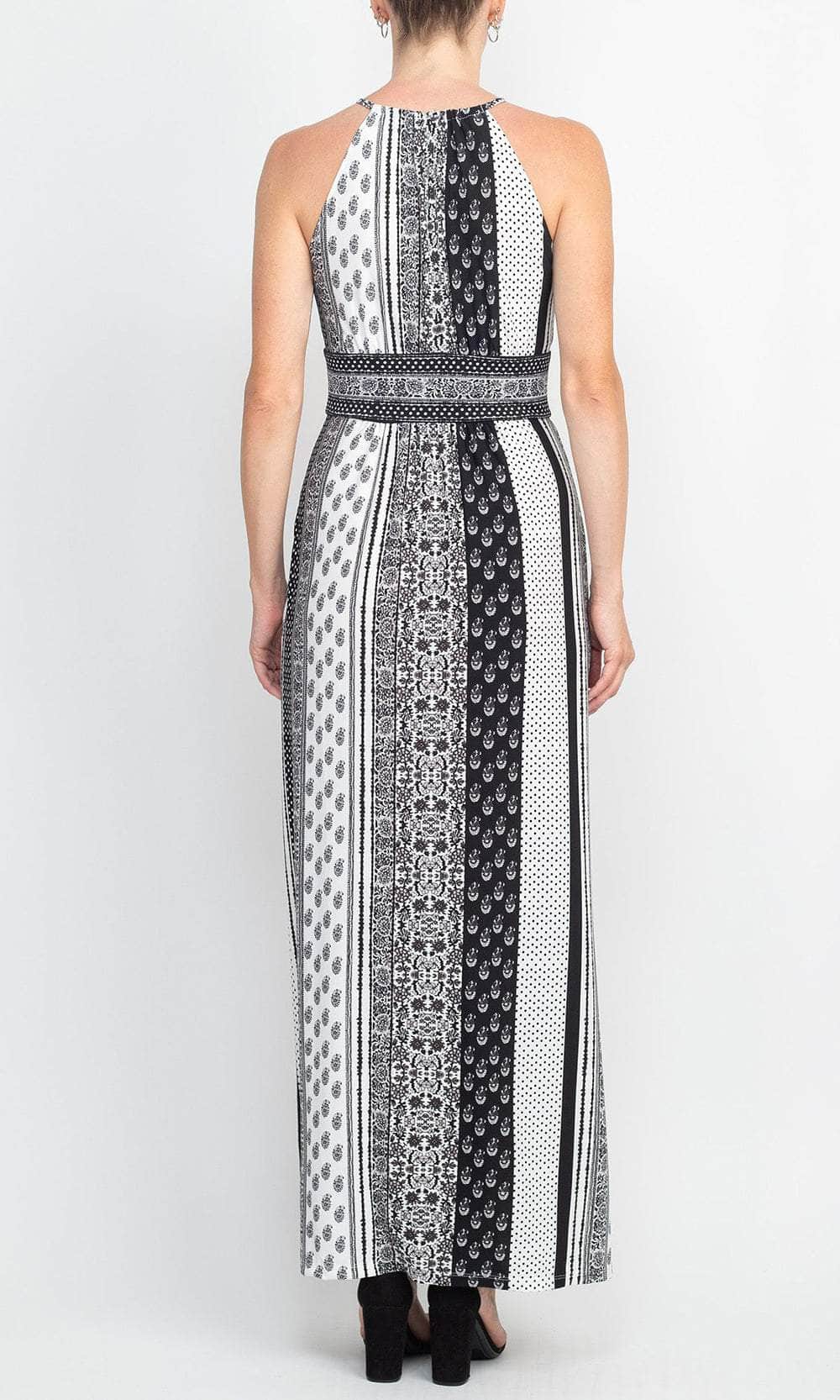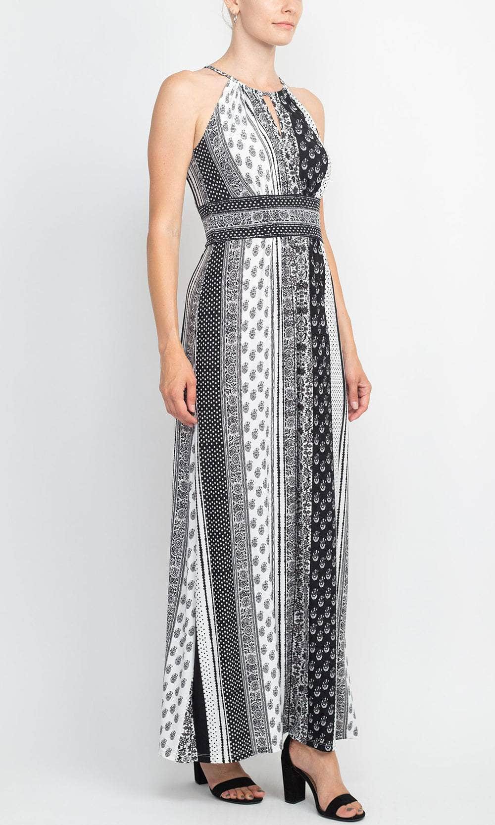 Radiance starts with a stunning smile in this exquisite London Times T6345M creation. Flaunting an intricate variety of prints donning the matte jersey silhouette, this stylish piece flourishes a halter neckline with thin straps connected to the full back. Accented with a keyhole cutout and designed with a banded empire waist, the sheath skirt trails to a full length hemline. Don a style that will truly tantalize the crowd in this London Times masterpiece. Models are wearing the White Blue and White Grey colors.