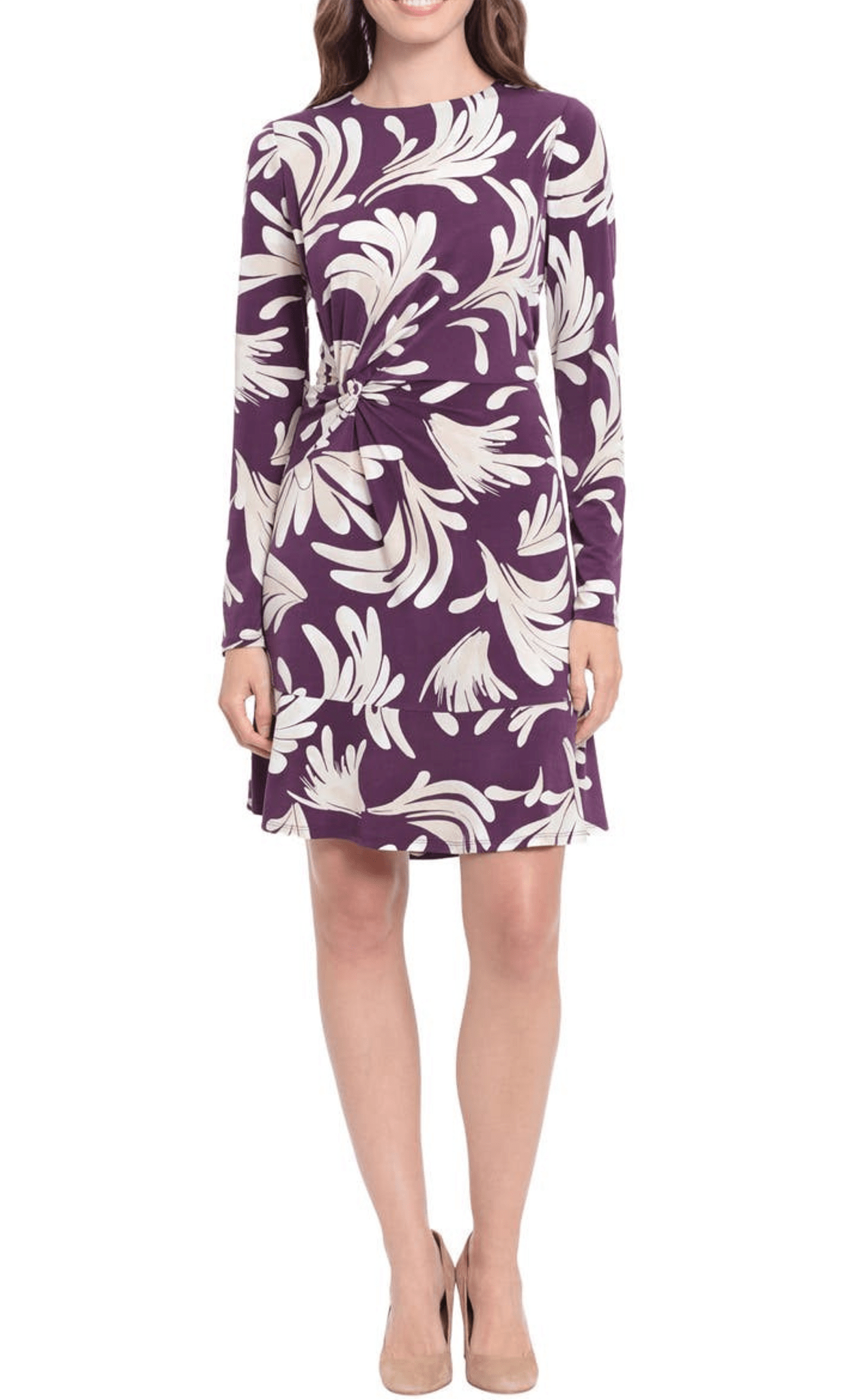 Keep your after-hours style upscale with this tailored creation by London Times T6372M. Modest in long sleeves, this gorgeous dress stands out in a bold paisley print all throughout. A high jewel neckline contrasts with a single-tiered mini dress length. The waist has gathered detail to highlight the figure. This lovely dress is sure to take you from your desk to your party in an effortless style. Buckle up for a wild ride in a fierce creation by London Times T6372M. Models are wearing Purple Beige and Black Sand colors.