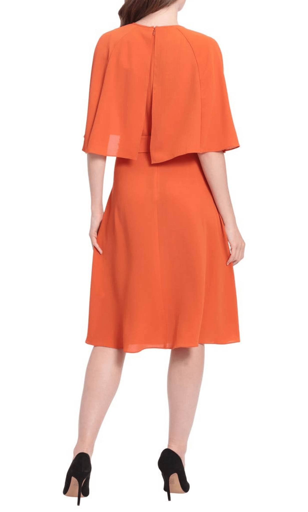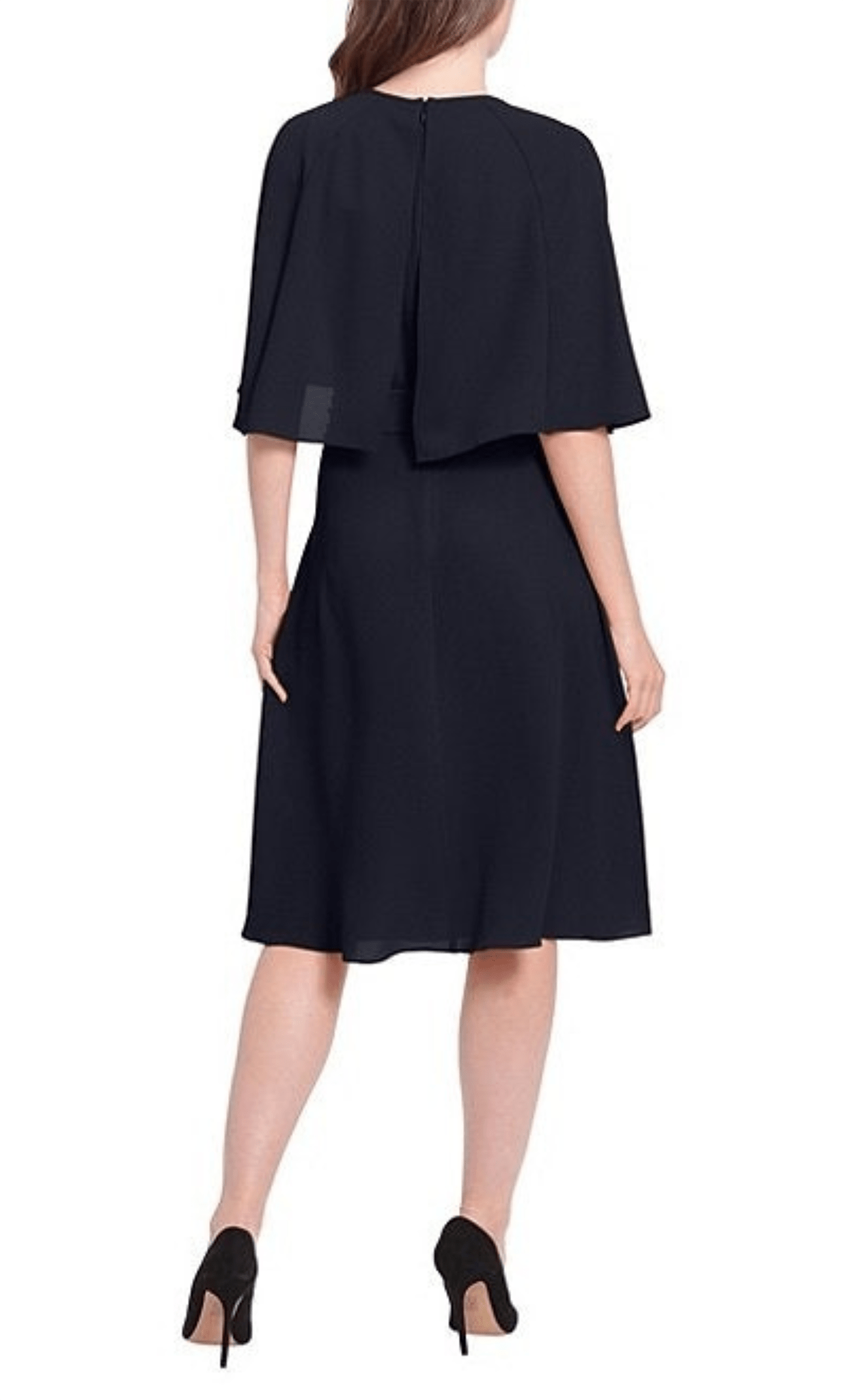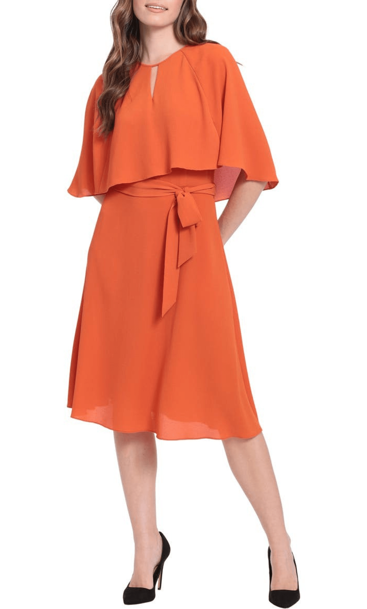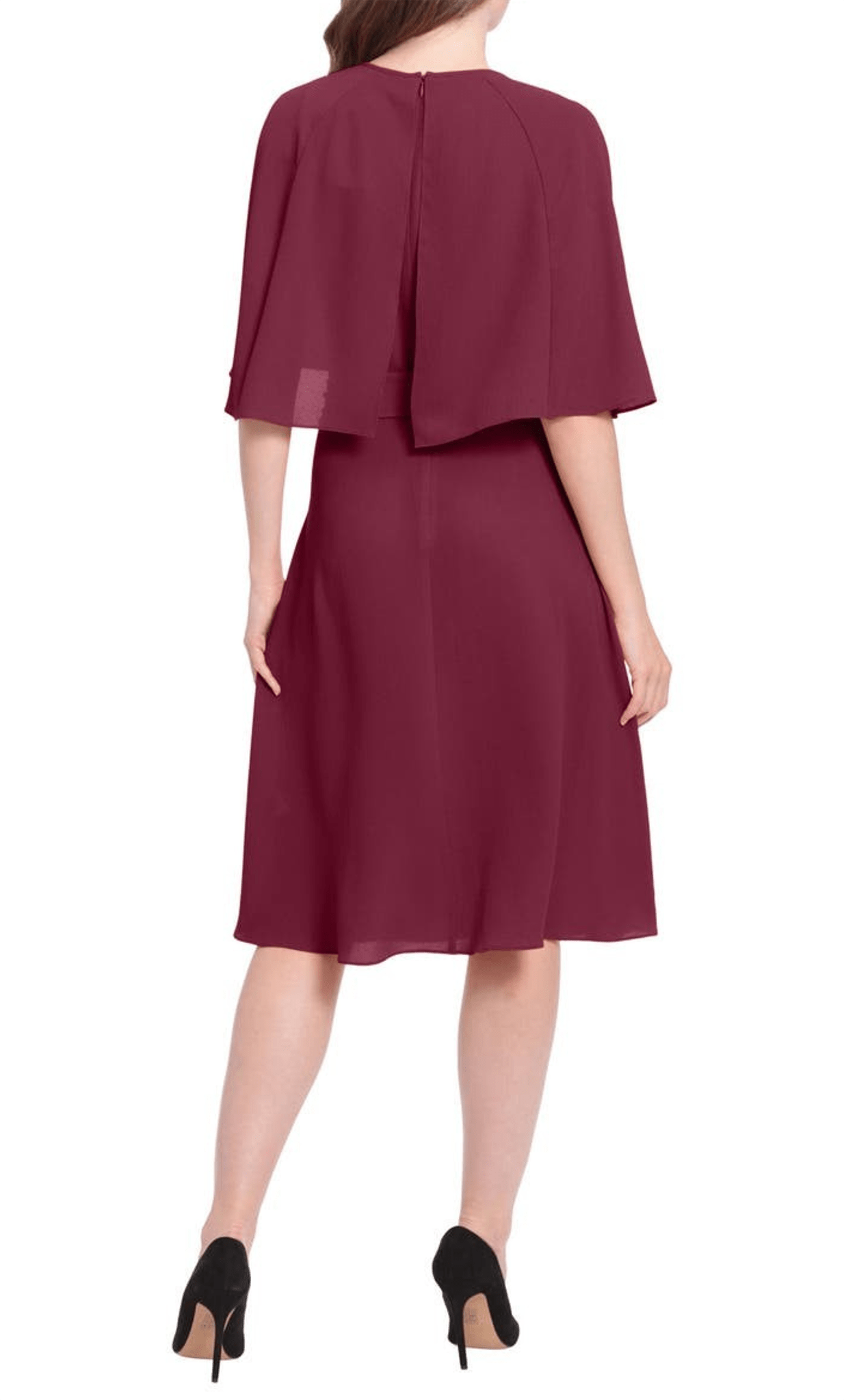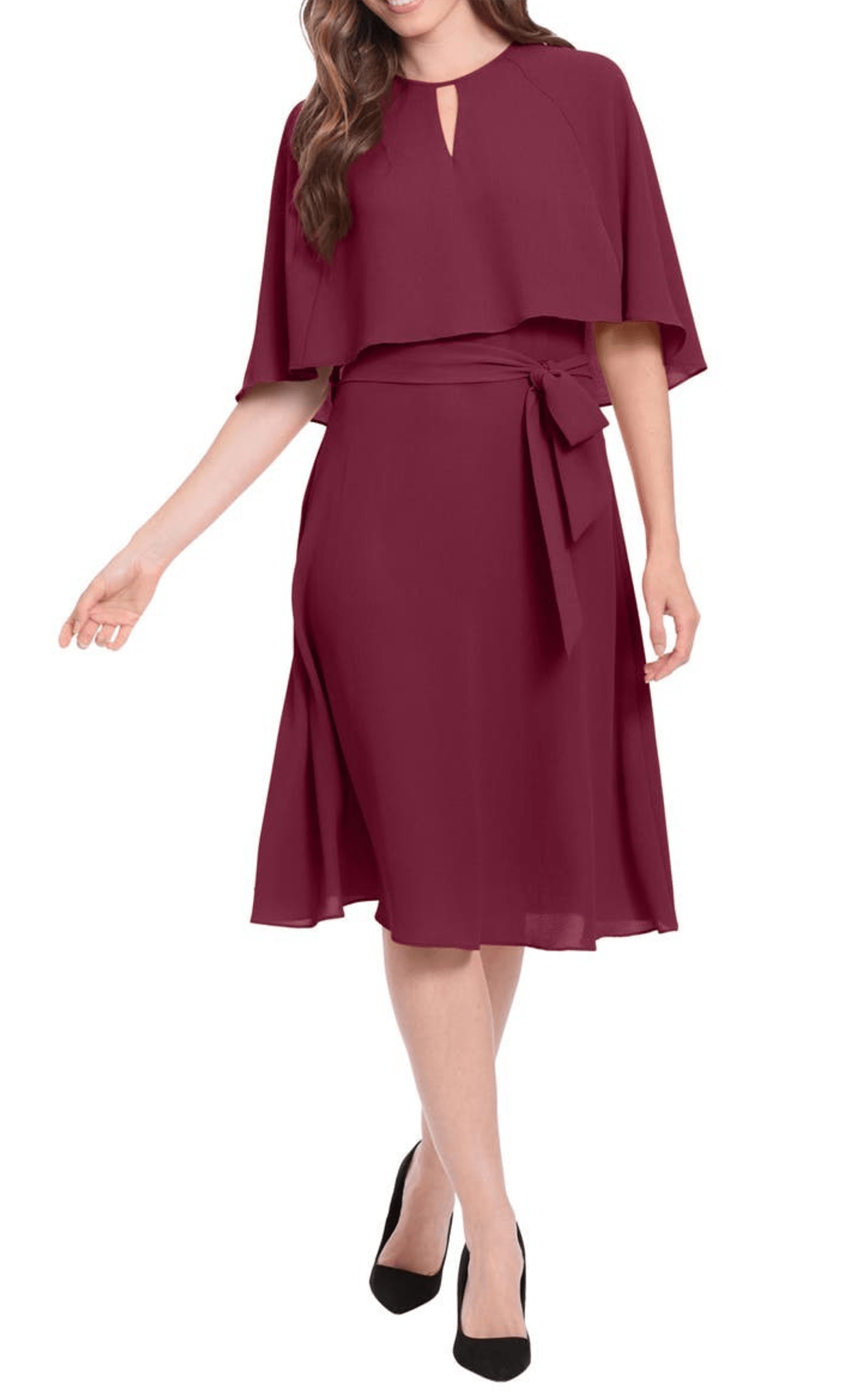 Have a blast in this fashionable London Times T6408M cocktail dress. You will definitely make heads turn in this simple dress that features a jewel neckline, front cutout and elbow-length cape sleeves. The full back is zipped up and a removable tie sash belt accentuates the waist. A flowy A-line skirt ends in knee length hem. This London Times T6408M ensemble will absolutely make you feel special! Models are wearing the Navy, Spice and Wine colors.
