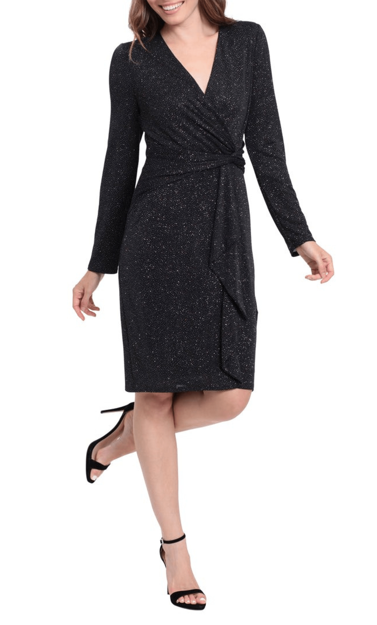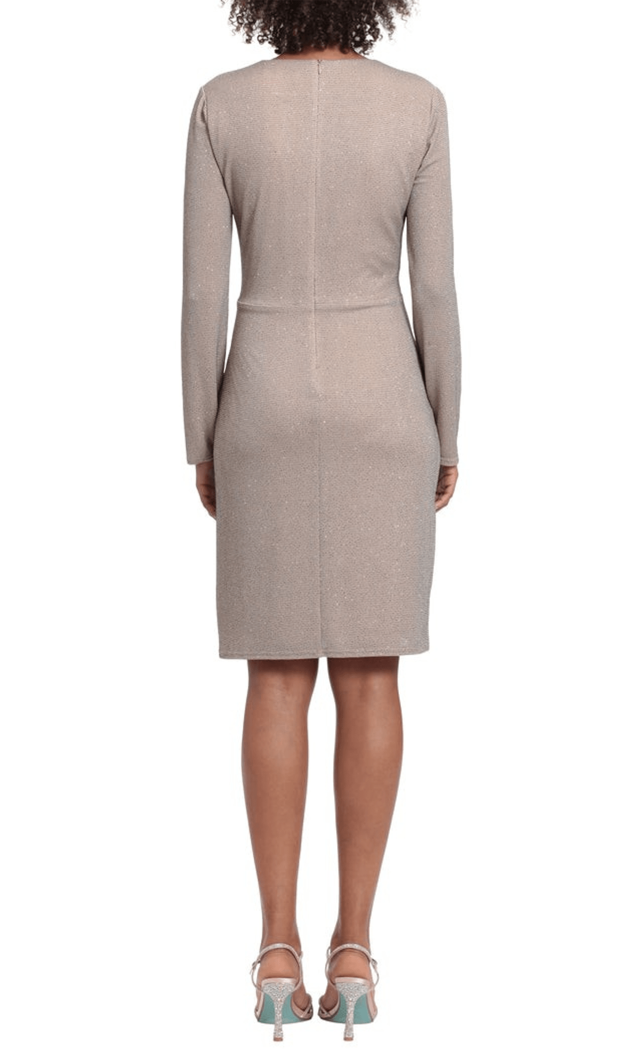 | Details: | Long Sleeve, Glitters, Ruched, Knotted Accent, Full Back, Drape Skirt |