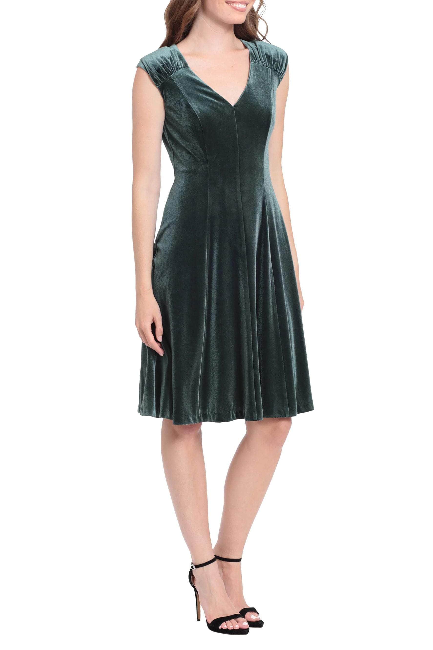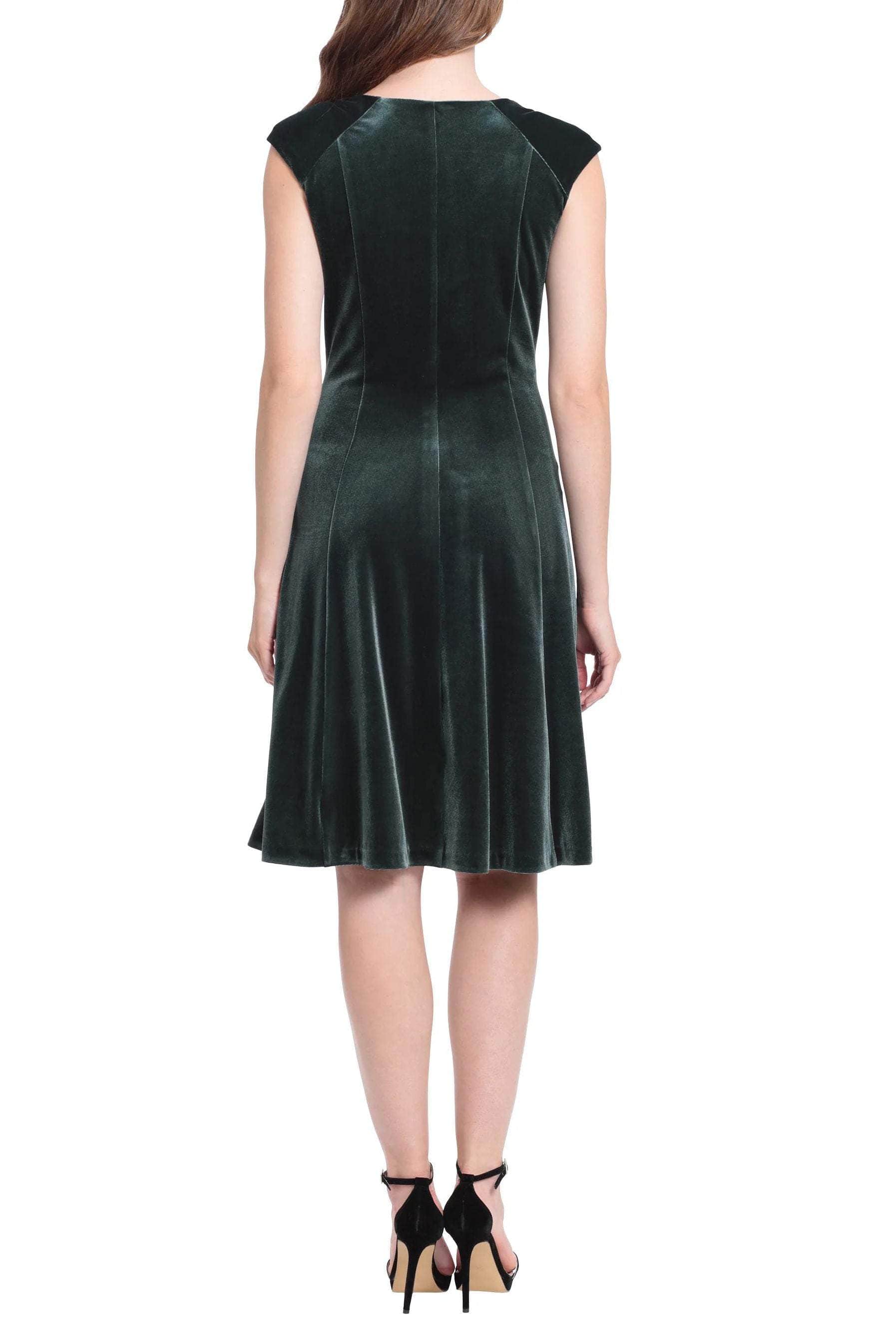 Look amazing for the party in this creation from London Times T6501M. This beautiful piece is tailored from velvet and has seams detail for a structured fit. The v-neckline exudes timeless charm, complemented by ruched cap sleeves and full back design. Shaped in an A-line silhouette, the skirt flatters every curve and hits the knee-length hem for an elegant finish. Instantly attract attention when you wear this London Times T6501M dress. Model is wearing Green color.