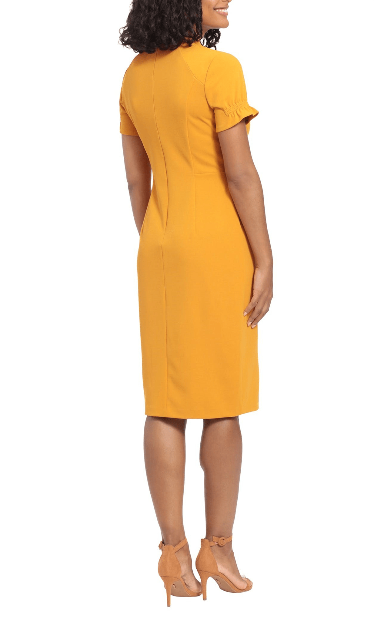 Get a glamorous look with this short dress by London Times T6514M. This dress features short flare sleeves that add a playful touch to the elegant design. The enclosed back adds a sophisticated touch, while the front slit on the crepe skirt creates a flattering silhouette. The dress is completed with a classic V-neckline, providing a touch of femininity to the overall look. Appear in elegance in London Times T6514M. Model is wearing Inca Gold color.