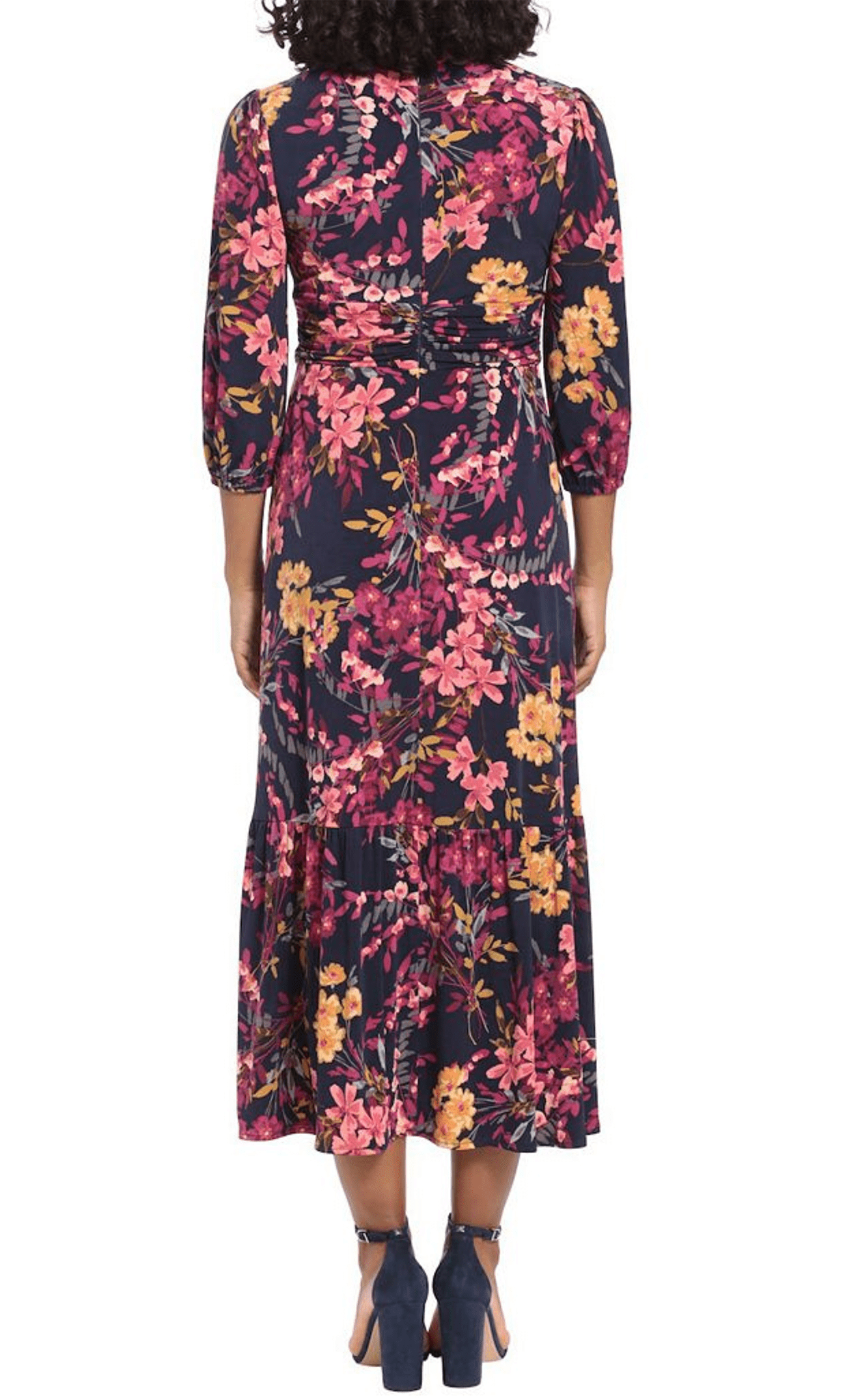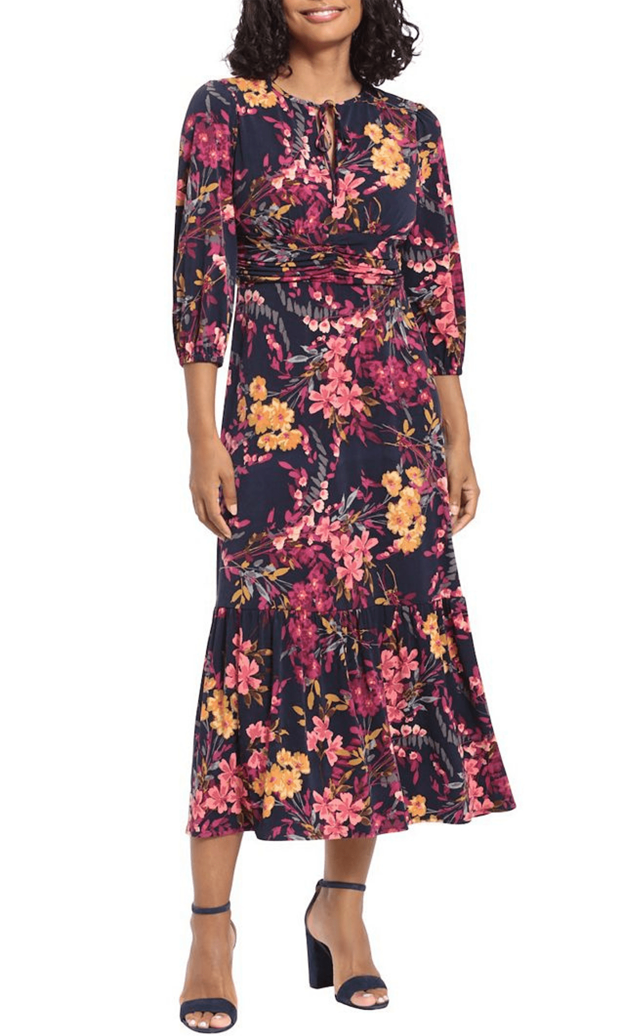 | Details: | Floral, Long Elastic Sleeves, Ruched Waist, Keyhole Front, Enclosed Back, Draped Skirt |