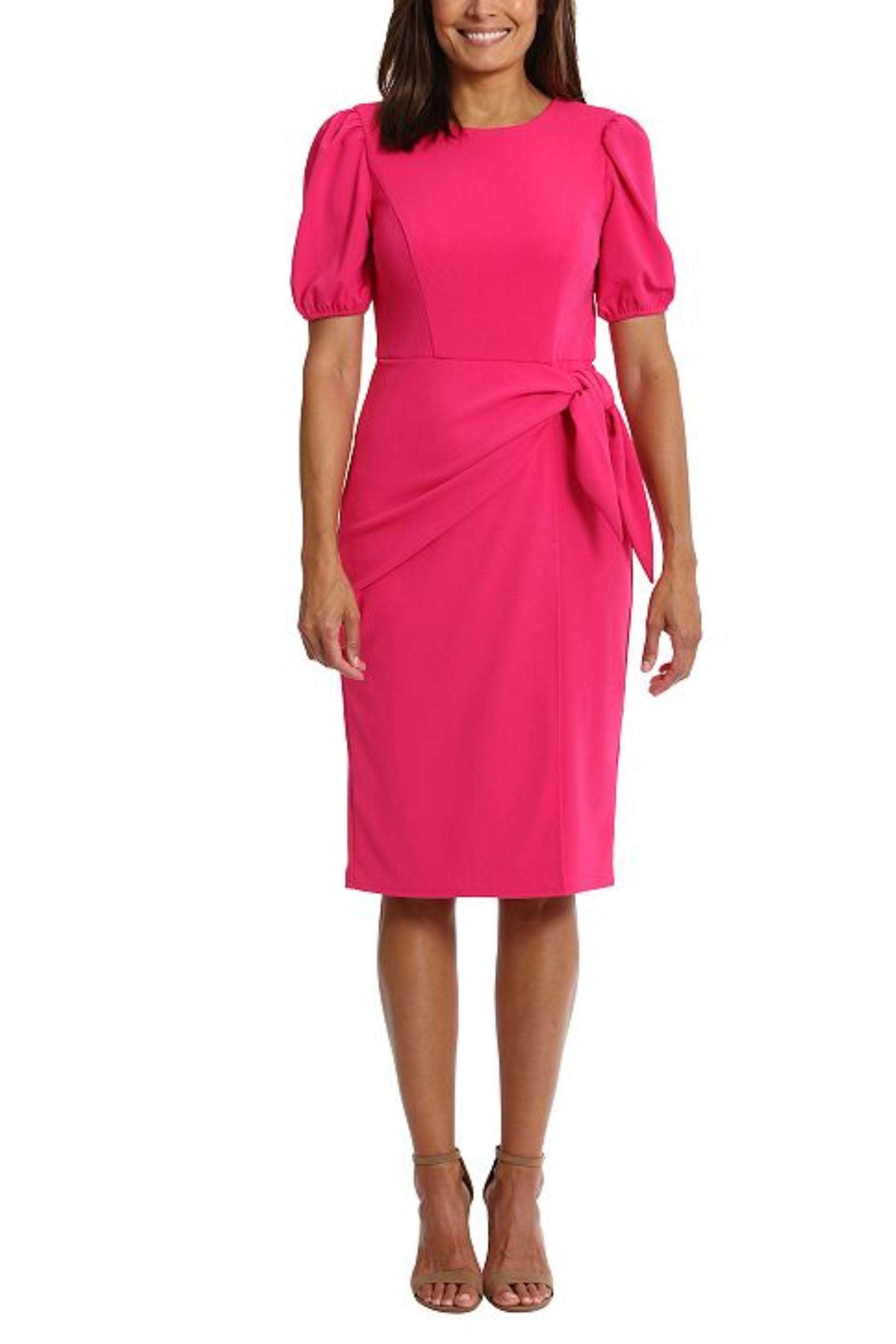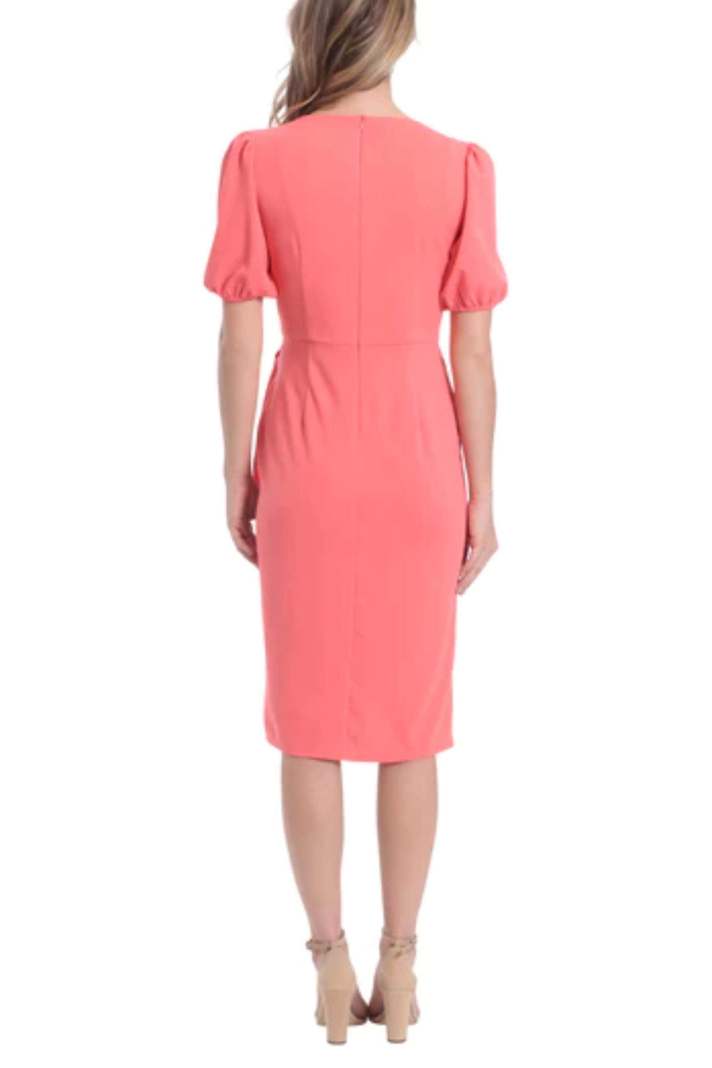 Flaunt minimalist sophistication and feminine flair in this London Times T6848M creation, expertly tailored to perfection. Designed with meticulous seams crafting to enhance the female form, this exquisite dress features a scuba crepe fabric in a gorgeous silhouette. Showcasing a short puff-sleeve bodice with elastic cuffs paired with a jewel neckline, the ensemble reveals a full back with a concealed zipper closure. Accentuated with a draped over with a bow, the fitted silhouette, culminates in a knee-length hem. Indulge in elegance in our London Times T6848M masterpiece. Models are wearing the Bright Pink, Cobalt, and Coral colors.