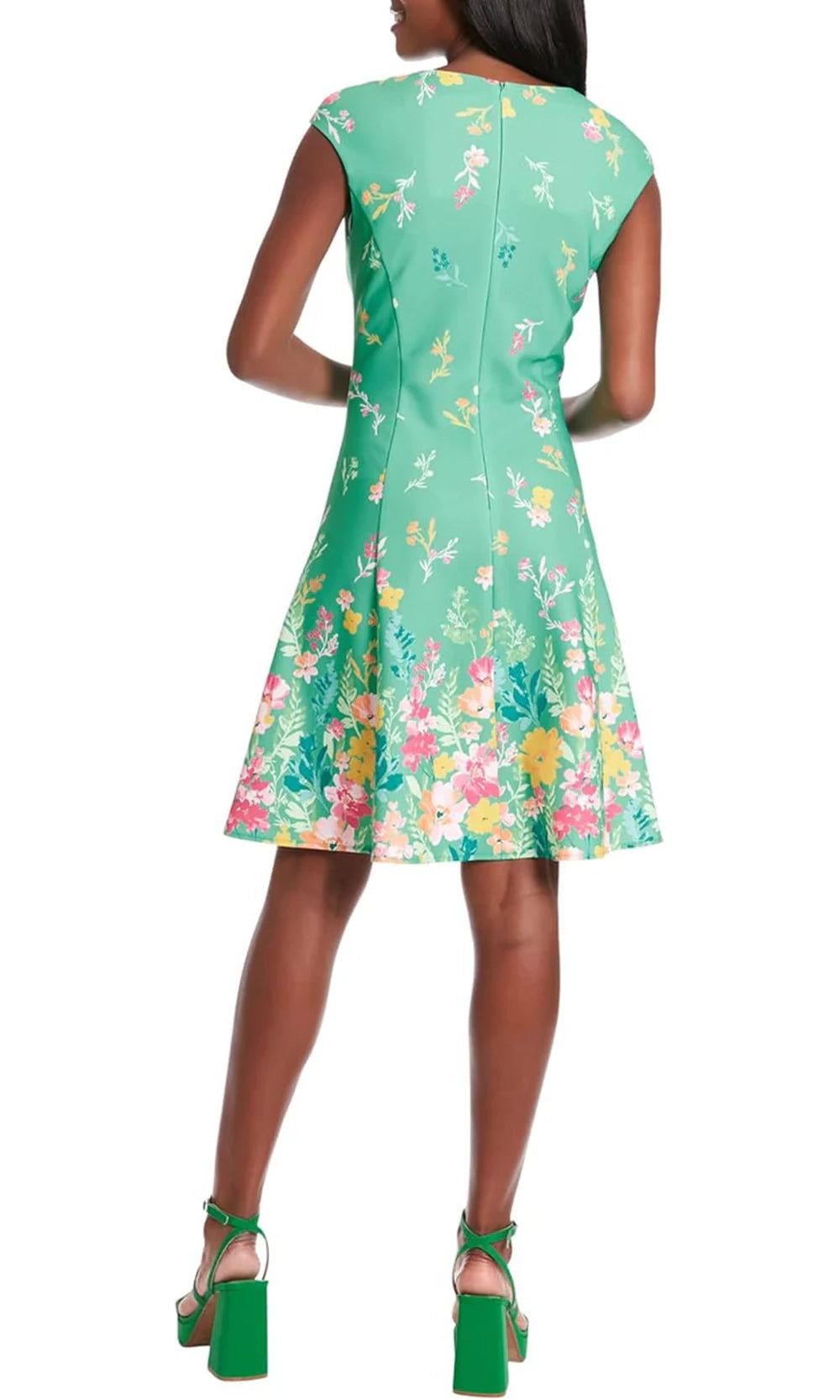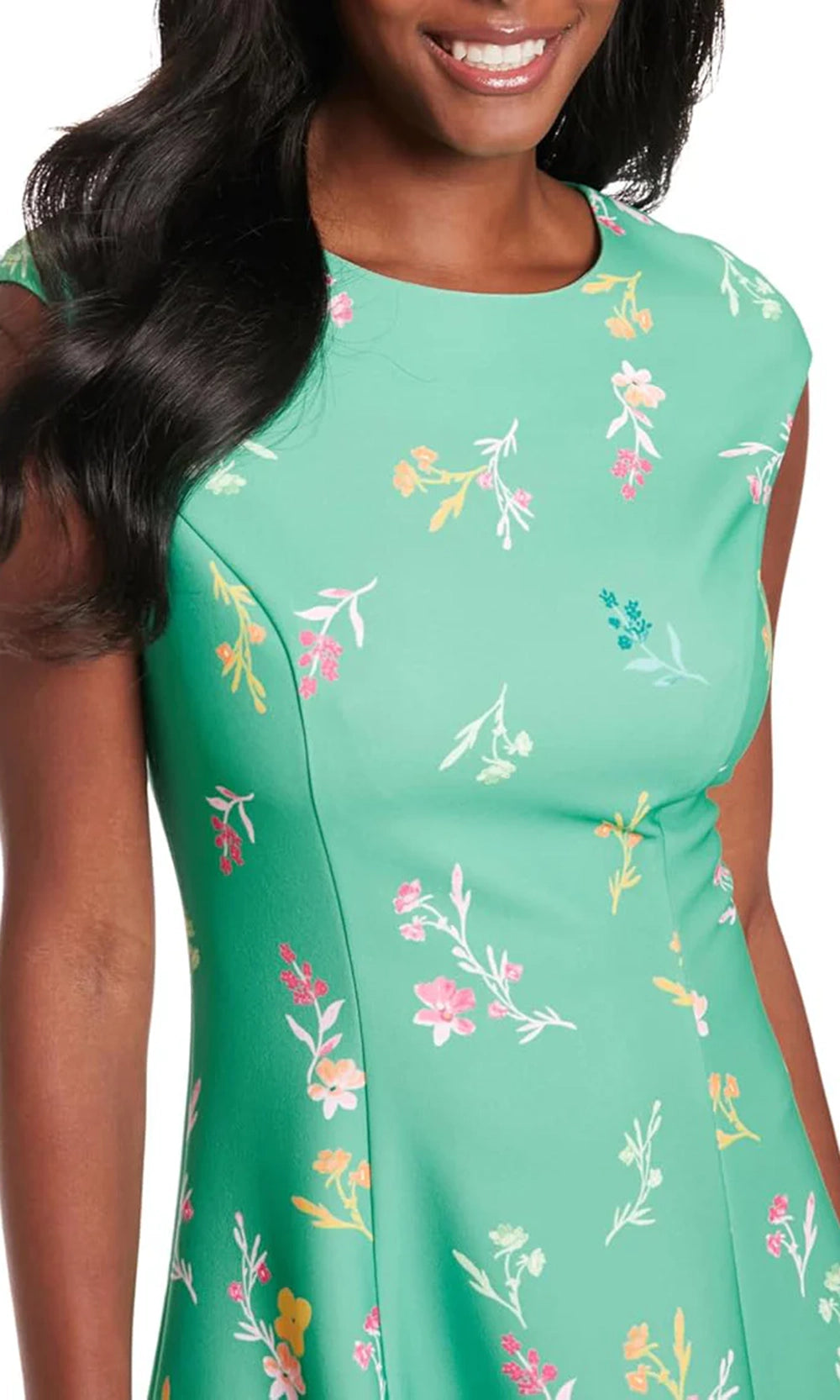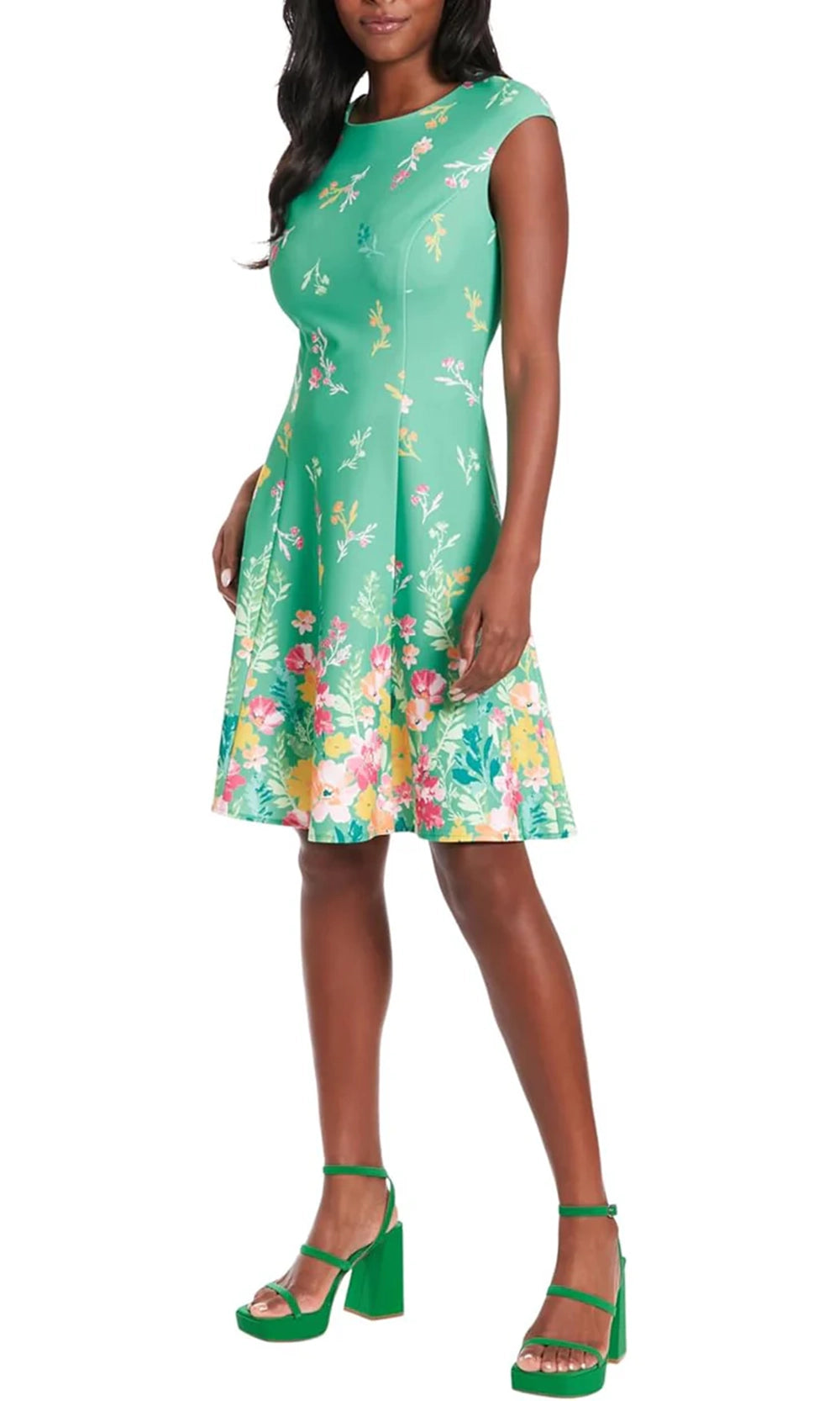 Bright florals and feminine structure define a London Times T7431M dress that feels both lively and timeless. It features a jewel neckline paired with cap sleeves, creating a balanced upper silhouette. A fitted bodice highlights the natural waist before transitioning into a flared A-line skirt that finishes at the knee. The floral print adds vibrancy and color, elevating the look with charm. This London Times T7431M style is an excellent choice for occasions where confidence and elegance are equally desired, offering long-lasting wearability with expressive detail. Model is wearing Green Yellow color.