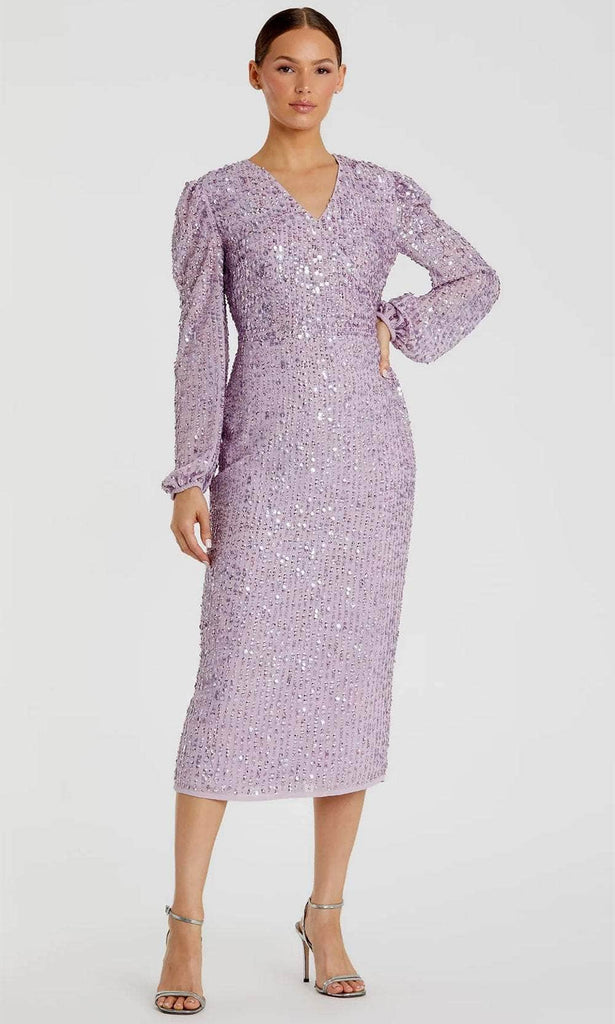 Shine bright and take center stage at your upcoming occasion in this Mac Duggal 107641 masterpiece. Sculpted for an impeccable fit, the dress is decorated with all-over linear sequins that give off an eye-catching sparkle. The surplice v-neckline, thin waistband, and full back design are captivating features. Its long puff sleeves offer warmth and beautiful coverage for your arms. The center-back slit facilitates easy movement, while the column skirt finishes the look as it cascades down to the sexy tea-length hemline. Elevate your night out in this fashionable Mac Duggal 107641 dress. Models are wearing Lavender, and Nude colors.