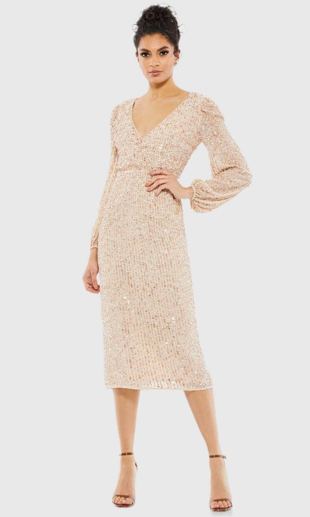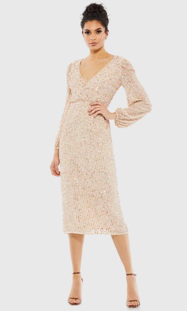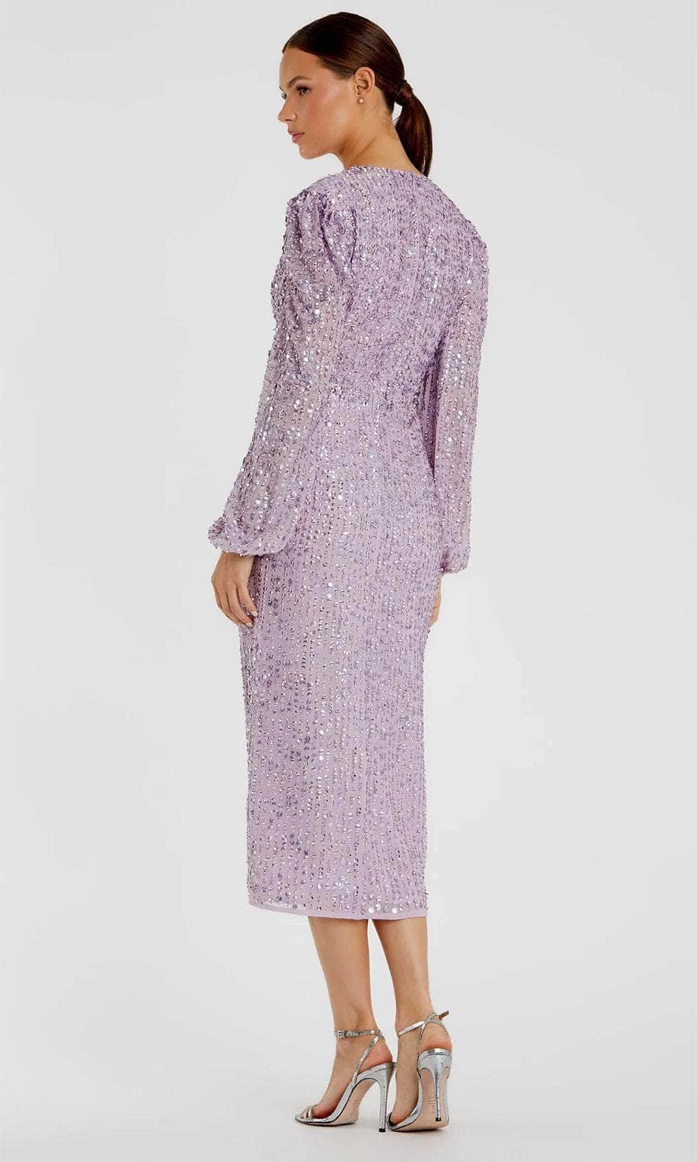Shine bright and take center stage at your upcoming occasion in this Mac Duggal 107641 masterpiece. Sculpted for an impeccable fit, the dress is decorated with all-over linear sequins that give off an eye-catching sparkle. The surplice v-neckline, thin waistband, and full back design are captivating features. Its long puff sleeves offer warmth and beautiful coverage for your arms. The center-back slit facilitates easy movement, while the column skirt finishes the look as it cascades down to the sexy tea-length hemline. Elevate your night out in this fashionable Mac Duggal 107641 dress. Models are wearing Lavender, and Nude colors.