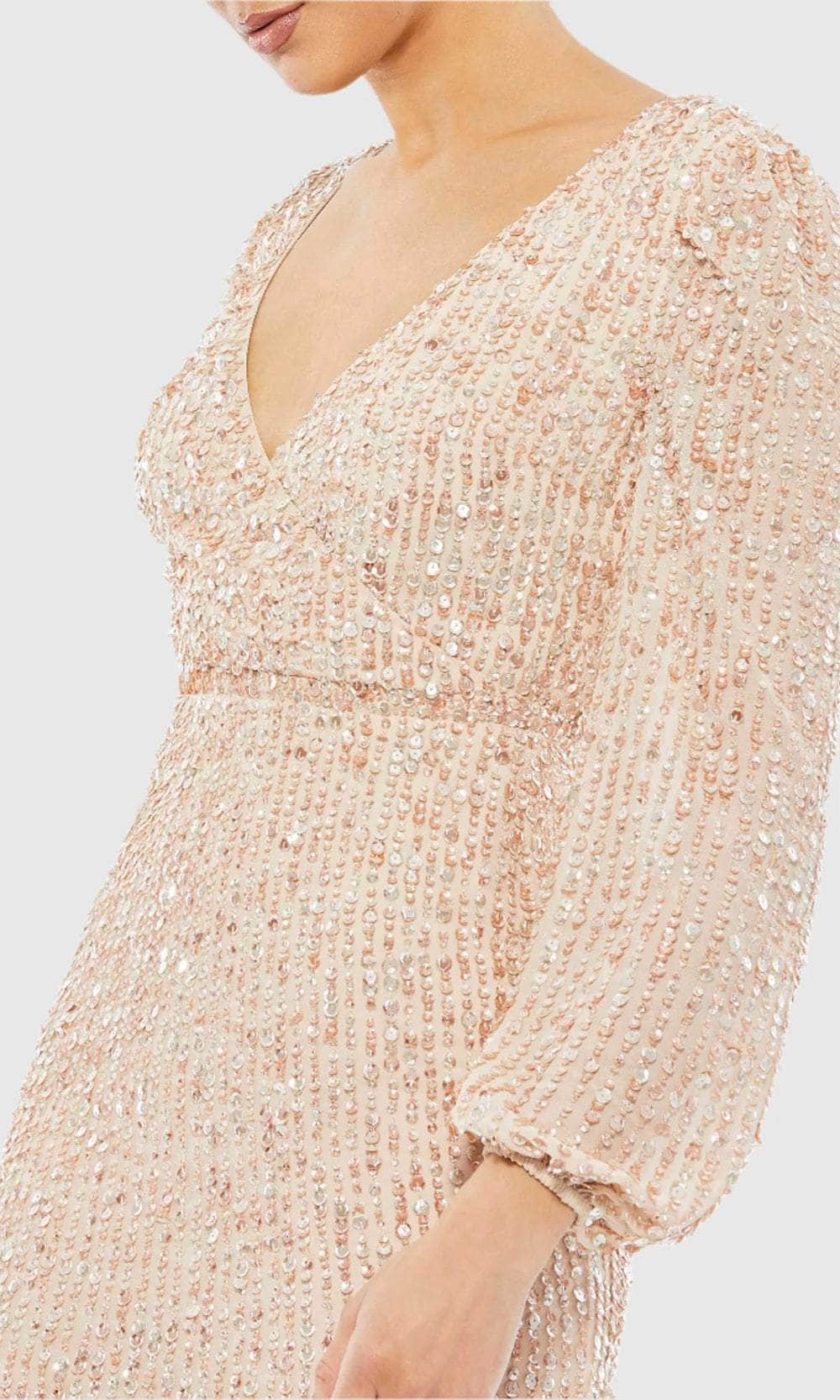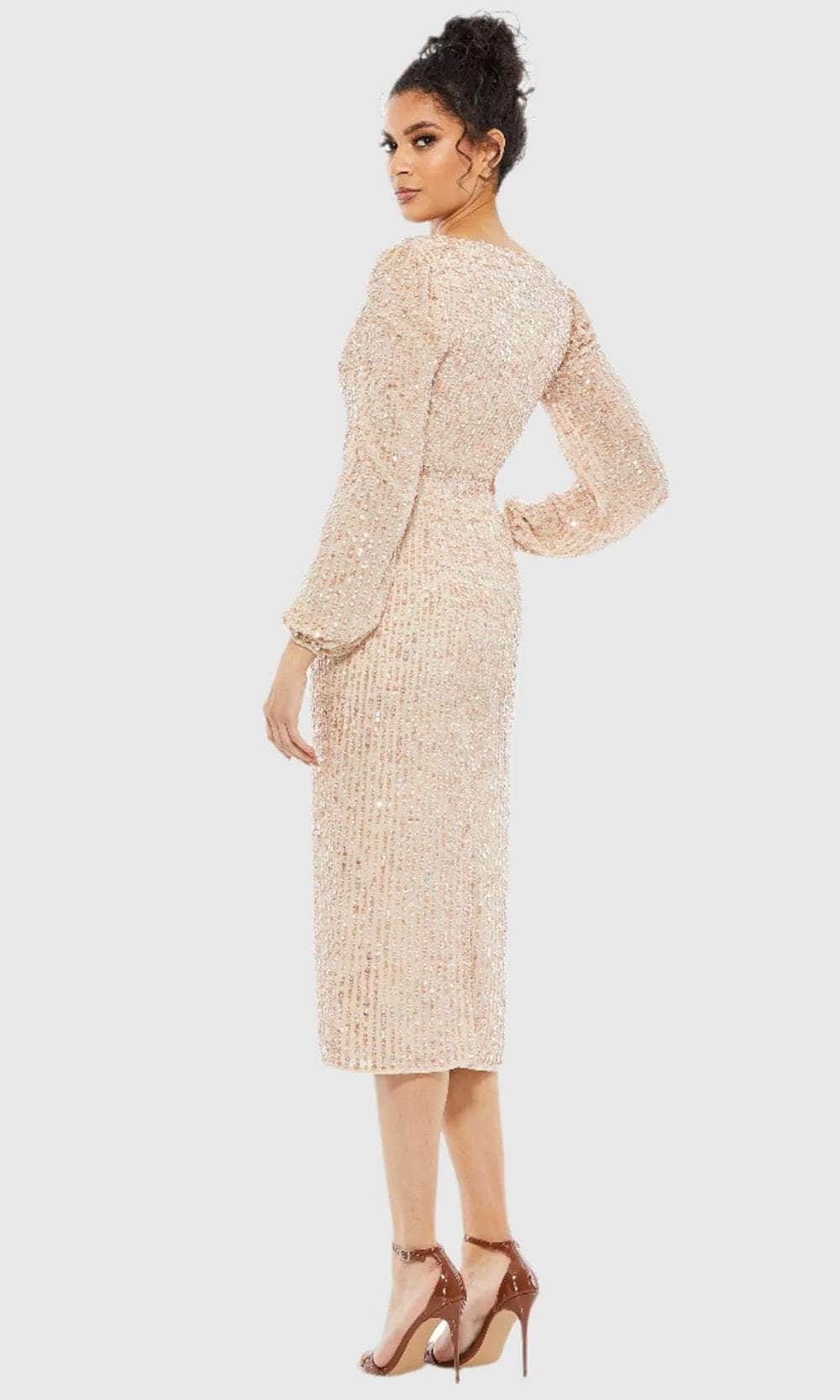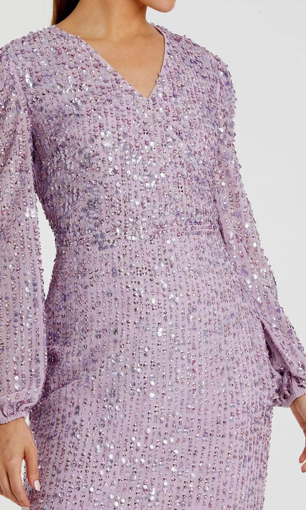 Shine bright and take center stage at your upcoming occasion in this Mac Duggal 107641 masterpiece. Sculpted for an impeccable fit, the dress is decorated with all-over linear sequins that give off an eye-catching sparkle. The surplice v-neckline, thin waistband, and full back design are captivating features. Its long puff sleeves offer warmth and beautiful coverage for your arms. The center-back slit facilitates easy movement, while the column skirt finishes the look as it cascades down to the sexy tea-length hemline. Elevate your night out in this fashionable Mac Duggal 107641 dress. Models are wearing Lavender, and Nude colors.