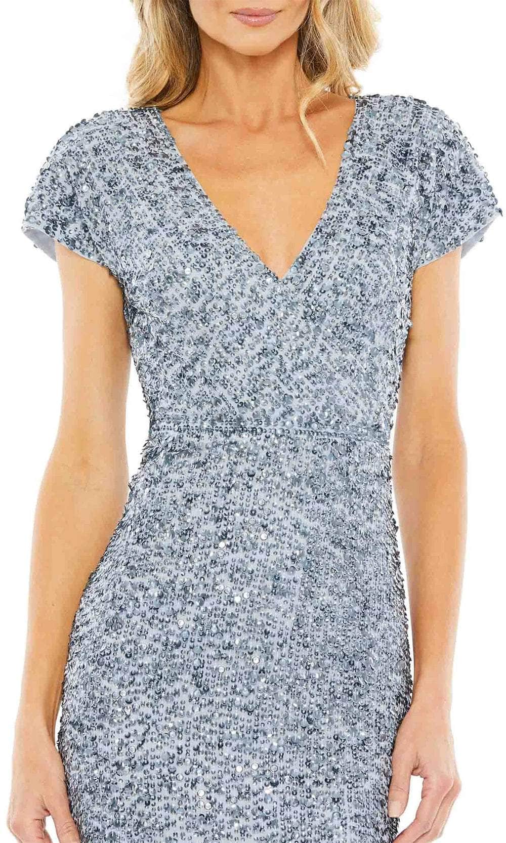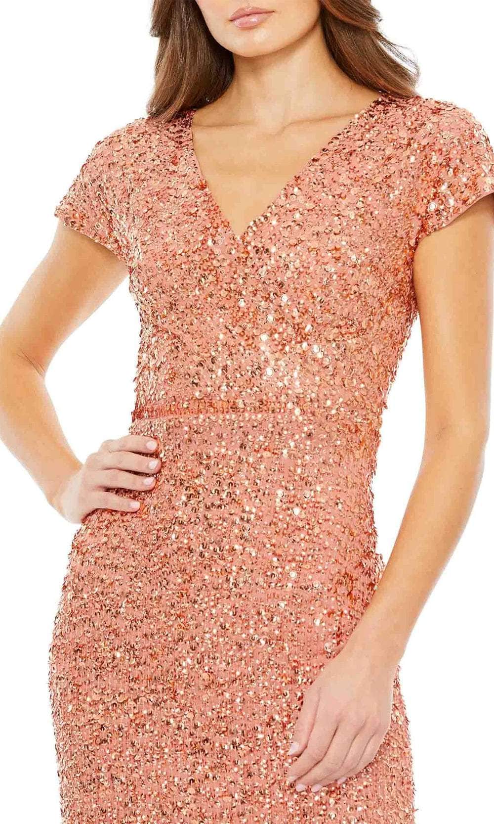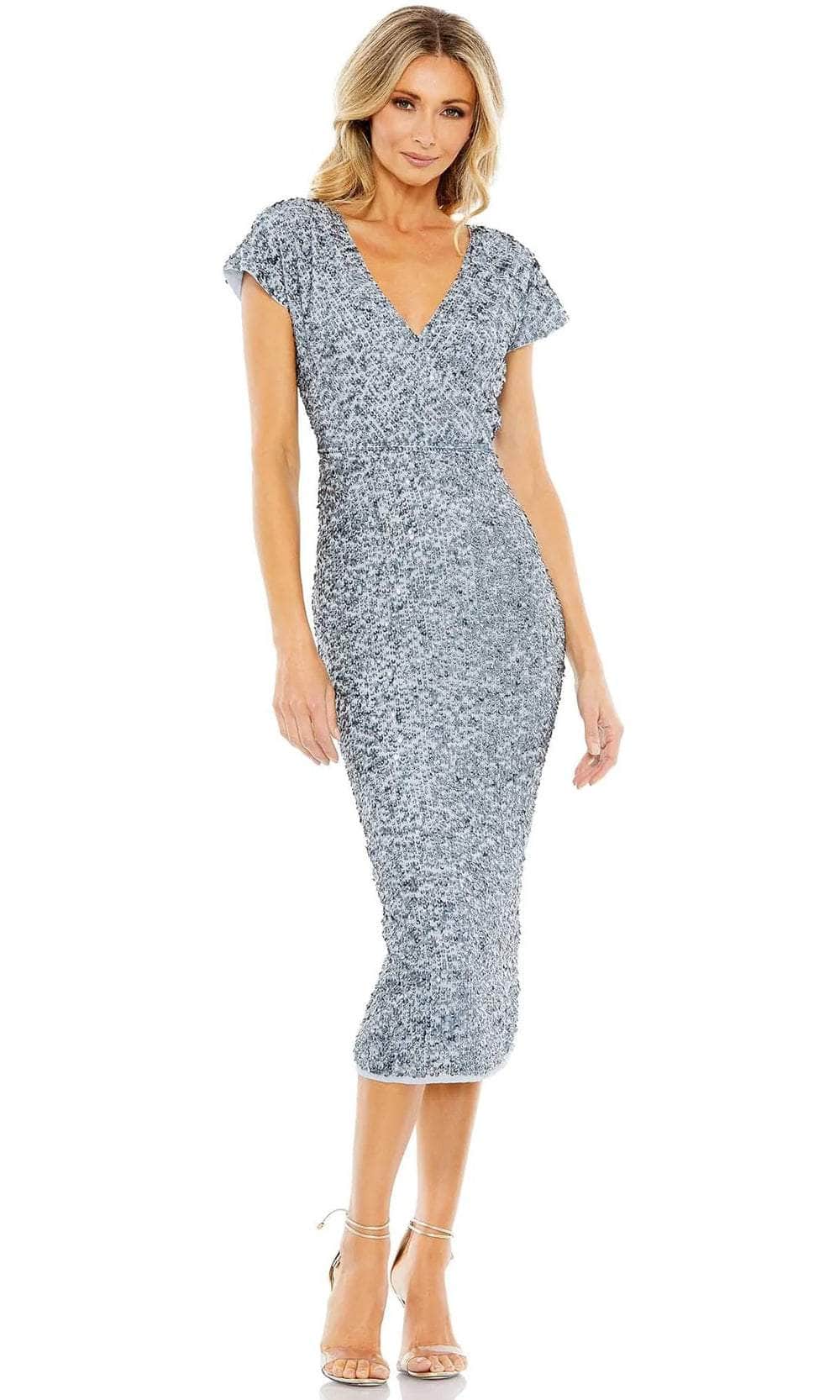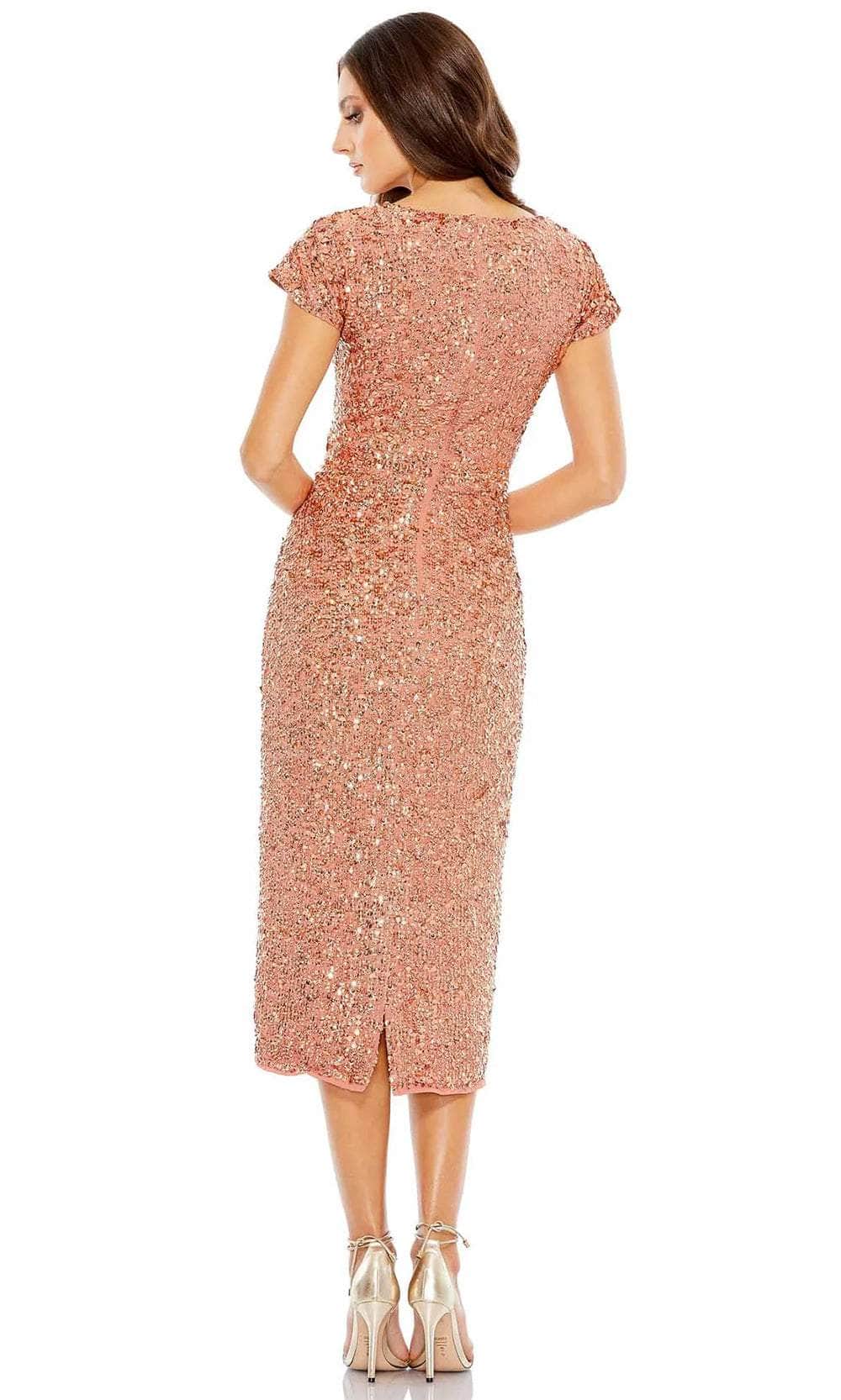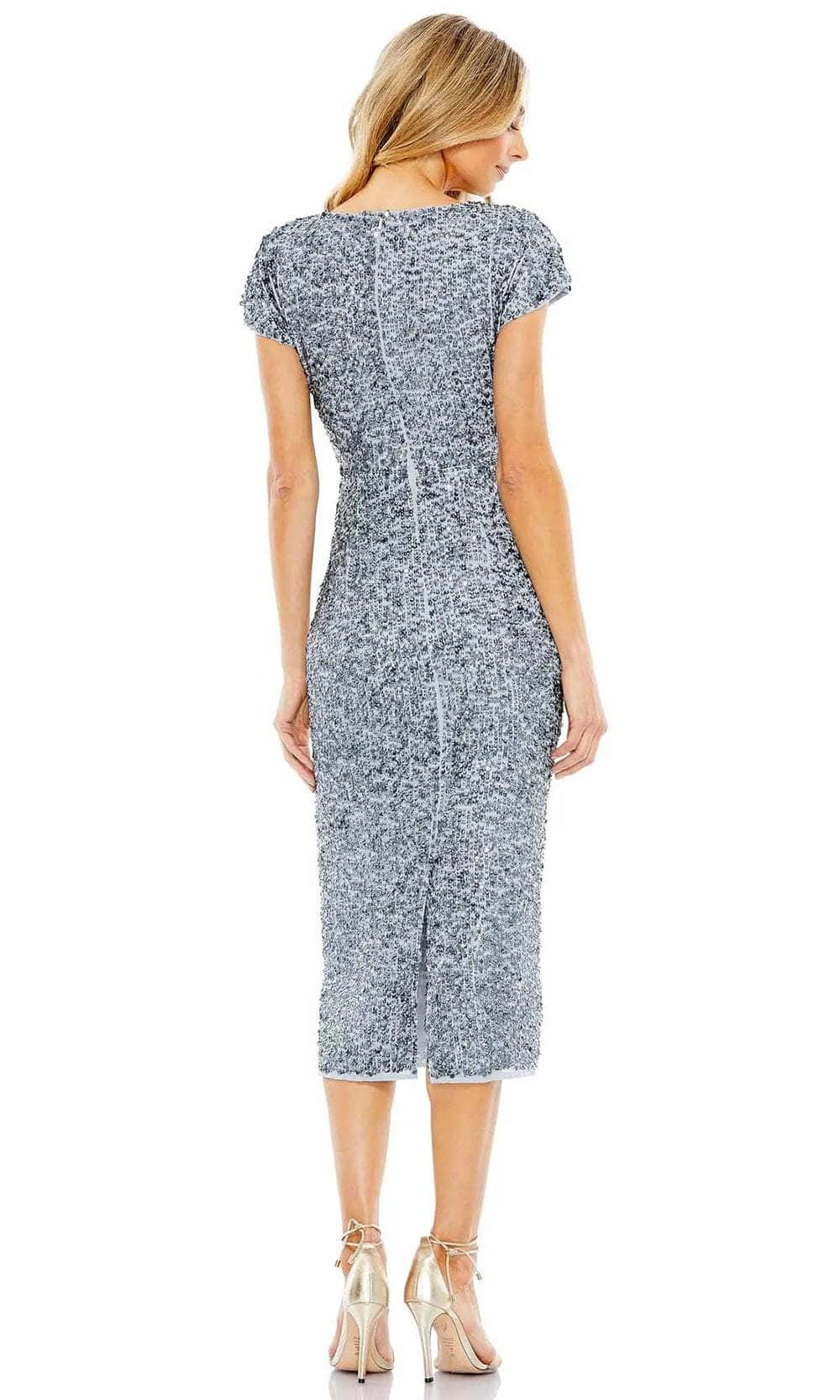 Embody timeless elegance in the Mac Duggal 10766 masterpiece. This tea-length cocktail dress flatters your form with a tailored lining meticulously adorned with sequins and bugle beads. Delicate cap sleeves frame the décolletage, leading to a plunging V-neckline with a surplice bodice. The inset waistband cinches the silhouette, while the full back adds a touch of classic charm. The sheath skirt with a center back slit adds a touch of movement and ensures a graceful tea-length hem. This Mac Duggal 10766 creation reveals a scintillating silhouette. Models are wearing the Copper and Slate Blue colors.