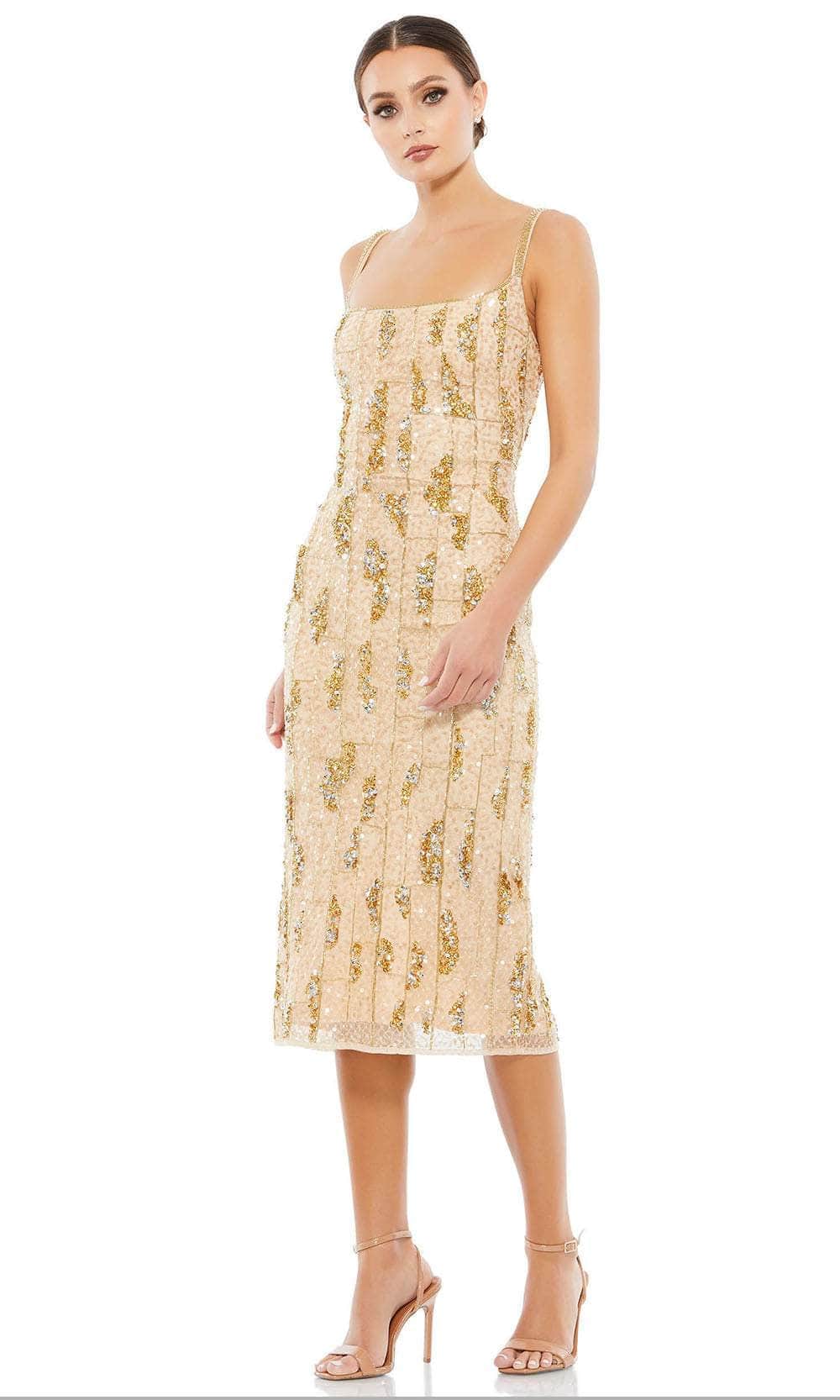 Saunter into the room and shine in this classy Mac Duggal 10770 creation. Trailing with beaded spaghetti straps and neckline trim trailing to a hand-embellished mesh silhouette, this dress parades a square neckline and a square open back on a sleeveless bodice. Flaunting an intricately patterned bead and sequin embellishments throughout, the sheath skirt skims into a tea length hemline with a back slit for movement. Standout among the fabulous crowd as all eyes focus on you in this Mac Duggal masterpiece. Models are wearing the Burgundy and Nude/Gold colors.