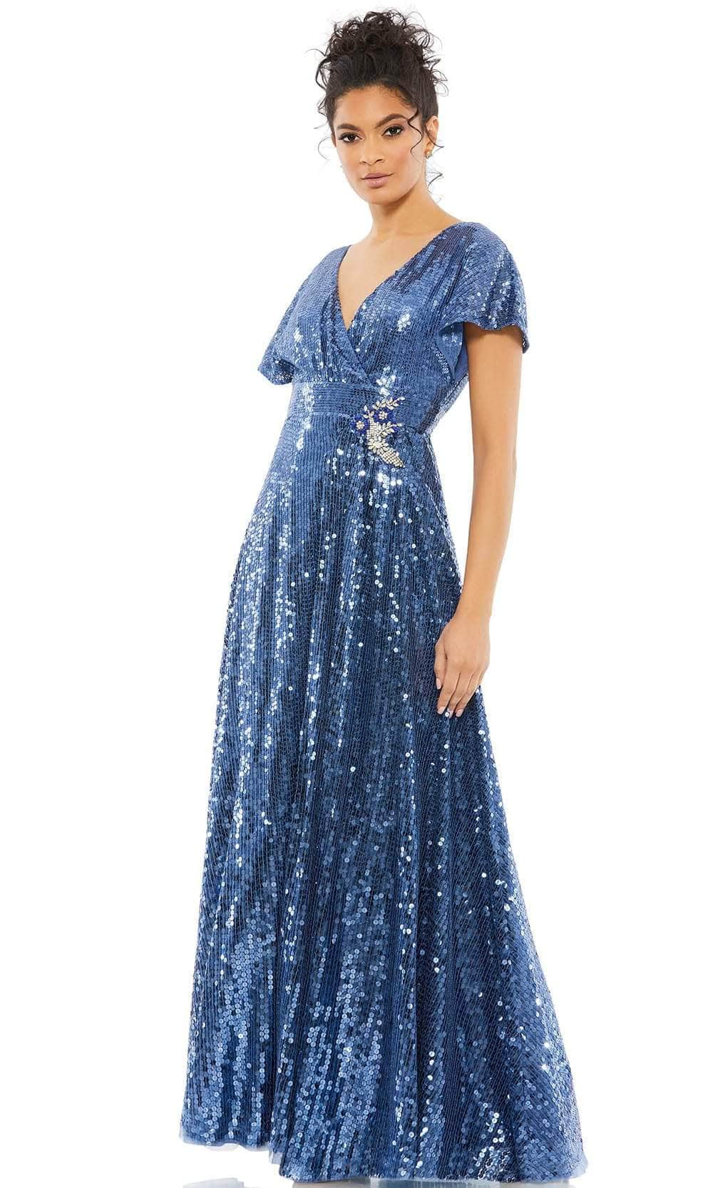 Keep things stylish in this fascinating Mac Duggal 10773 creation. Streaming with iridescent sequin accents, this gown features a v-neckline with flutter sleeves. Accented with a bejeweled brooch detail on a nipped empire waist, the adorned A-line skirt spills into a floor length hem. Illuminate the night in this Mac Duggal masterpiece. Exquisite attention to detail is the hallmark of Mac Duggal dresses. Mac Duggal dresses encapsulate the very essence of the women who wear them, reflecting their confidence, feminine power, and inner beauty.