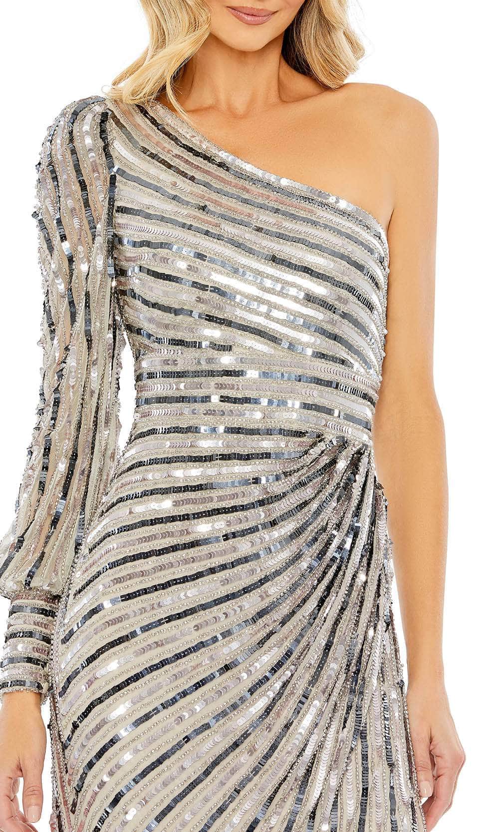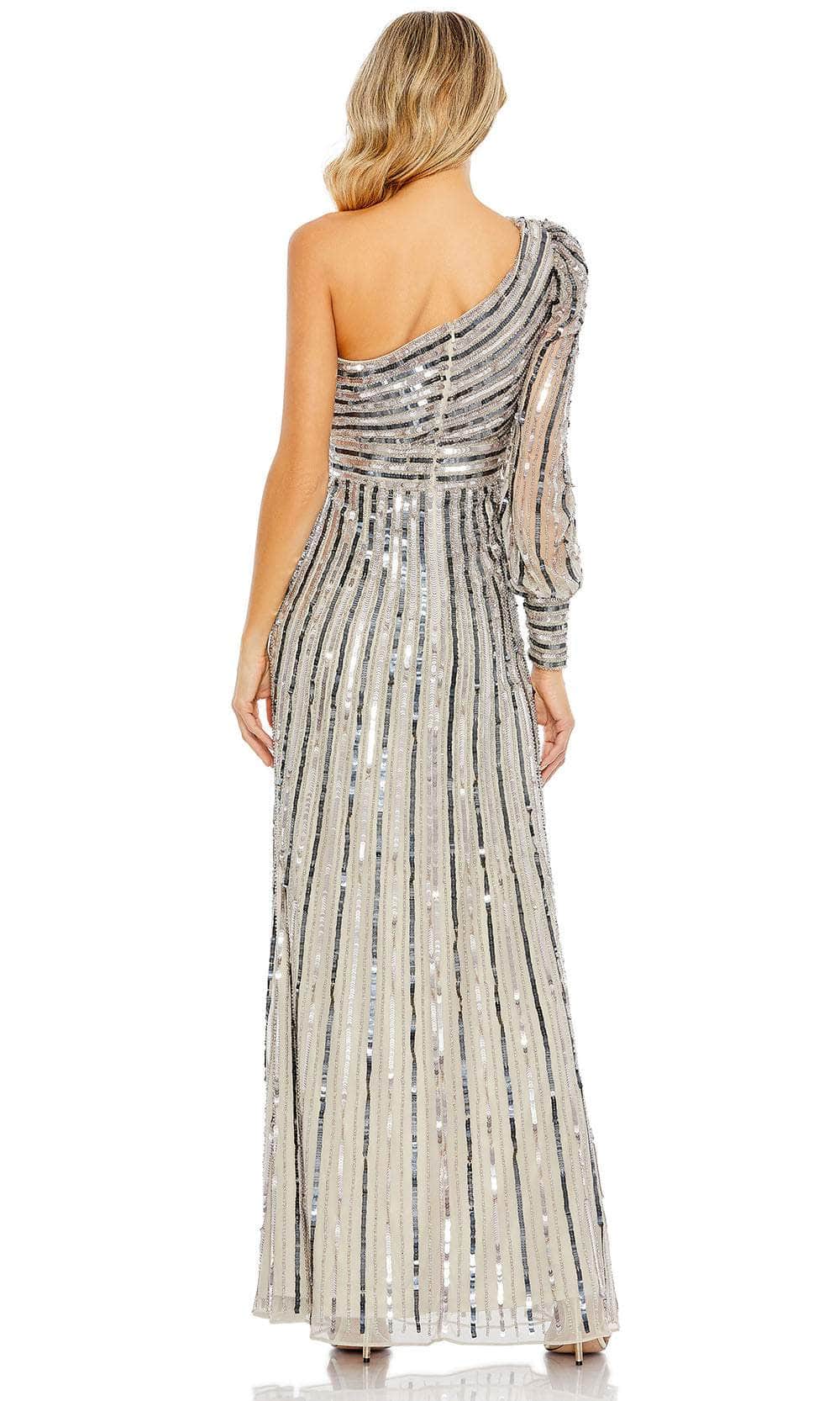 Make a grand entrance in this luxurious Mac Duggal 10793 masterpiece. This one-shoulder gown is adorned with a striped pattern of sequins and beadwork, capturing and reflecting light with every movement. The long bishop sleeve adds an elegant touch, while the asymmetric neckline mirrors the mid-open zippered back. A thigh-high slit on the side will show off your killer legs. The skirt parades a sheath silhouette that embraces your shapes and spills in a full-length hemline. For any special occasion, this Mac Duggal 10793 gown is absolutely a must-have. Model is wearing Platinum color.