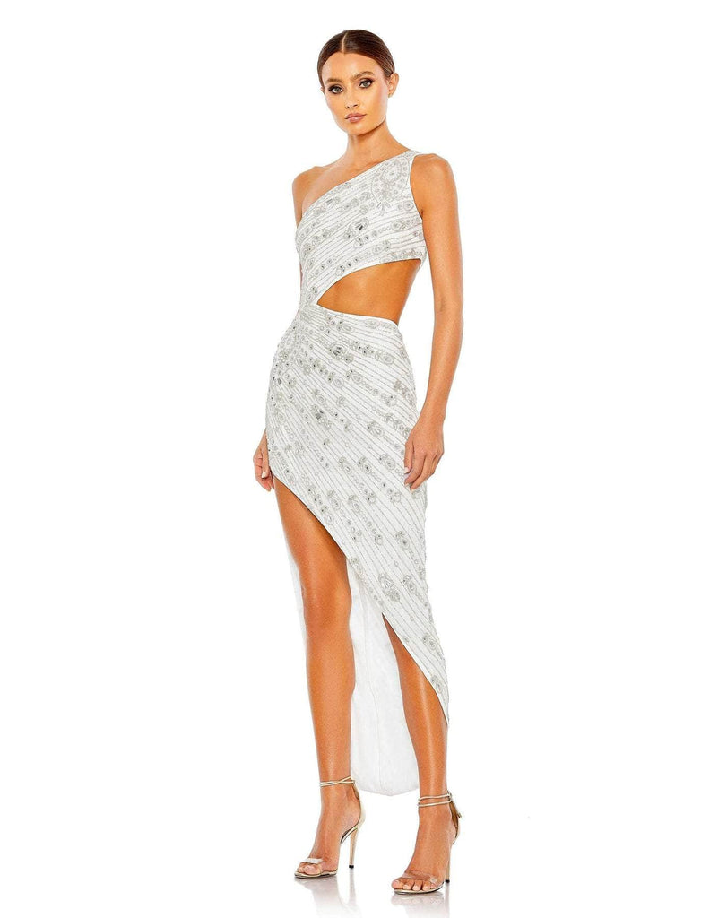 Wearing this Mac Duggal Couture 10880 dress will undoubtedly draw an admiring look as you enter the room. This rhinestone embellished bodycon dress has an asymmetrical neckline and an angular cutout at the side to highlight a keyhole detail that shows off your waistline curve, which is further accentuated by a high slit to show off your long, sexy legs. Magnify your best features and dazzle the crowd in this Mac Duggal 10880 exclusive. Model is wearing Black and White color
