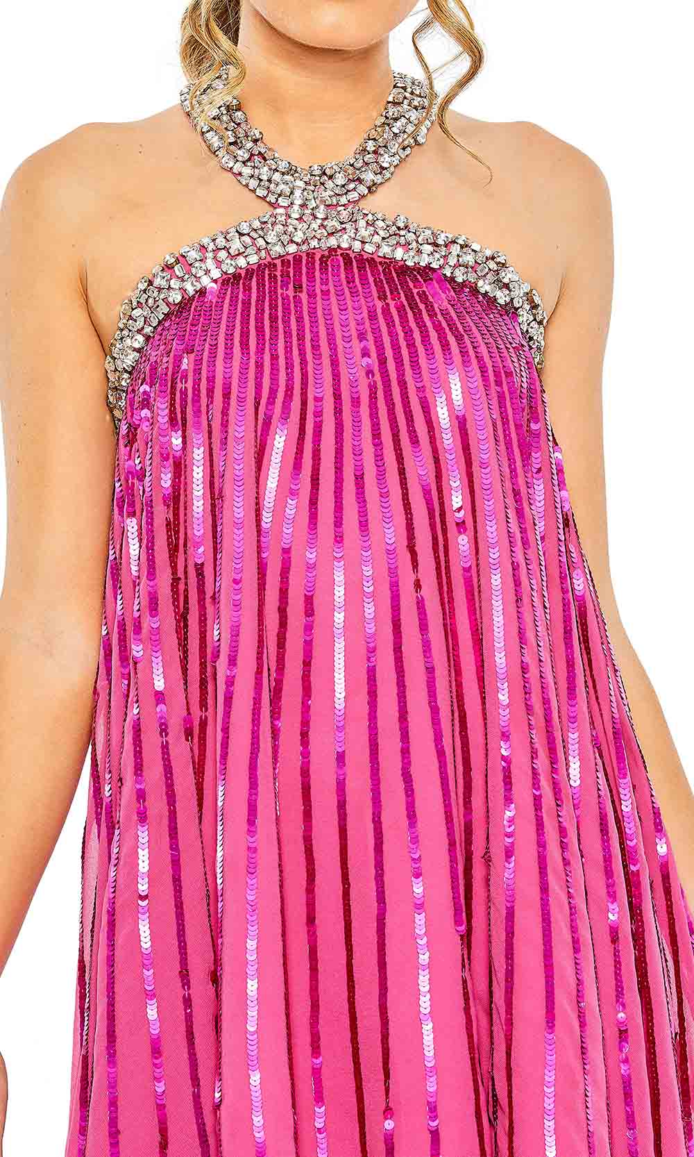 You will definitely shine all night long as you enter the room in this Mac Duggal 10996 creation. The sleeveless dress is absolutely stunning, with vertical striped sequins embellishment and a rhinestone accent. The top features a halter neckline, cut-in shoulders and a sultry backless style. A flowy skirt creates an A-line silhouette that ends at the mid-thigh hem, exposing your flirty legs. Go girl and celebrate! Have fun in Mac Duggal 10996 cocktail dress. Models are wearing the Gold, and Hot Pink colors.