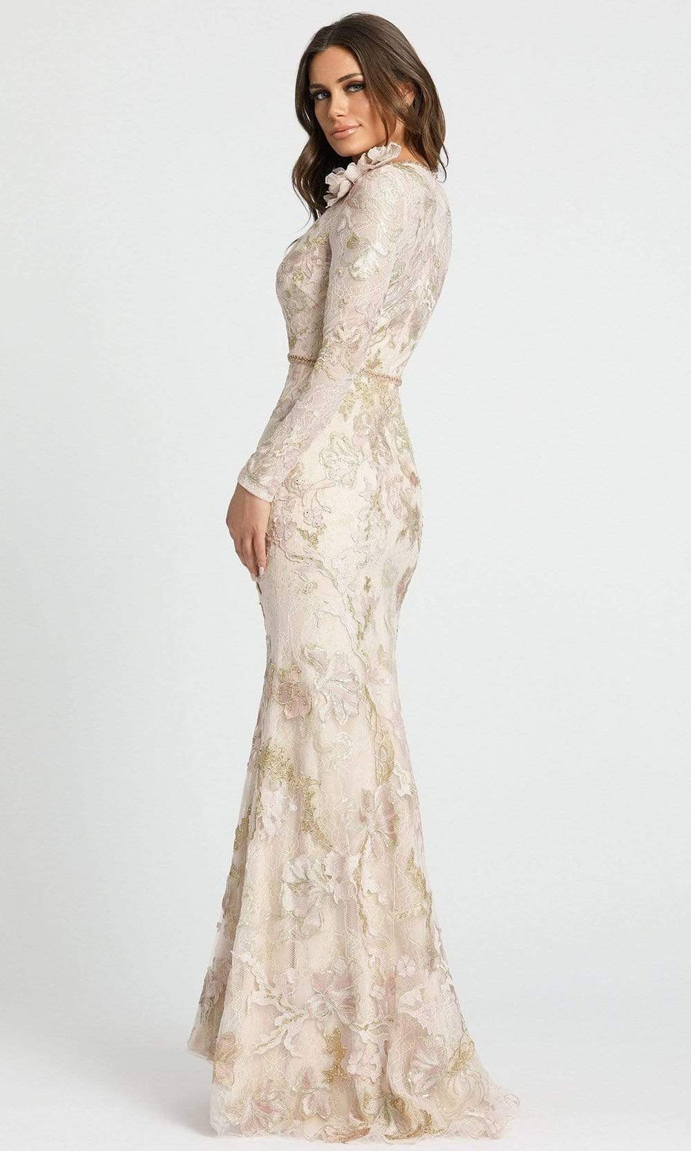 Saunter into the ballroom in style in this Mac Duggal 11174 creation. Shimmering with sequins on a floral lace silhouette, this piece has a jewel neckline, a floral applique and long sleeves. The skirt is crowned with a beaded waistband before flowing into a mermaid silhouette. Radiate utter opulence in this magnificent Mac Duggal masterpiece. Find more mother of the bride dresses.