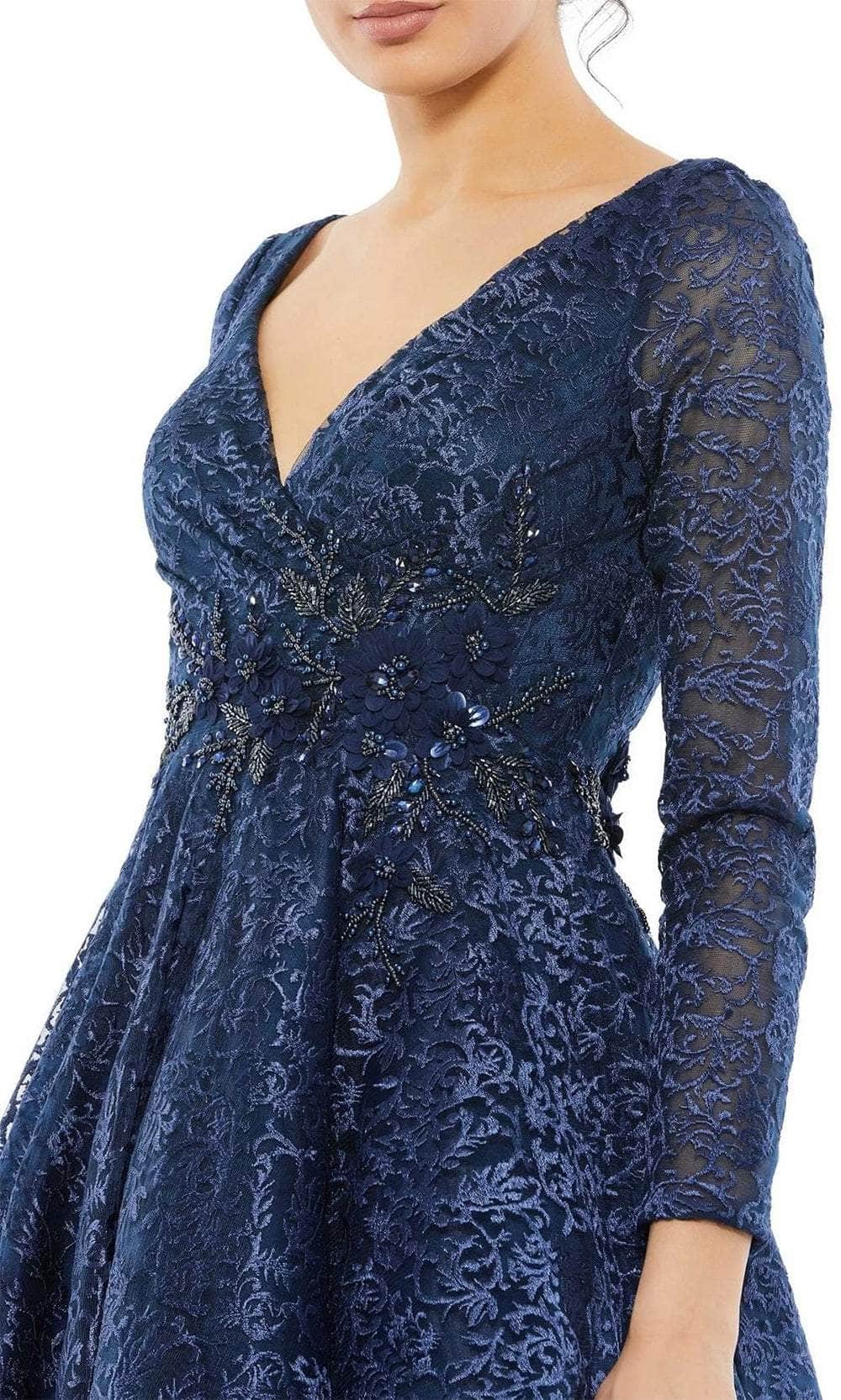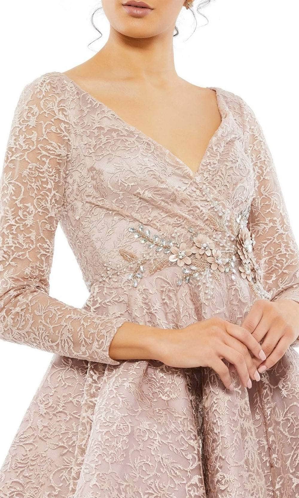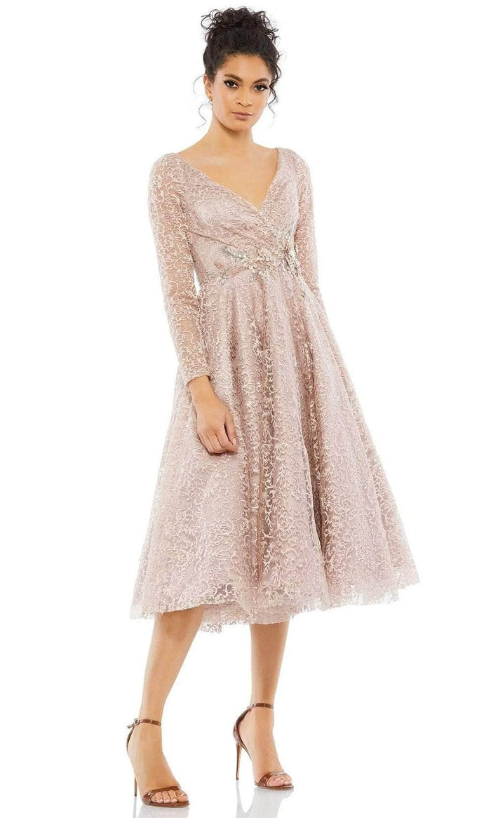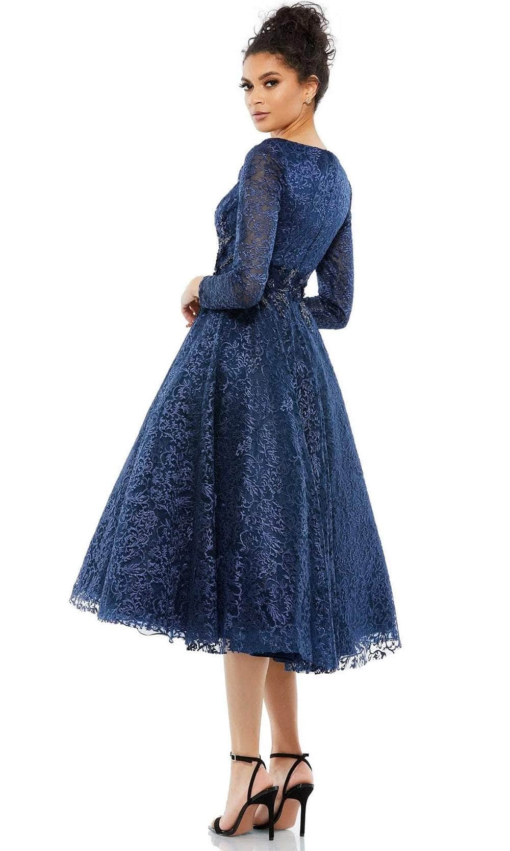 Embody timeless elegance in the captivating Mac Duggal 112181 masterpiece. This tea-length dress flatters your form with a tailored lining meticulously adorned with swirling lace, ensuring you radiate sophistication with every step. The surplice bodice with a deep V-neckline flatters your figure, while the sheer long sleeves add a touch of ethereal mystery. Three-dimensional floral details and beaded appliques adorn the bodice and waist, creating a captivating textural dimension. The A-line skirt gracefully flares into a below-the-knee hem, making it perfect for weddings, garden parties, or any event demanding a touch of understated glamour. Step into a world of elegance with our exquisite Mac Duggal 112181 creation. Models are wearing the Nude and Midnight colors.
