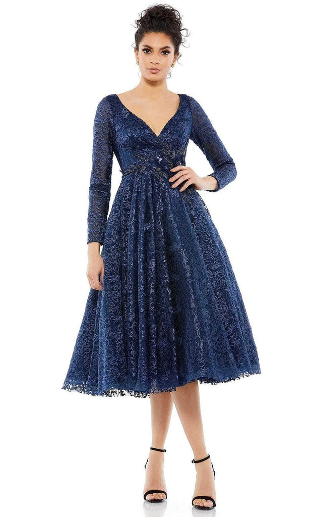 Embody timeless elegance in the captivating Mac Duggal 112181 masterpiece. This tea-length dress flatters your form with a tailored lining meticulously adorned with swirling lace, ensuring you radiate sophistication with every step. The surplice bodice with a deep V-neckline flatters your figure, while the sheer long sleeves add a touch of ethereal mystery. Three-dimensional floral details and beaded appliques adorn the bodice and waist, creating a captivating textural dimension. The A-line skirt gracefully flares into a below-the-knee hem, making it perfect for weddings, garden parties, or any event demanding a touch of understated glamour. Step into a world of elegance with our exquisite Mac Duggal 112181 creation. Models are wearing the Nude and Midnight colors.