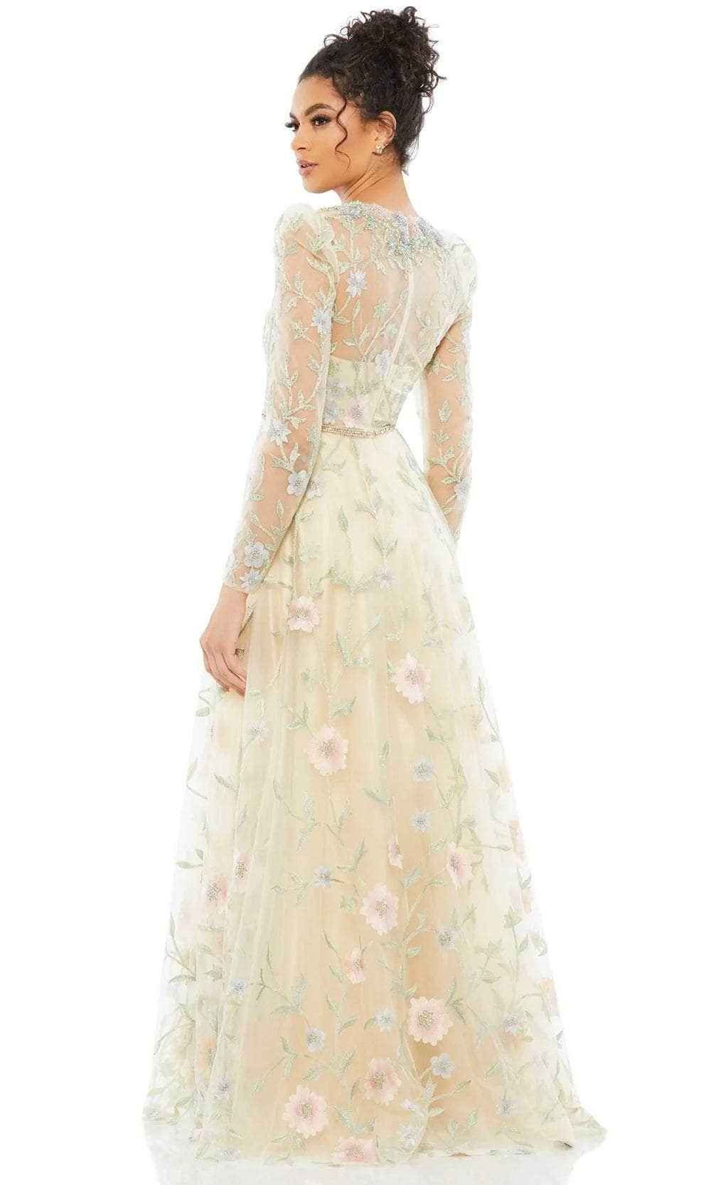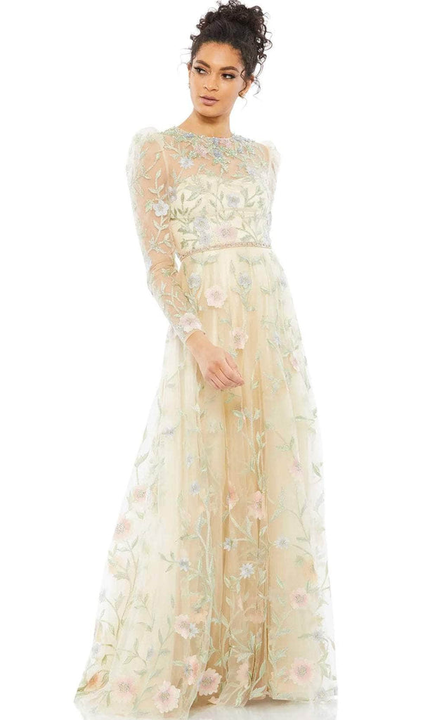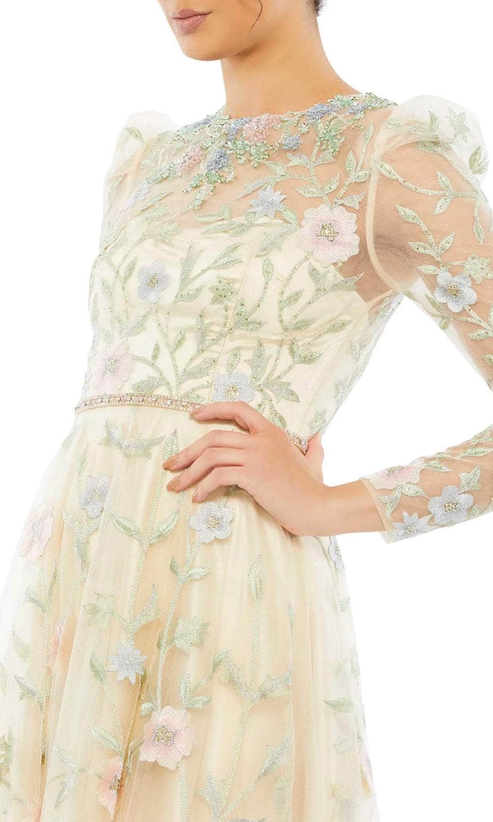 You will be an enchanting beauty while wearing this Mac Duggal 11226 masterpiece. This gorgeous gown is tailored in floral embroidered mesh overlay fabric and showcases an illusion high neckline with sheer puff long sleeves and rhinestone detail at the waistband. The floral appliques are adorned by heat-set jewel encrusted embellishments, while the A-line skirt ends in a floor-length hem. Appear in elegance in this Mac Duggal 11226 masterpiece. Model is wearing a Nude color.
