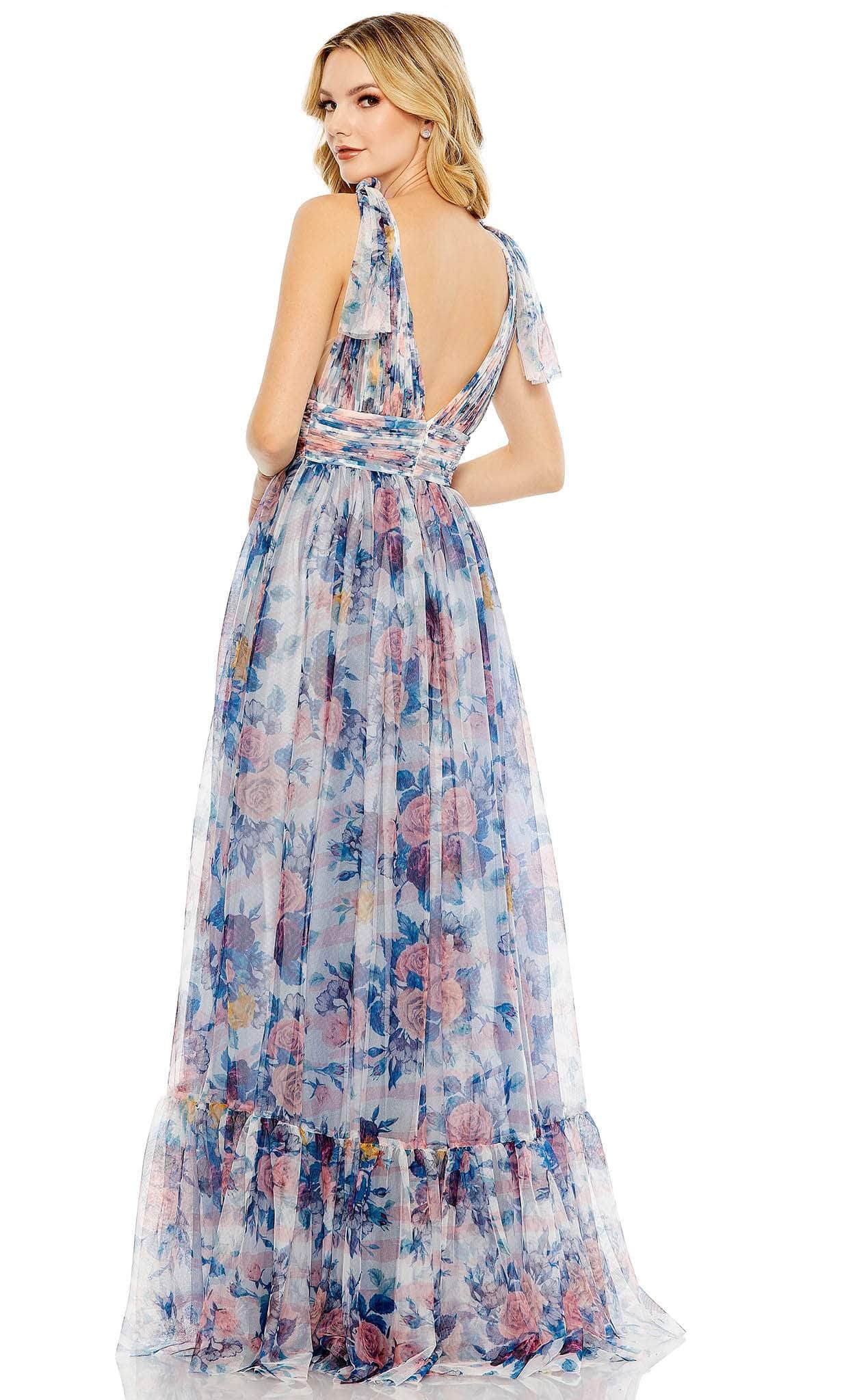 Be the delight of everyones eyes in stunning Mac Duggal 11332 dress. This fully lined dress features a flattering V-neckline, sleeveless design, and concealed back zipper for a seamless finish. The tiered ruffled skirt is the perfect complement to the ruched waistband, which sits at the empire waist for a flattering silhouette. The beautiful floral print is accentuated by charming bow appliques on the shoulder, making this dress perfect for any occasion. This Mac Duggal 11332 masterpiece will definitely bring out the Queenly in you! Model is wearing the Blue Multi color.