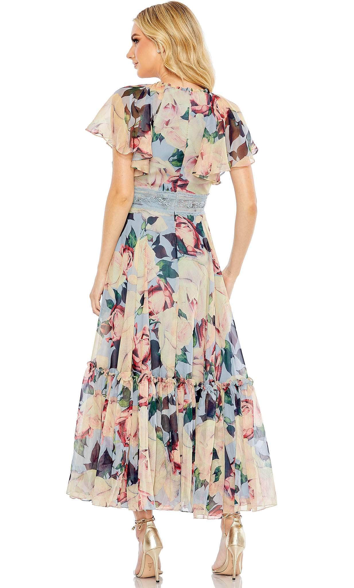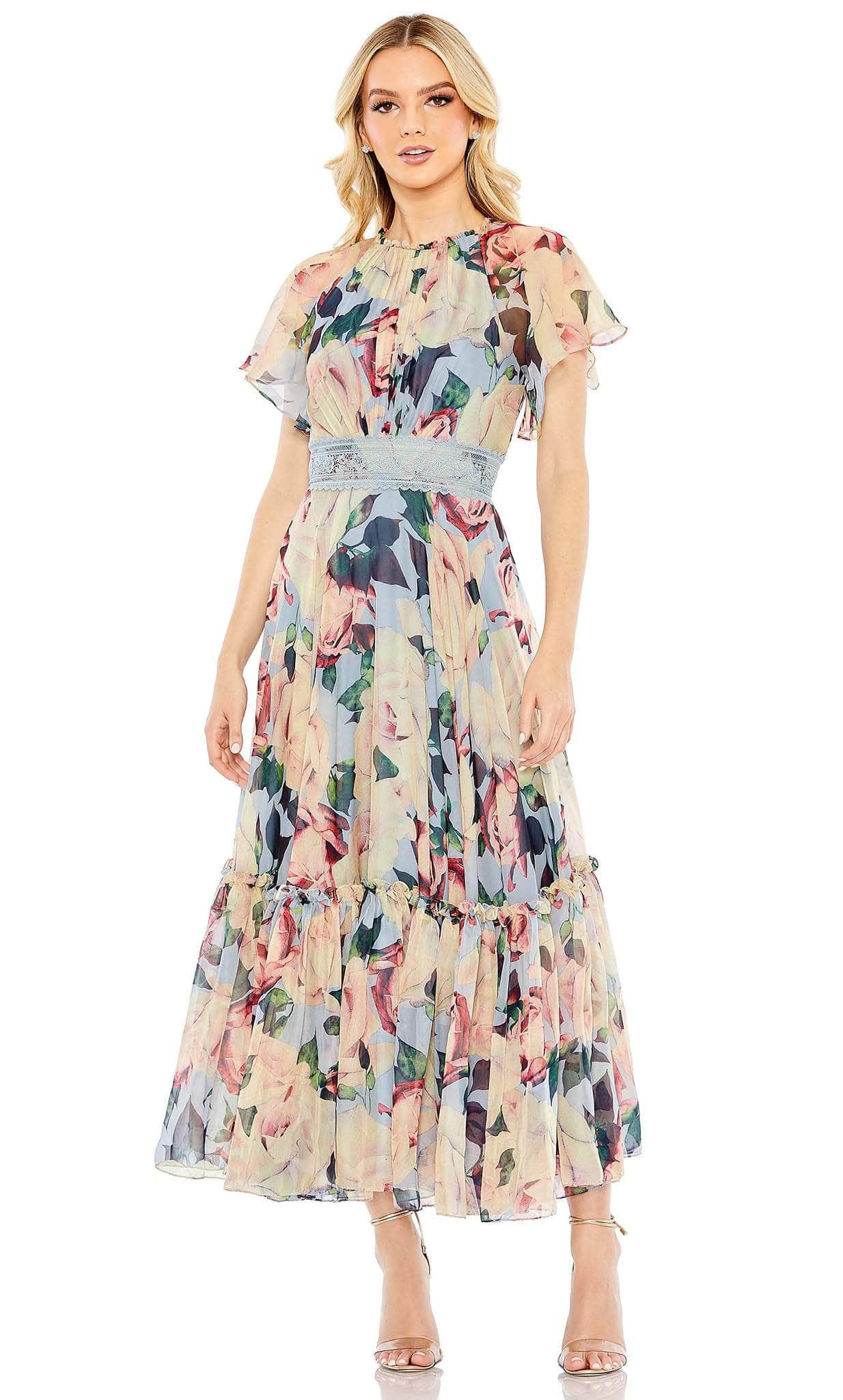 This Mac Duggal 11400 with a unique style brings a sophisticated, classy, and elegant look. Fashioned in a floral printed dress, this piece displays short flutter sleeves with a high neckline. An embroidered lace waistband cinched the waistline. The pleated detail skirt flares out to a tea-length hem while the back is fully enclosed and secured with a center zipper closure. Make all of your luscious dreams come true with Mac Duggal 11400 masterpiece. Model is wearing Blue Multi Color.