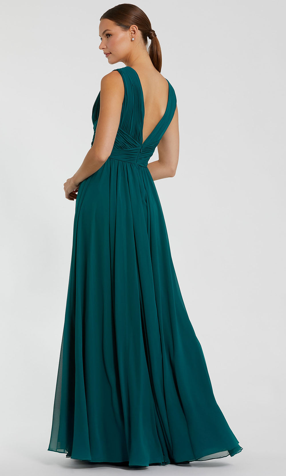 The unmistakable glamour of the Mac Duggal 11585 gown leaves a lasting impression from the first moment you enter the room. Its striking plunge neckline introduces a perfectly ruched bodice that flatters and elongates the figure, while the crisscross wide waistband shapes a romantic hourglass profile. Flowing into a grand A-line skirt, the silhouette moves with effortless fluidity and grace. Every detail of the Mac Duggal 11585 radiates sophistication and red-carpet confidence, ideal for black-tie occasions or luxurious celebrations. Model is wearing Teal color.