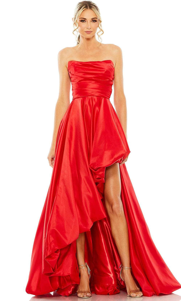 Amplify your style with Mac Duggal 11685, a captivating strapless gown that will leave a lasting impression. Crafted from lustrous satin fabric, this lovely piece showcases a beautifully ruched bodice, exuding elegance, and sophistication. The straight-across neckline accentuates your shoulders and décolletage, while the natural waistline flatters your figure. With a back zipper closure, this gown ensures a seamless fit. The full-length skirt gracefully glides, revealing an alluring asymmetrical high-low hemline, adding a touch of modernity. Mac Duggal 11685 will leave a lasting impression. Model is wearing Red color.