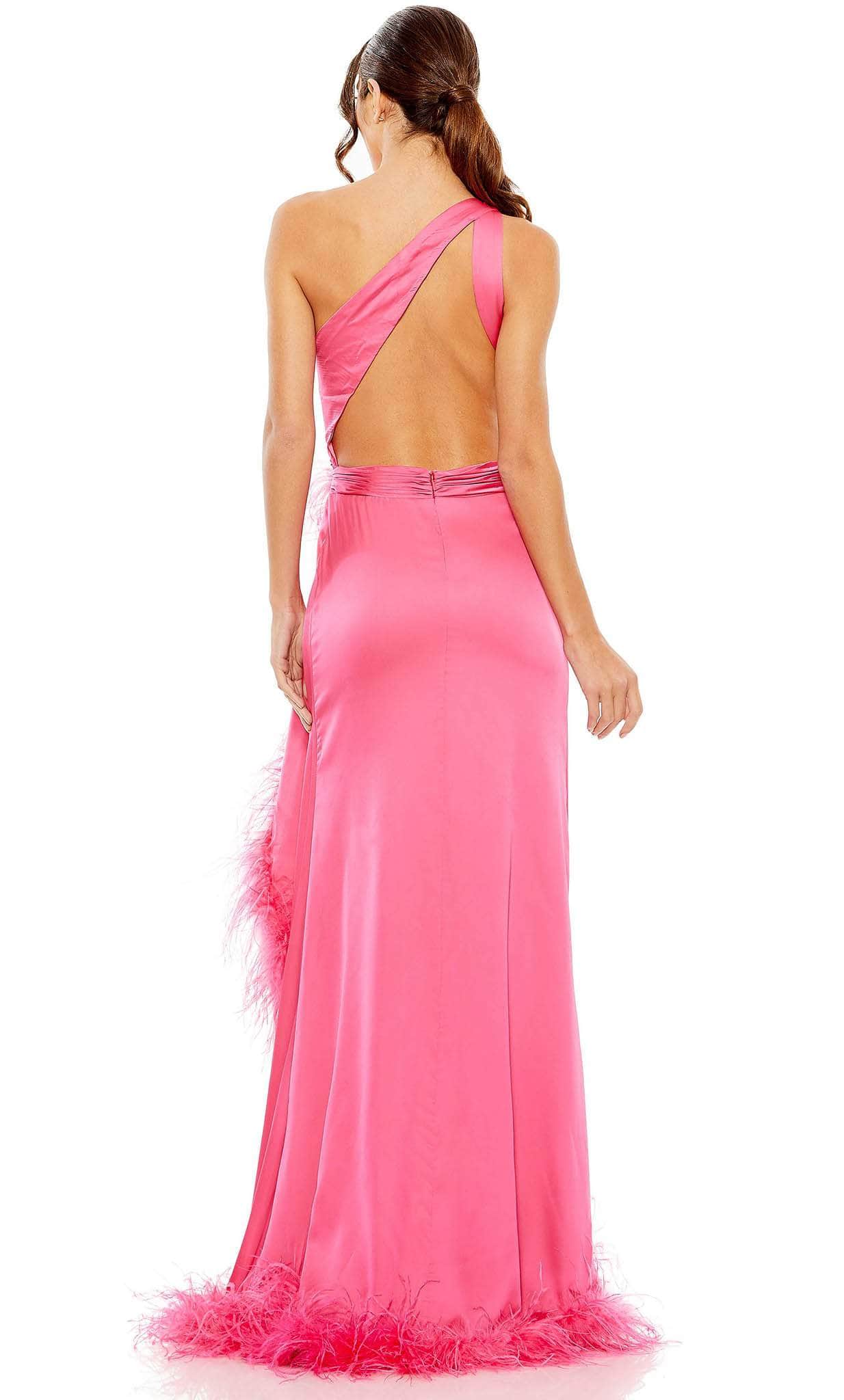 In this simple yet chic dress from Mac Duggal 11689, you will absolutely look classy and elegant. This winning piece flaunts an elegant one-shoulder sleeve, which is beautifully tailored from satin fabric. It has an asymmetrical neckline and an open back. The bodice has a unique side cut-out that brings prominence. With a sheath silhouette that is embellished with feathers, this gorgeous dress is sure to turn heads. Look incredibly stunning in Mac Duggal 11689 masterpiece. Models are wearing Hot Pink and Lime colors.