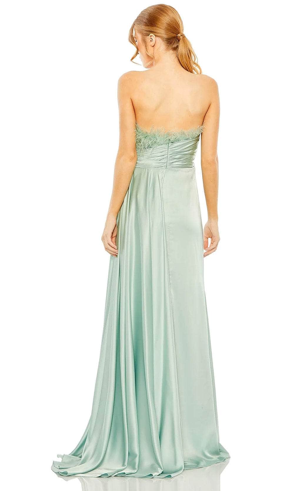 Brave the evening with temptress gorgeousness and poise by wearing this Mac Duggal 11690 masterpiece. The gown strapless design allows you to showcase your shoulders beautifully, and the straight across neckline has soft feathers for a glamour touch. The open detailing at the back exposes a sight of your skin, with a zipped-up closure for a great fit. Ruched design on the bodice elevates your curves. Heightened with the side drape and thigh-high slit, the skirt finishes in an A-line silhouette that hits the floor sweeping train. This Mac Duggal 11690 creation is ideal for making a fashionable entrance at any event. Model is wearing SeaFoam color.