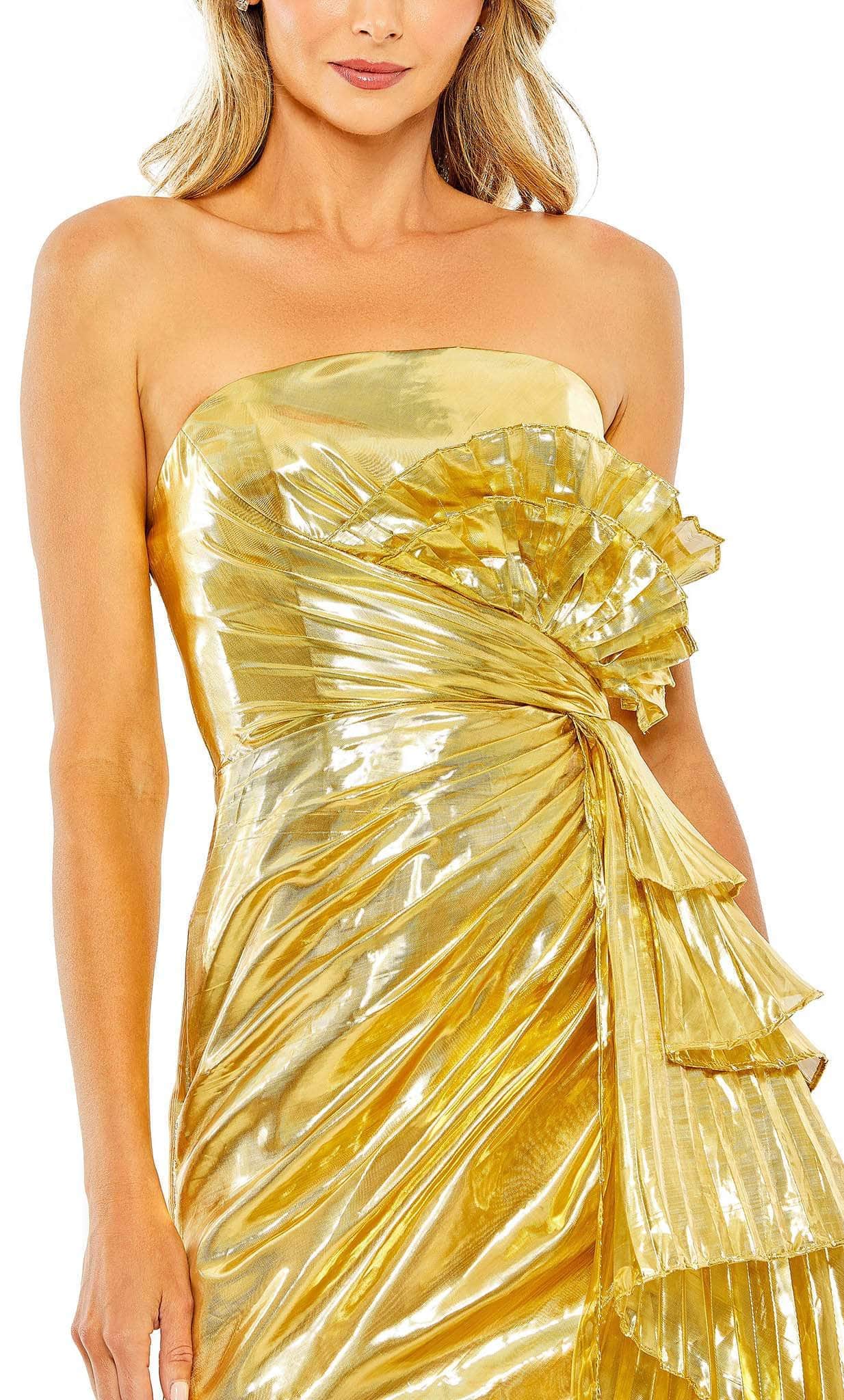 Make it your birthright to shine on the dance floor when you showcase this stellar Mac Duggal 11695 creation. Crafted with a structured bodice that flaunts the feminine form, this alluring piece reveals a draped spectacle of metallic organze on its strapless silhouette. Forming a modified straight across neckline, a ruched floral details accents the bodice as the sash flows into a cascading spill to the floor. The sheath skirt is ornamented with gathered ruching that adds drama to the ensemble. Look ravishing from all angles in this opulent Mac Duggal masterpiece. Models are wearing the Lilac and Gold colors.