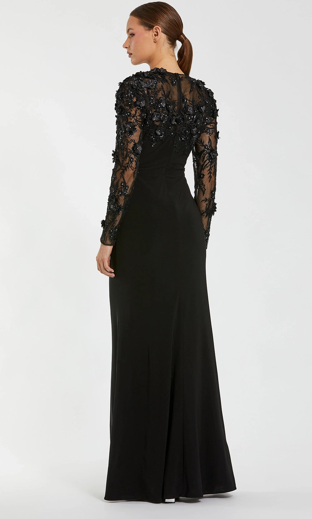 Capture all eyes with the Mac Duggal 11841 gown that radiates presence and sophistication. It flaunts an illusion high neckline with cascading 3D floral applique and beading that extends across the sleeves, bringing texture to the upper silhouette. Sheer long sleeves add graceful volume while the sleek column skirt flows from a naturally fitted waist. This look marries modern drama with timeless elegance in a refined way. Let the Mac Duggal 11841 complete your evening with distinction and charm in every movement. Model is wearing Black color.