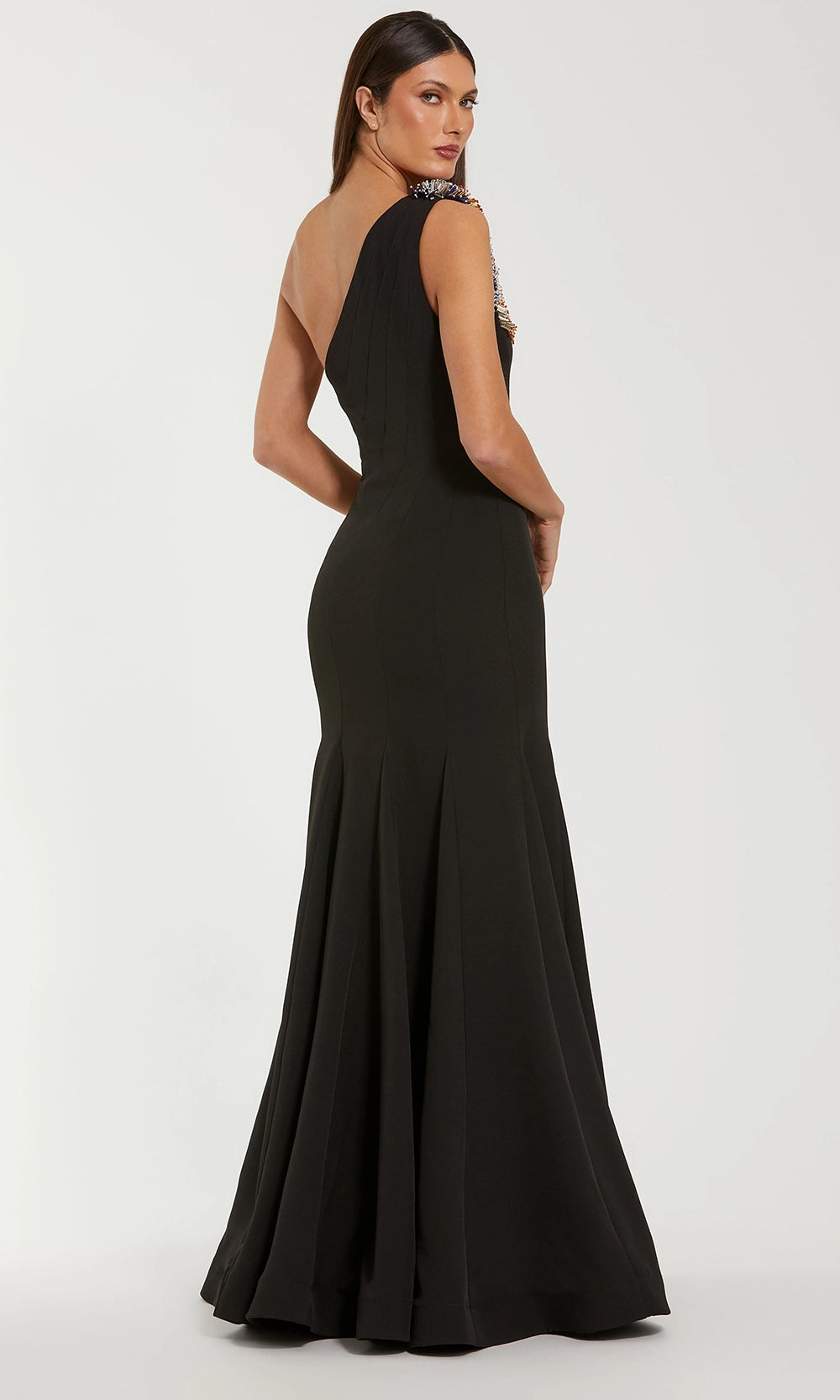 True sophistication reveals itself in this Mac Duggal 11843 gown that combine bold design with timeless elegance. This one shoulder silhouette makes an immediate statement, with an asymmetric neckline that balances strength and femininity. A dramatic hand-beaded embellishment on the shoulder creates an artistic focal point that elevates the overall design. The fitted bodice transitions into a trumpet shape, flowing with sculpted precision. Every element works together to embody elegance and confidence. The Mac Duggal 11843 is the gown of choice for evenings where style must leave an enduring mark. Model is wearing Black Multi color.