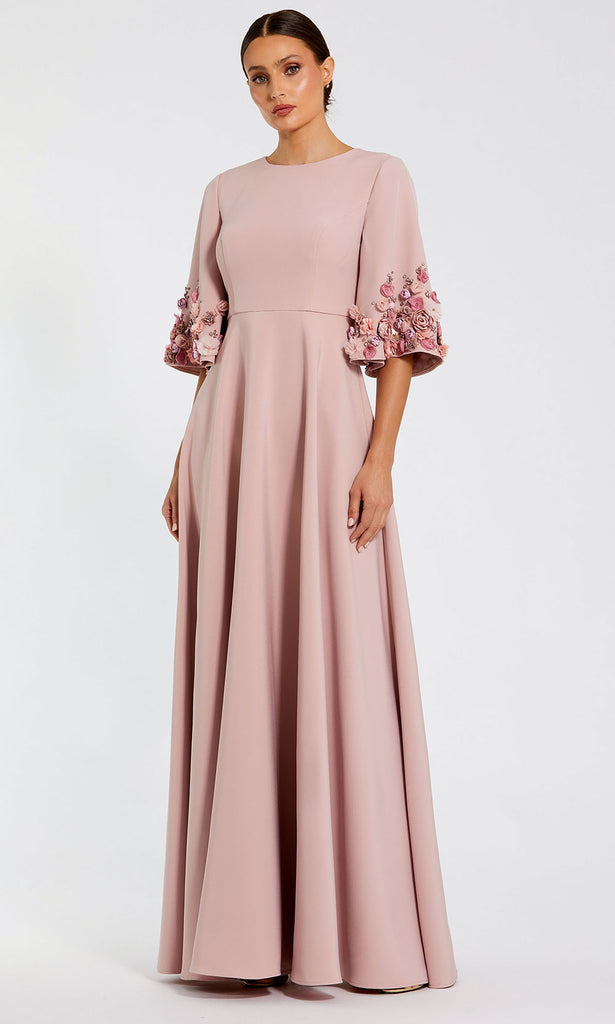 Soft structure meets blooming charm in this Mac Duggal 11854 romantic gown that feels both regal and refined. It captivates with sculptural three-quarter bell sleeves adorned in dimensional floral accents that add depth and texture. A fitted bodice and natural waist transition into a fluid A-line skirt that glides with grace. The jewel neckline keeps the look polished, while the floor-length hem enhances its timeless appeal. Mac Duggal 11854 gown is a perfect choice for any elevated occasion that calls for a graceful and artistic expression of style. Model is wearing Rose color.