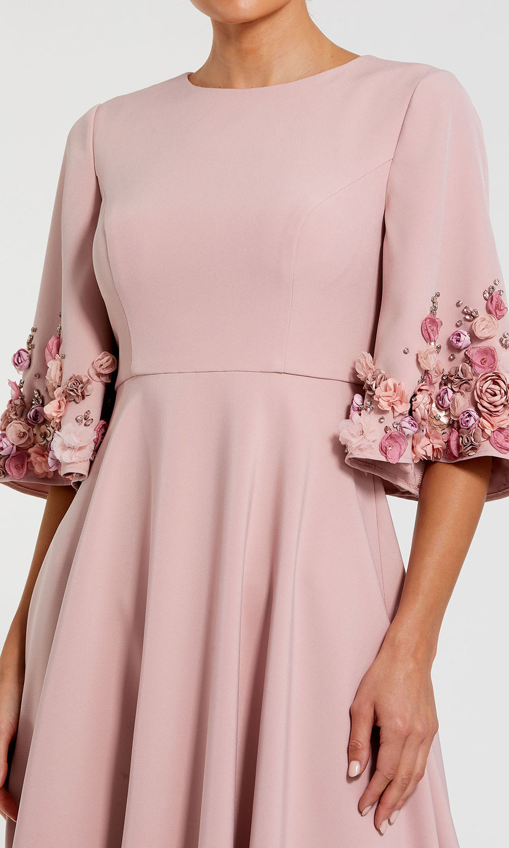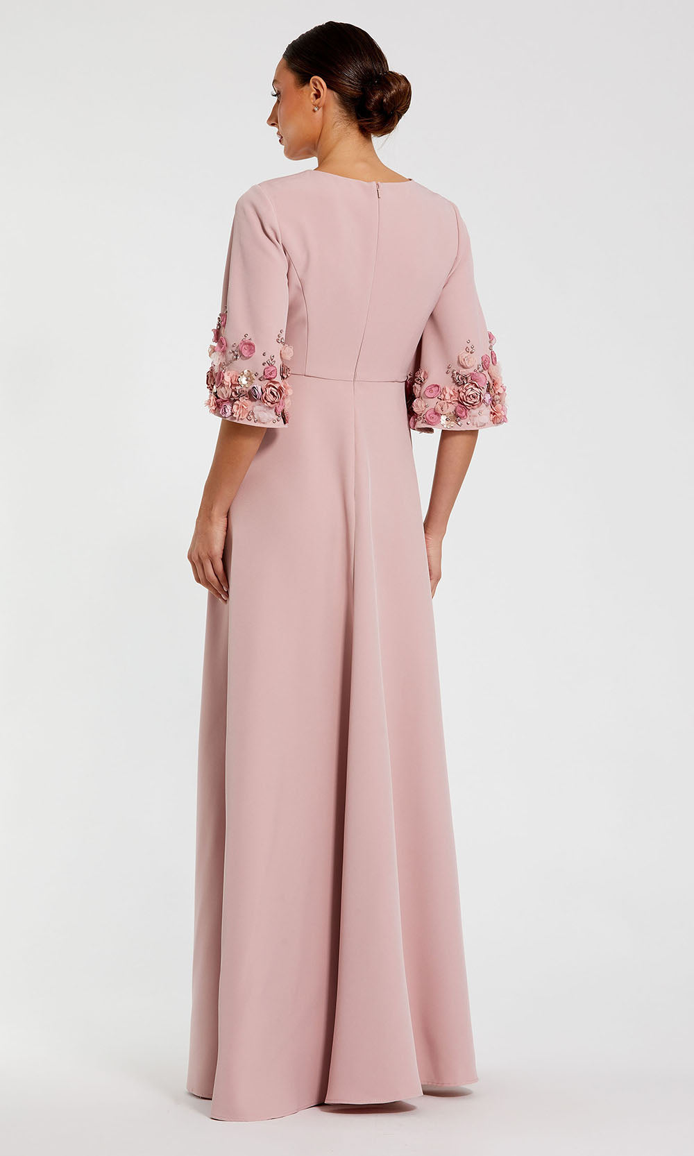 | Details: | Three-Quarter Bell Sleeves, 3D Floral Appliques, Full Back, Concealed Back Zipper |