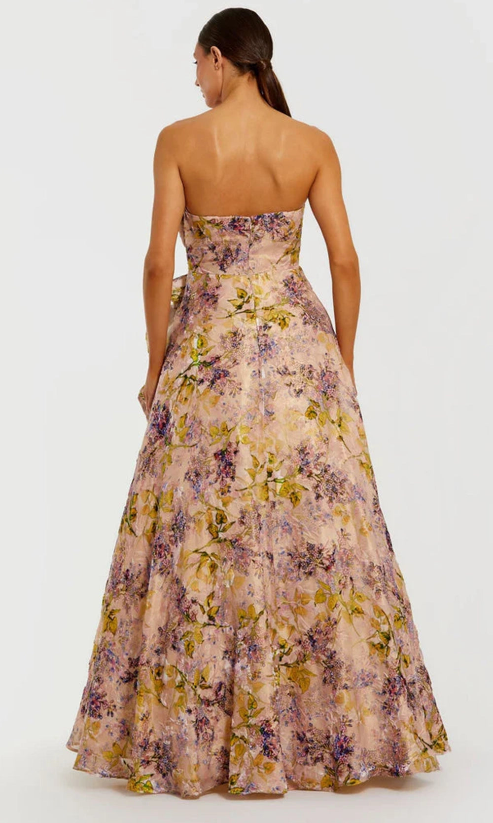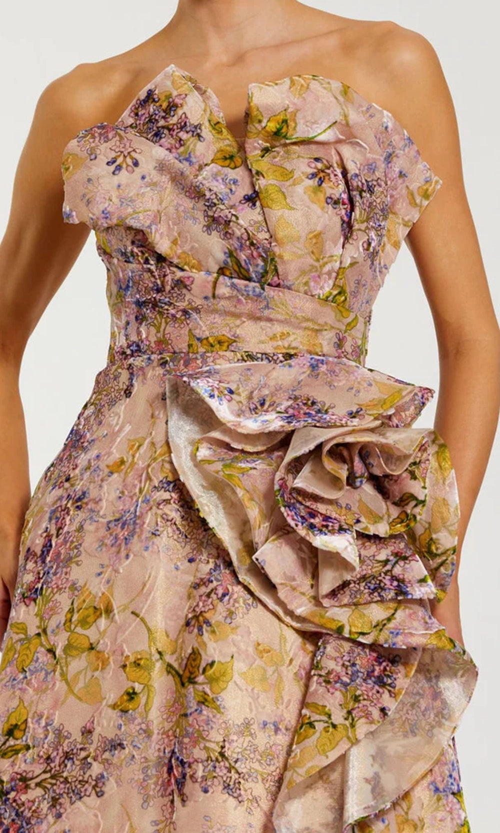 | Details: | Strapless, Cascading Ruffle Detail, 3D Rosette Accent, Floral Pattern, Mid-Open Back |