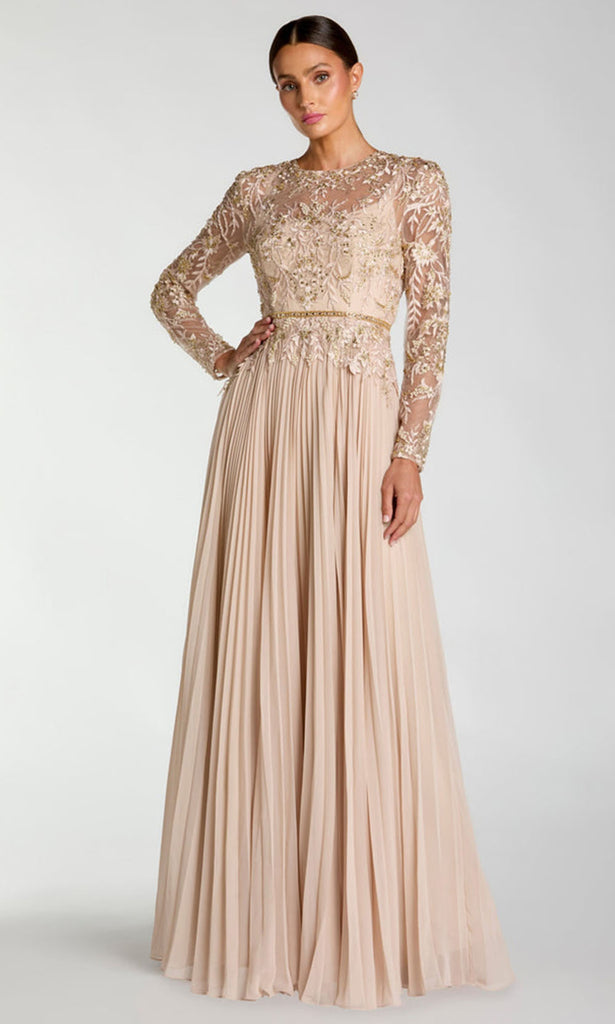 Precision tailoring and textural detail combine in Mac Duggal 11986, a gown that embodies timeless luxury. The illusion bodice is adorned with embroidered floral motifs and beading that continue seamlessly into the thin waistband. Long sleeves balance the silhouette, and the pleated A-line skirt flows with rhythm that complements movement. Each feature of Mac Duggal 11986 style unites balance, form, and light sophistication ideal for high-profile events or evening celebrations. Model is wearing Taupe color.