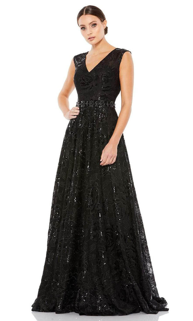 Shine through the night in this mesmerizing Mac Duggal 12413. Featuring luxurious rose-embroidered fabric, this sleeveless evening gown has a classy v-neckline and A-line silhouette. The skirt is adorned by a glittering lace overlay and a beaded waistband, in the same pattern as the bodice. Mac Duggal is perfect for a standout style and flawless fit.