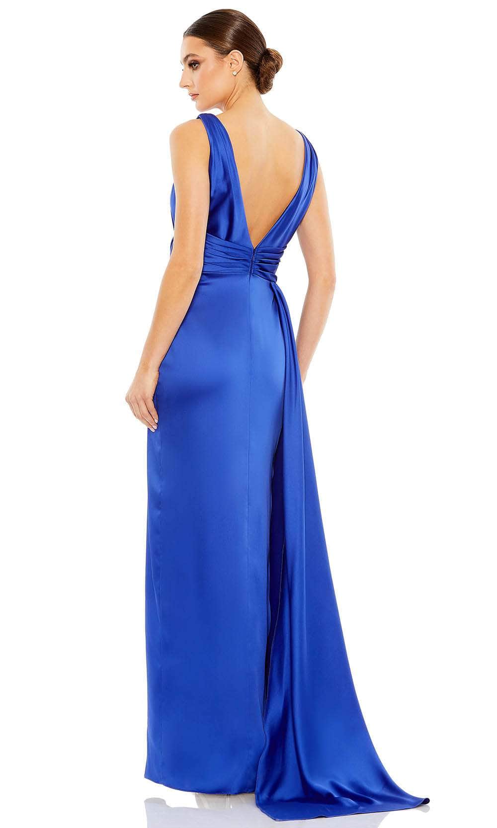 Walk in defined sophistication and beauty wearing this stunning Mac Duggal 12525. Gorgeously tailored from a silky satin fabric that has a magical radiant effect with?áits brilliant hue, this dress is perfect addition to your wardrobe. Features a V-neckline and back, with a ribbon tied waistband perfect for hiding flaws and emphasizing your contours. The skirt parts with a thigh high leg slit and pools with a small train for added elegance. Regale a romantic and alluring style in this Mac Duggal creation. Model is wearing the Royal color.