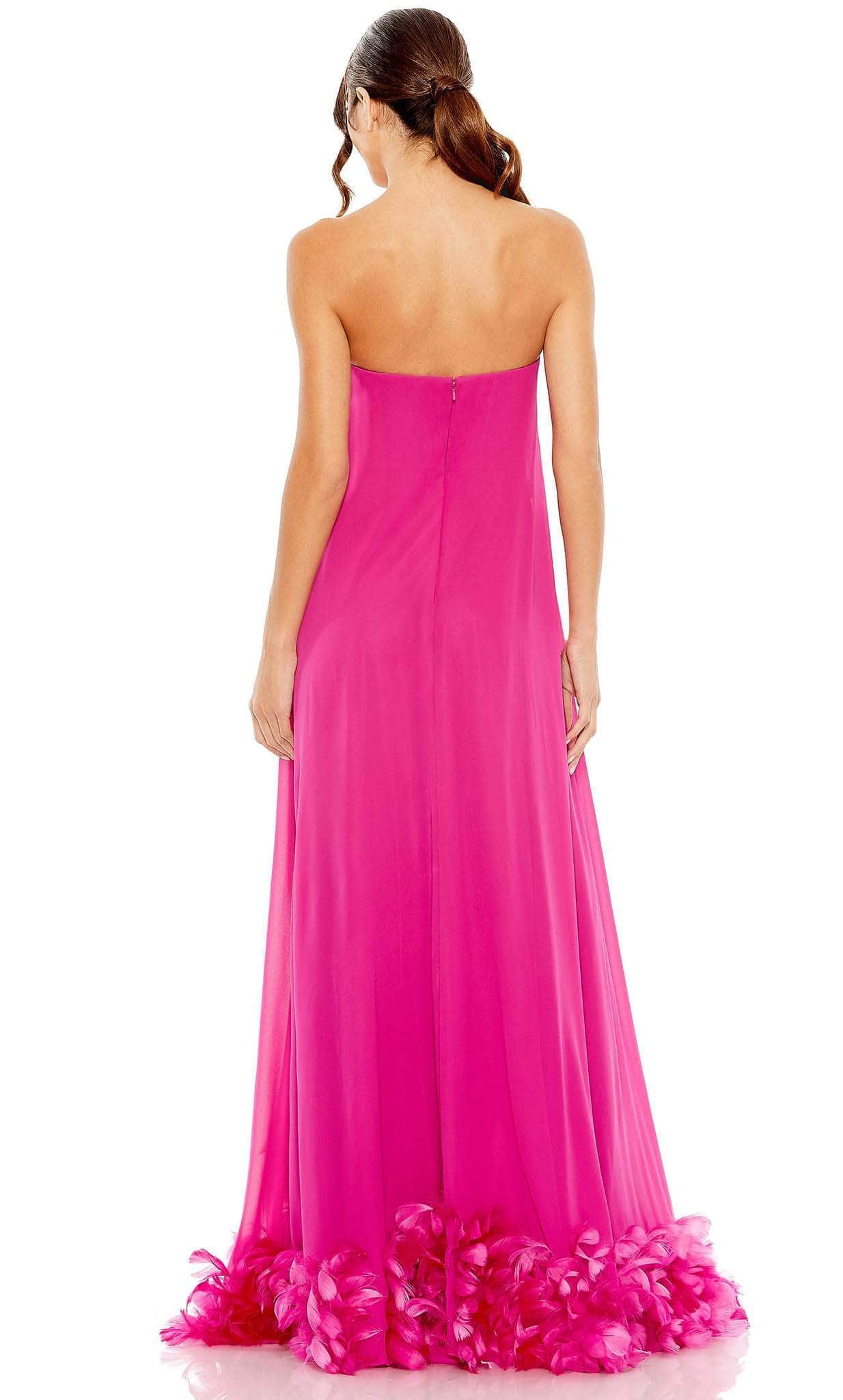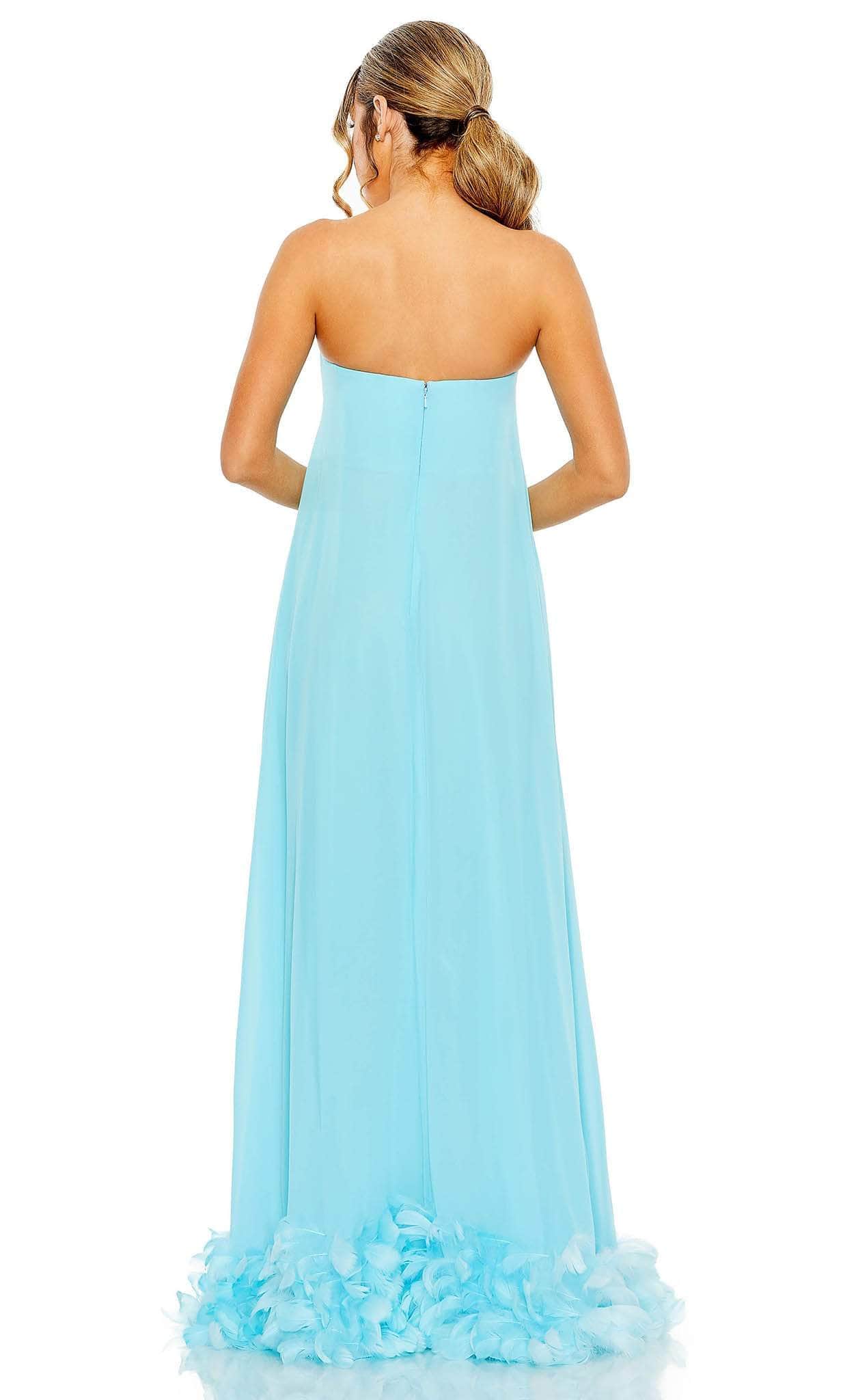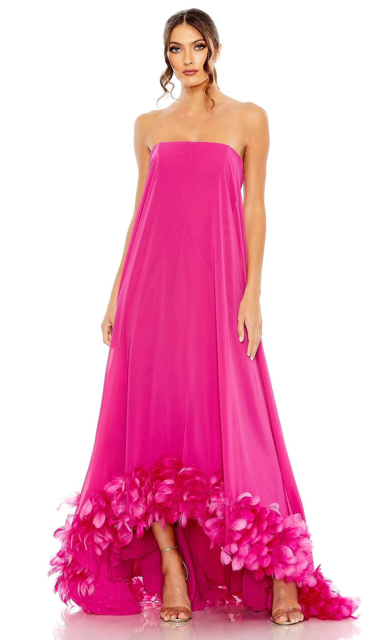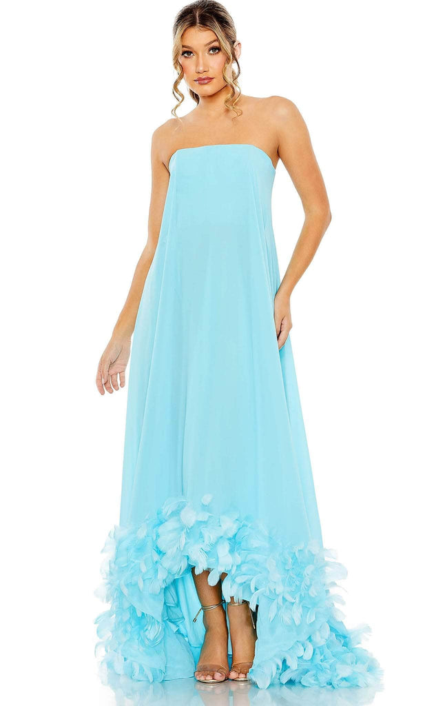 Dress up this lovely creation from Mac Duggal 13001. This stunning dress is expertly tailored on a crepe fabric and features a strapless bodice with a straight-across neckline. This winning piece looks sophisticated thanks to the feather-detailed high-low hemline. A center zipper closure on the mid-open back. This dress has an A-line silhouette and ends with a sweeping train. Steal the show and take the center stage in this Mac Duggal 13001 masterpiece. Models are wearing Aqua and Fuchsia colors.
