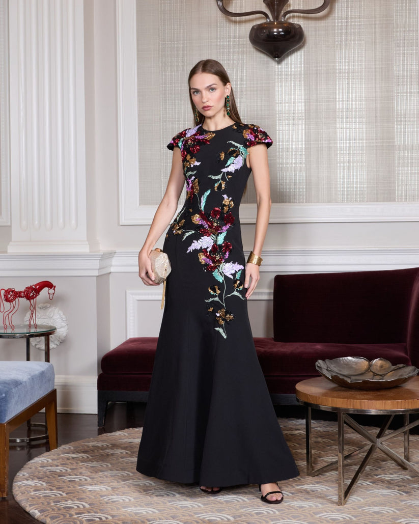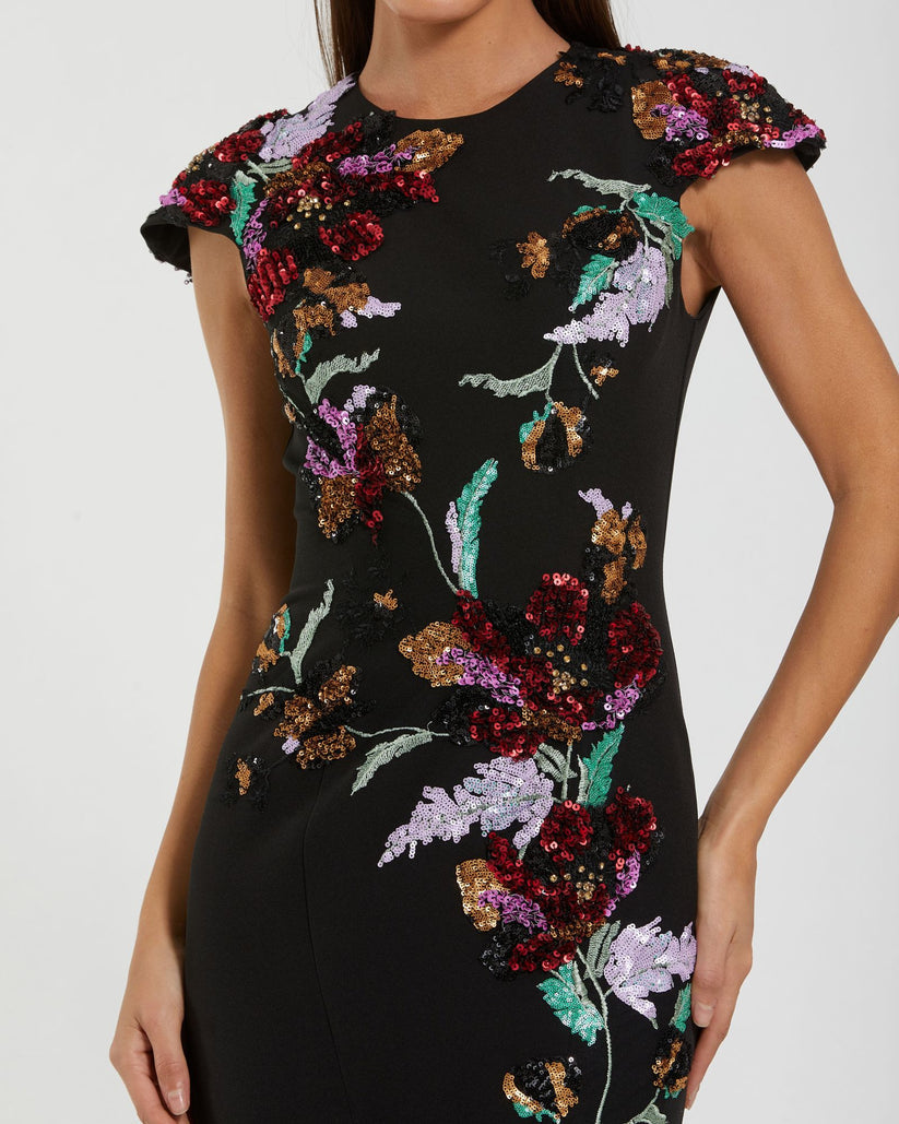 | Details: | Sequin Floral Embroidery, Cap Sleeves, Concealed Back Zipper, Sculpted Seams, Full-Length |