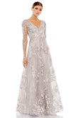 Show off your classy style when you wear this Mac Duggal 20245. This ethereal ensemble has a low v-neckline and long sleeves, sewn front sheer fabric and leafy appliques. The same embellishments of embroidery and applique appear throughout the bodice and the A-line skirt in a sheer overlay. This Mac Duggal creation is an absolute breathtaking look. Find more mother of the bride dresses.